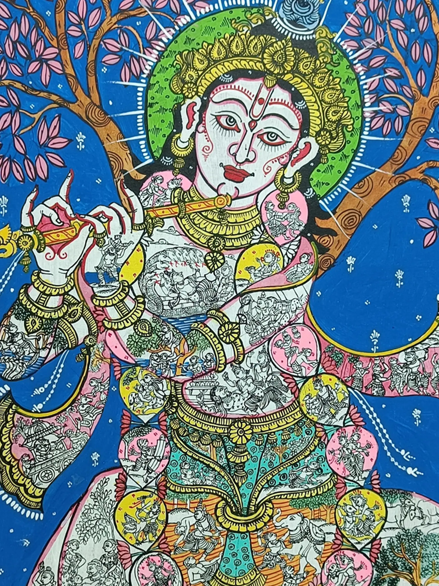 Sachikant's "Lord Krishna with Story" on handmade canvas is a unique masterpiece that stands as a testament to the undying tradition of Pattachitras. The exquisite portrayal captures the divine tribhanga murari image of Lord Krishna, playing the flute under a serene tree. The canvas tells a comprehensive story, as every inch of Krishna's body becomes a canvas for depicting his enchanting leelas.