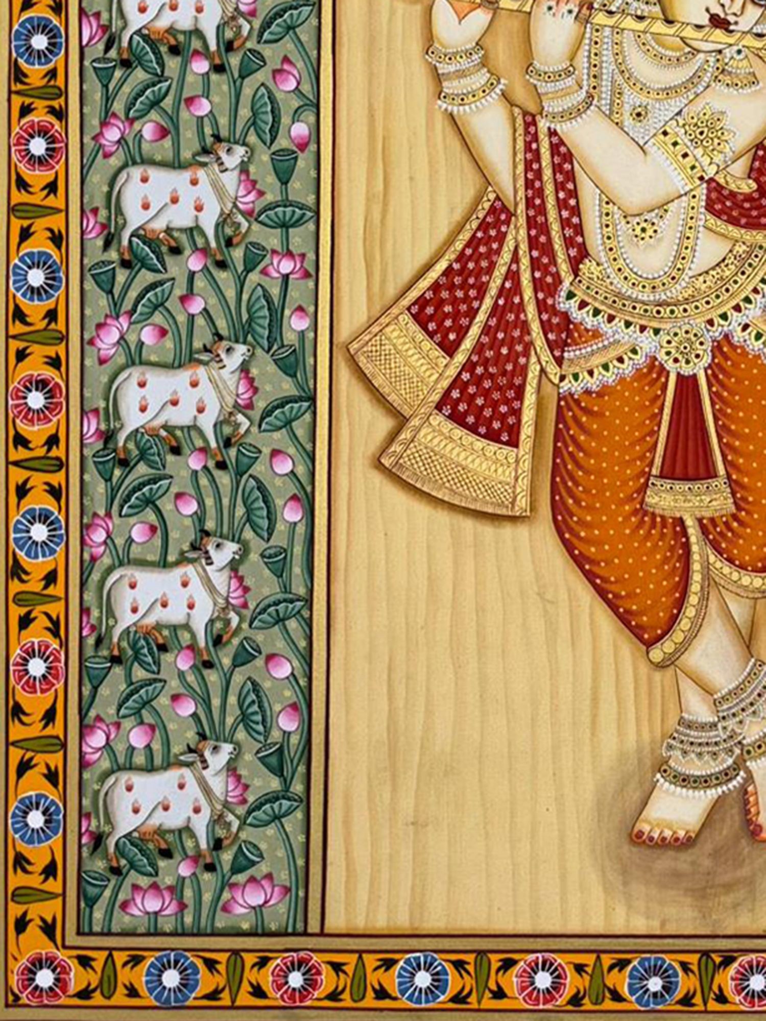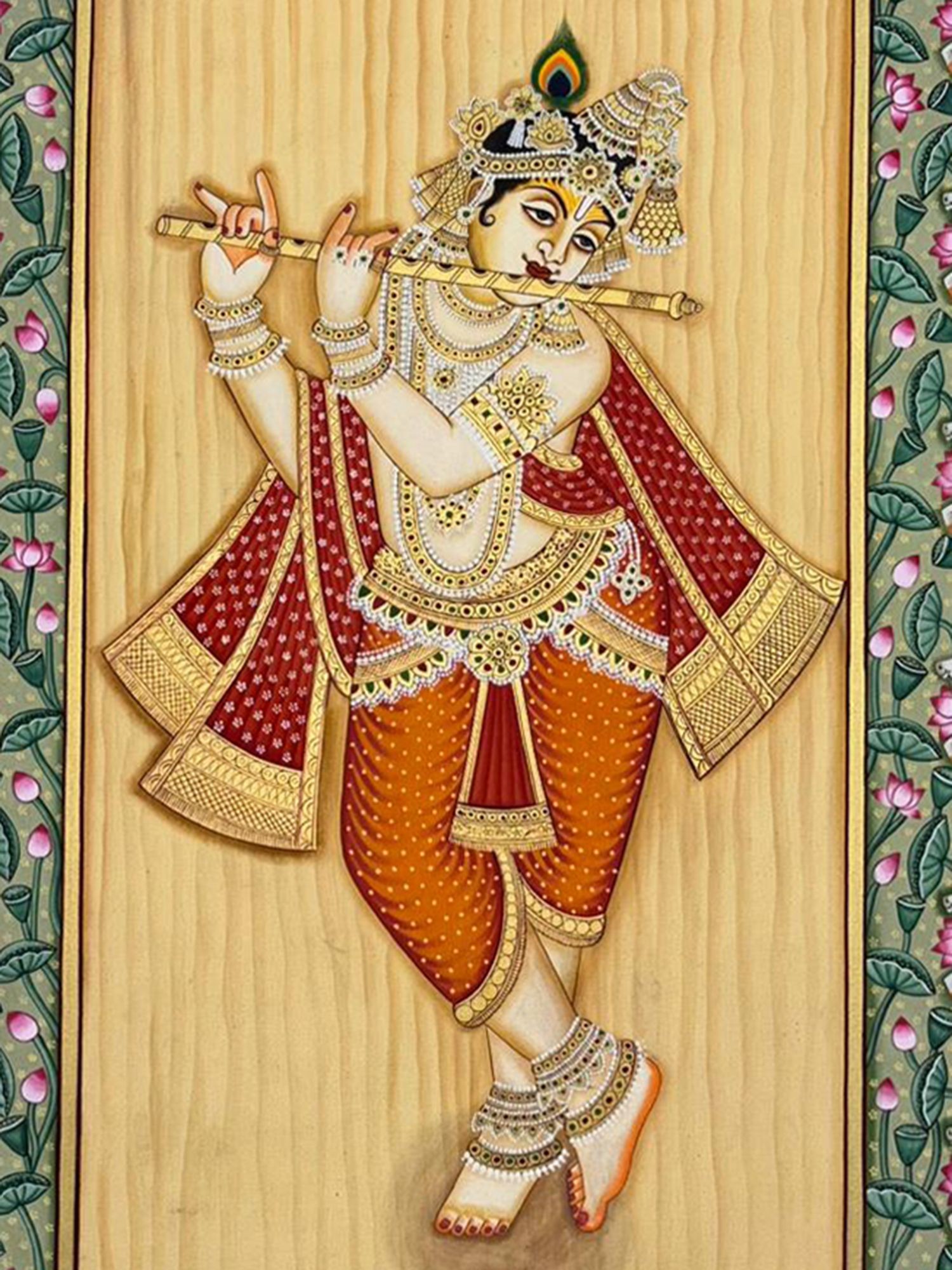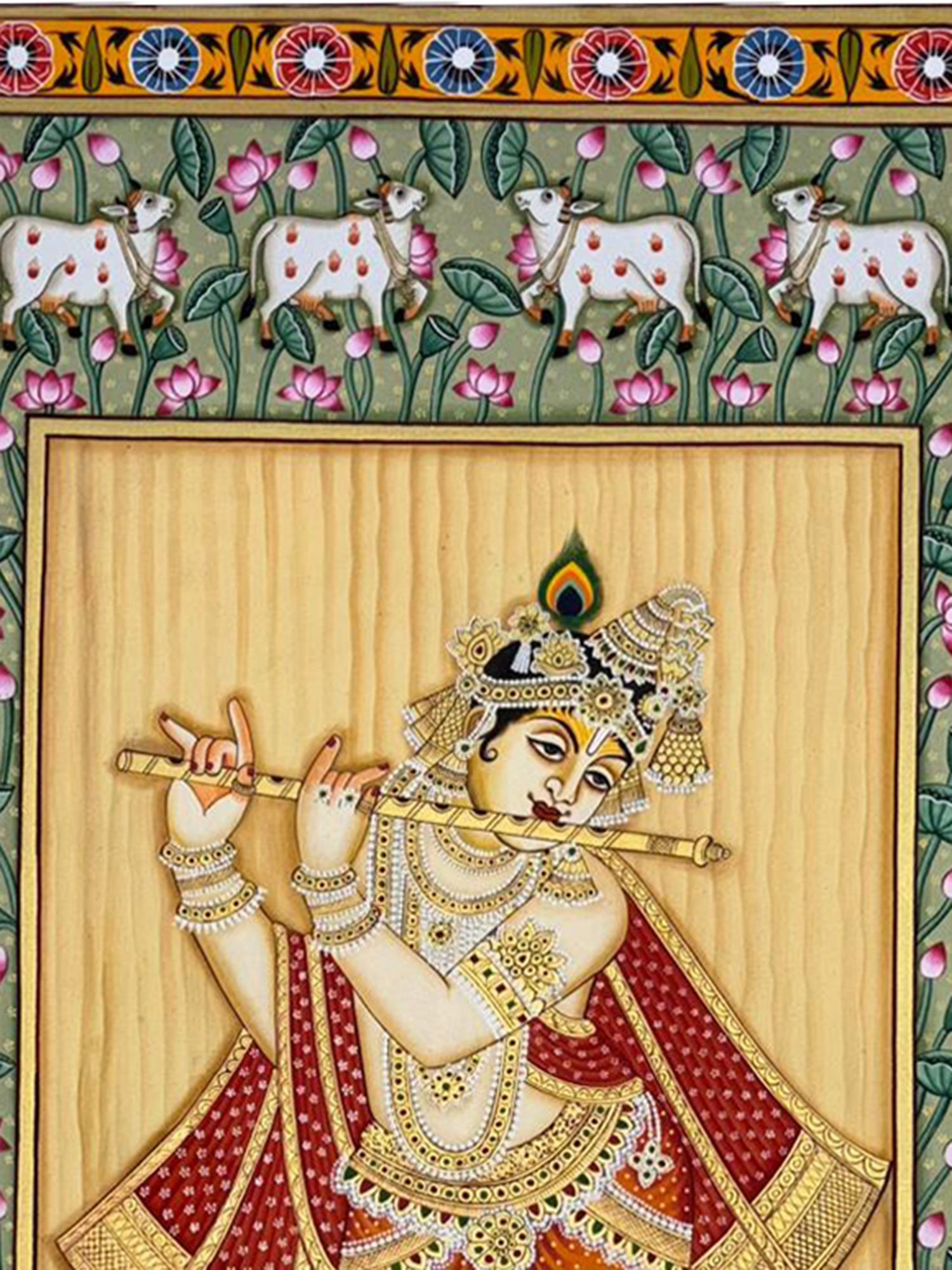 Authentic Pichhwai painting style known for its intricate details and vibrant colors.