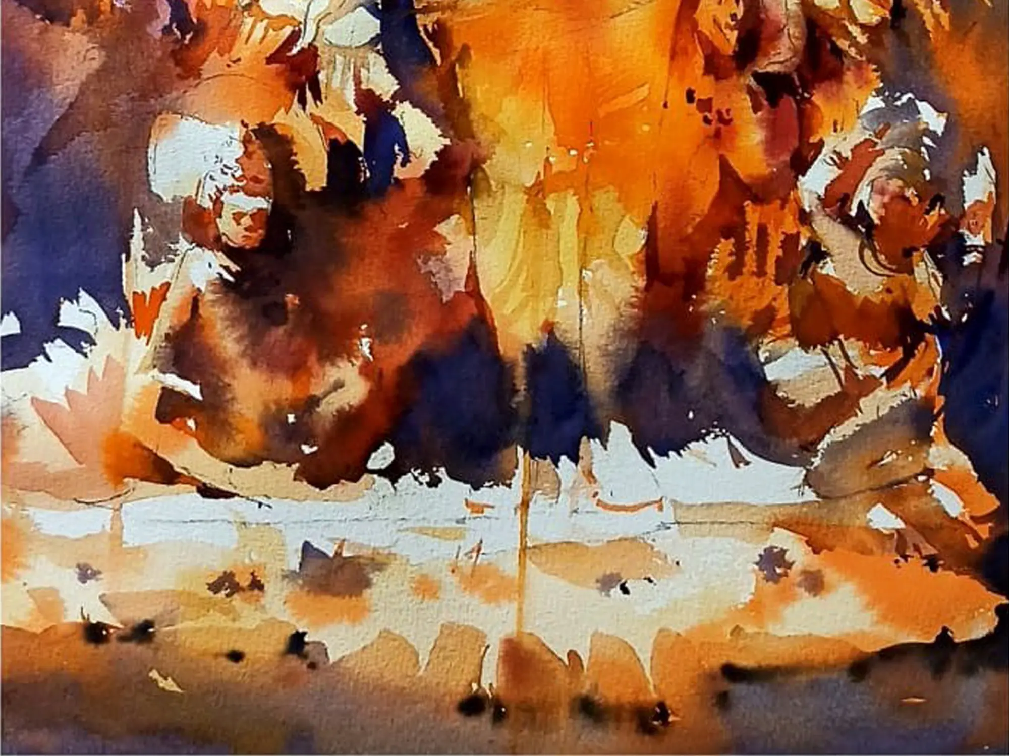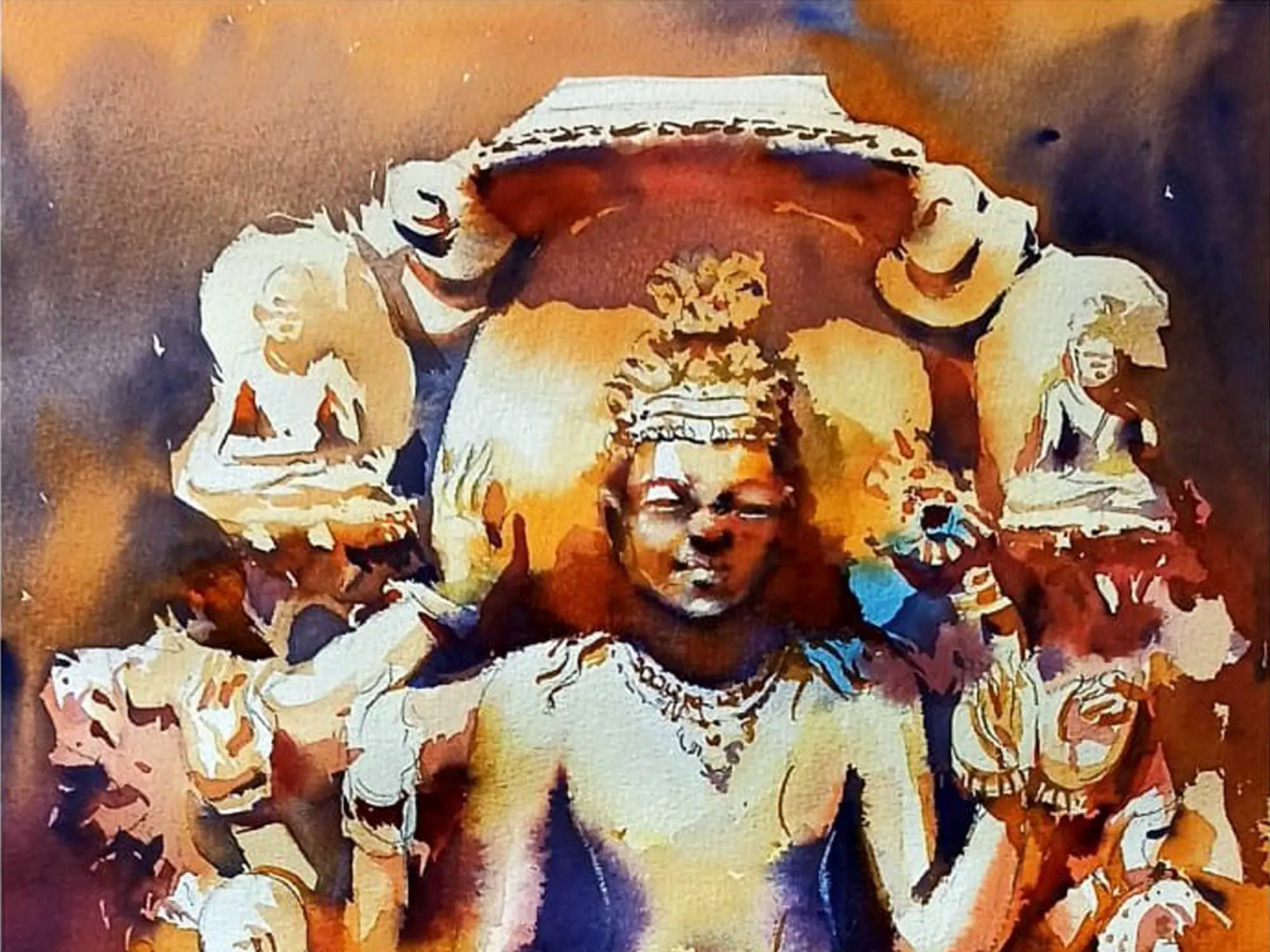 In this abstract watercolour painting, the essence of Lord Narayan transcends earthly forms, manifesting as a symphony of colours and shapes - conveying the divine energy and cosmic resonance of Narayan, inviting viewers into a realm of spiritual contemplation and enlightenment. Through its fluid forms and ethereal beauty, the painting channels the boundless grace and omnipotence of the divine, inspiring seekers to embark on a journey of self-discovery and transcendence. From its radiant hues to its transcendent imagery, the artwork serves as a timeless reminder of Narayan's eternal presence and infinite wisdom.