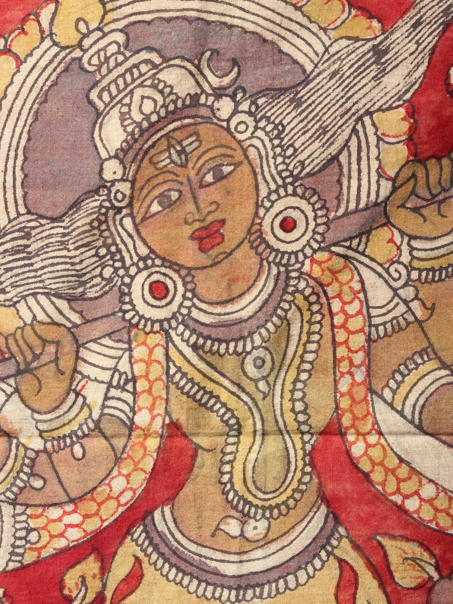 This Kalamkari painting "Lord Shiva Dancing and Nandi Playing Dholak" beautifully captures this dynamic, with Shiva depicted in a celestial dance and Nandi playing the drum. This masterpiece pays tribute to the sacred relationship between a guru and a disciple, highlighting the importance of reverence, discipline, and spiritual growth in the journey of enlightenment.