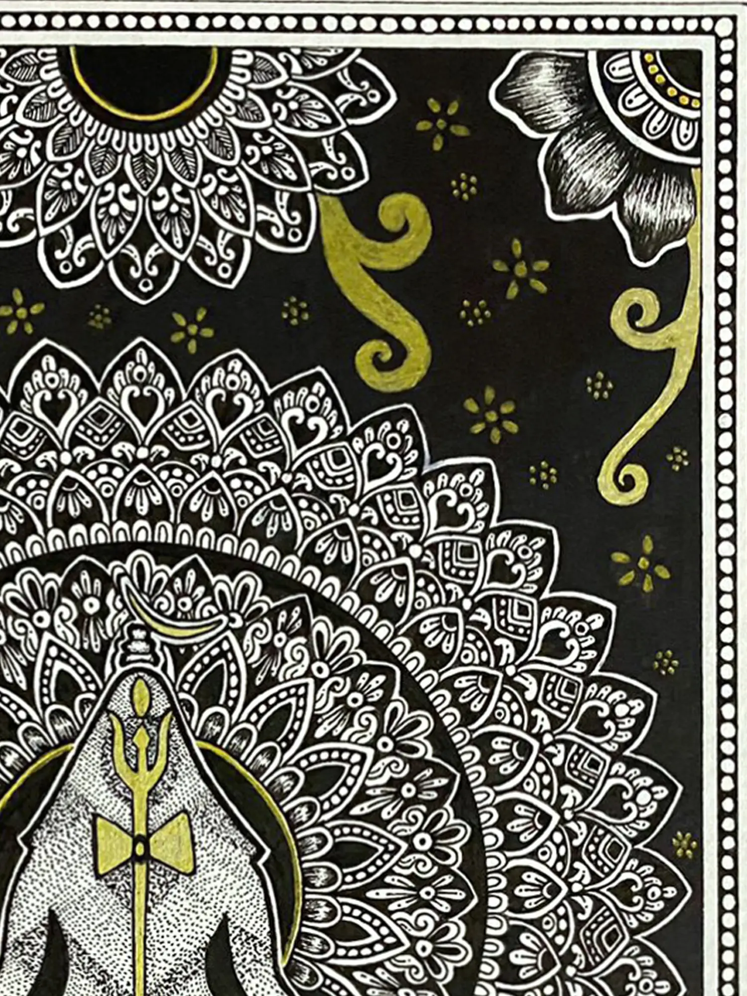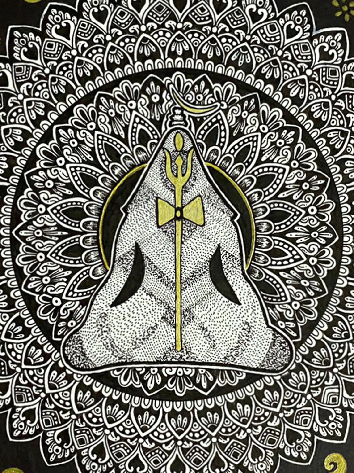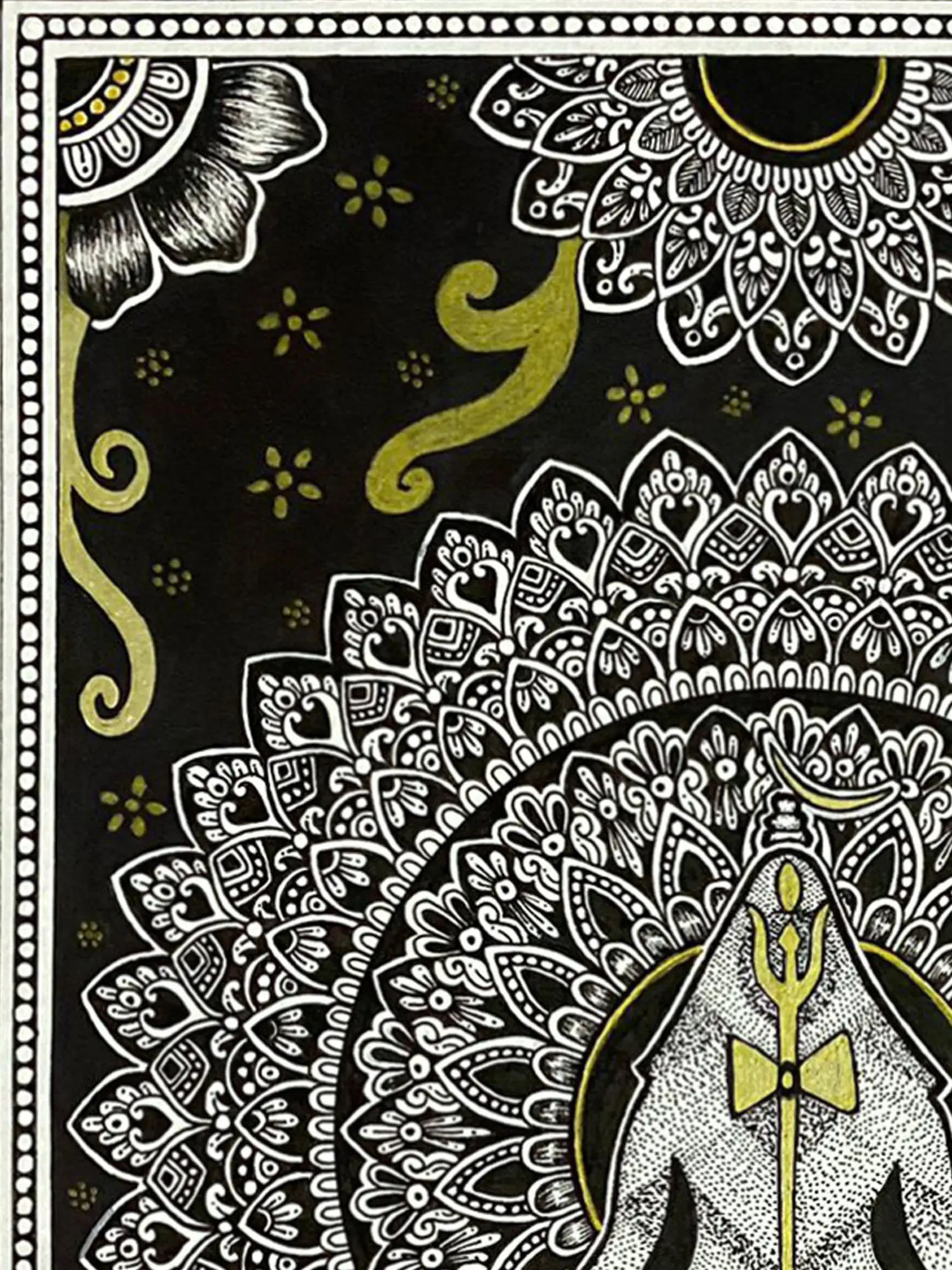 "Shiva Dhyana Mandala" beckons you into the tranquil depths of meditative serenity, where the divine essence of Lord Shiva is intricately woven into the fabric of existence. Each stroke reverberates with spiritual resonance, inviting you to embark on a journey of introspection and enlightenment. As you lose yourself in the intricate patterns and sacred symbolism, discover the eternal tranquility that resides within the heart of the cosmos.