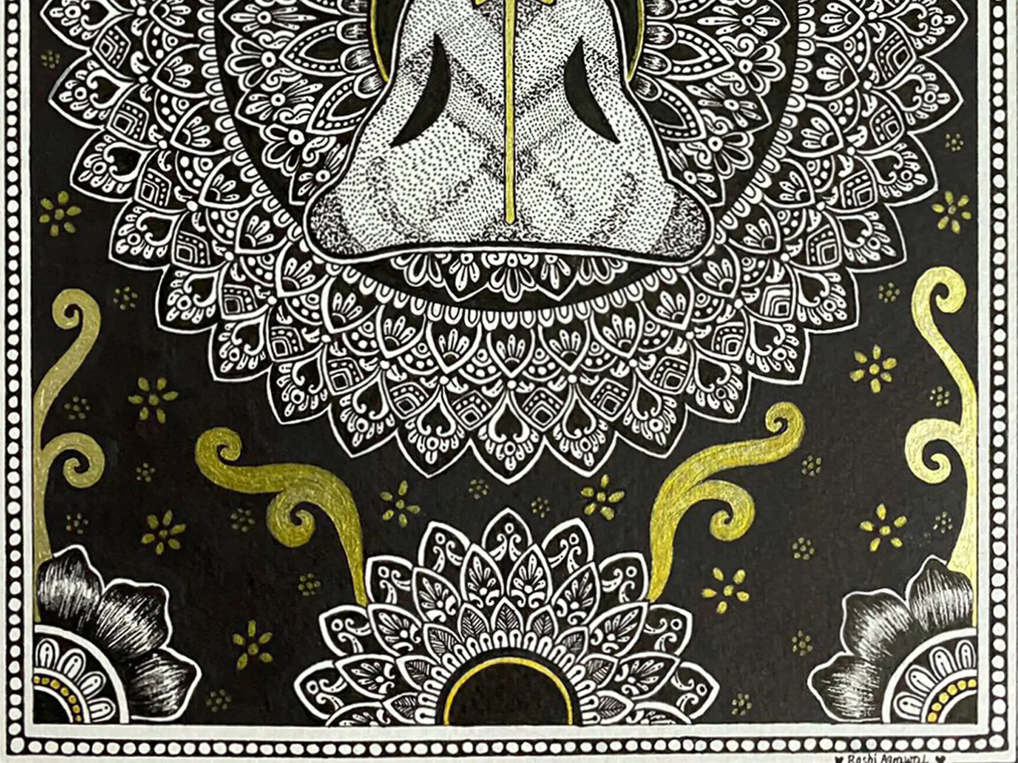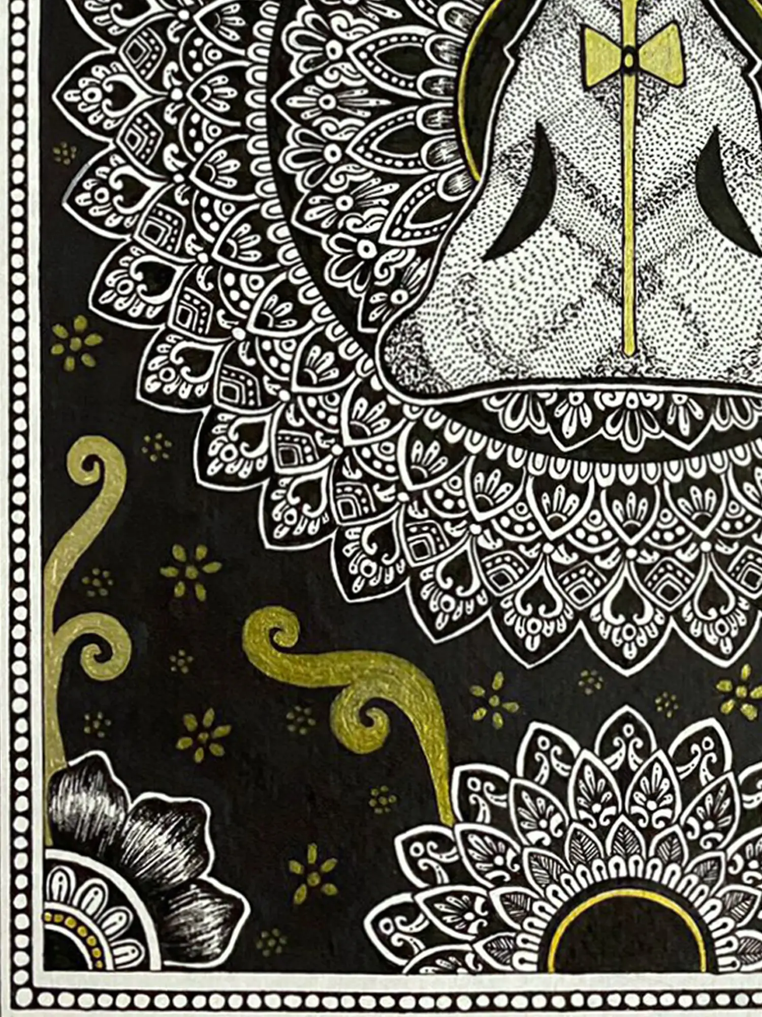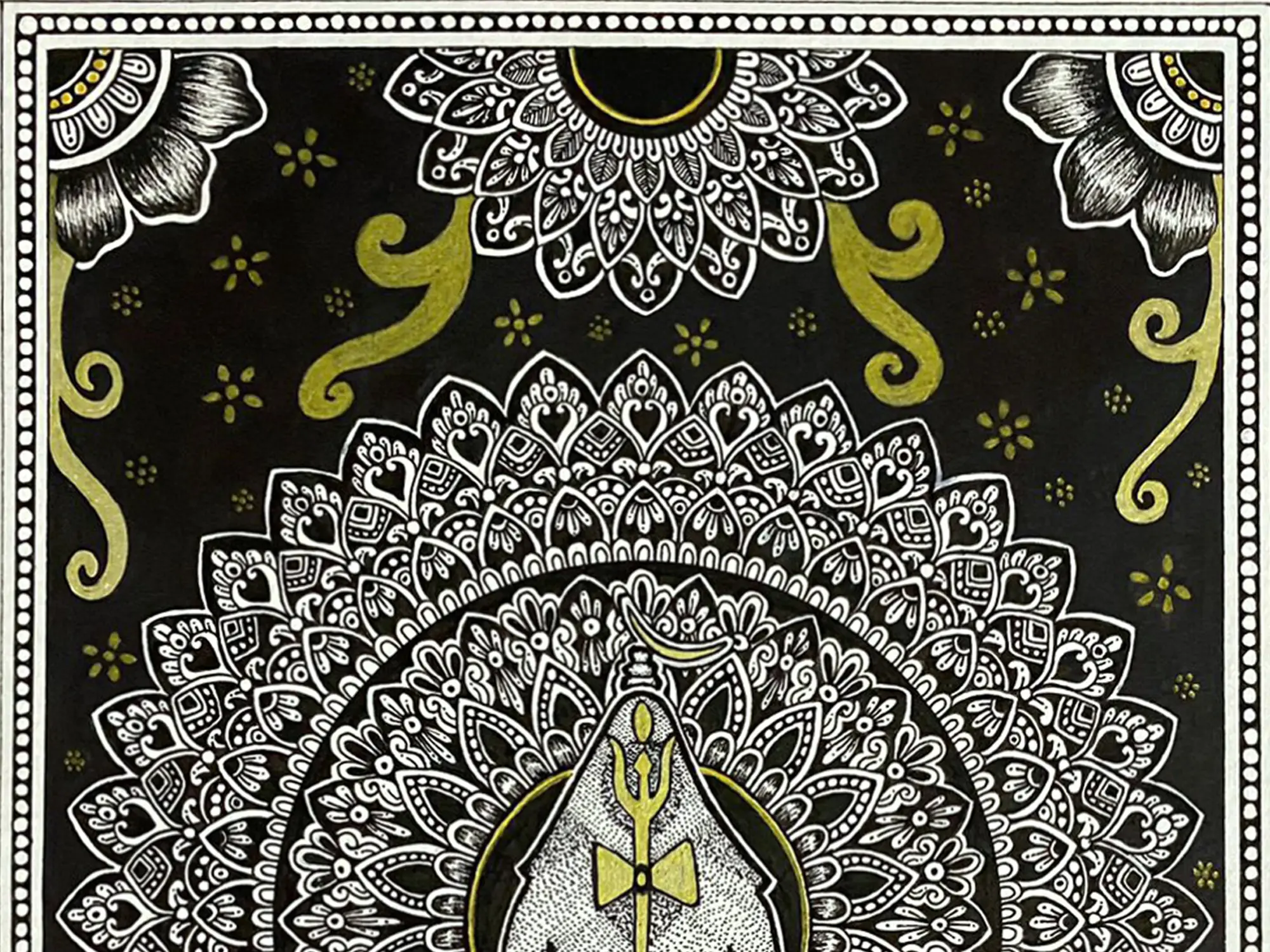"Shiva Dhyana Mandala" beckons you into the tranquil depths of meditative serenity, where the divine essence of Lord Shiva is intricately woven into the fabric of existence. Each stroke reverberates with spiritual resonance, inviting you to embark on a journey of introspection and enlightenment. As you lose yourself in the intricate patterns and sacred symbolism, discover the eternal tranquility that resides within the heart of the cosmos.
