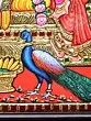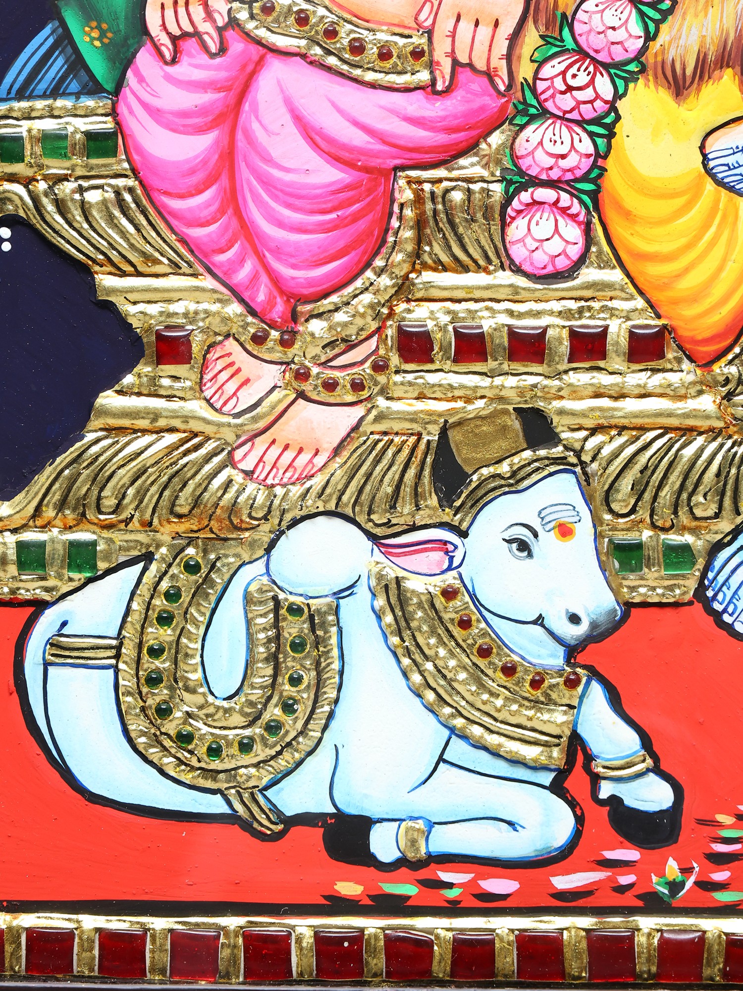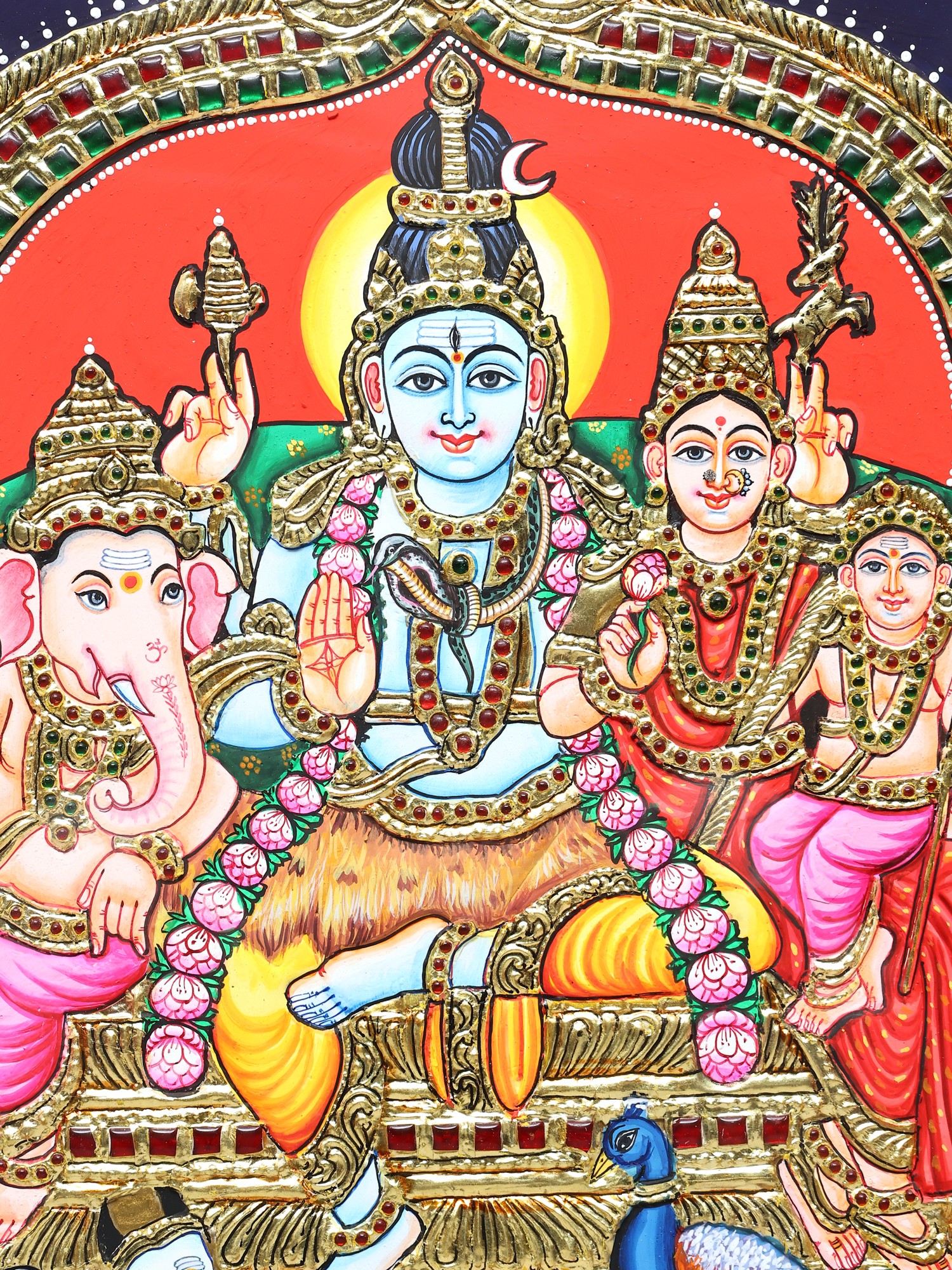 The family is seated upon an ornate, elevated throne, a symbol of their supreme status in the celestial realm. The throne is intricately decorated with raised relief work, showcasing traditional motifs and patterns that add depth and texture to the composition. The rich, deep blue backdrop, juxtaposed with vibrant red and gold hues, creates a dramatic and reverent atmosphere. To the left of the throne, Nandi, Lord Shiva's loyal bull vahana, rests peacefully, a testament to unwavering devotion and dharma. The presence of Nandi underscores Shiva's role as the lord of beasts and the embodiment of righteous duty. On the right, a magnificent peacock, with its iridescent plumage, adds a touch of natural beauty and symbolizes immortality and regal splendor. The peacock is also associated with Kartikeya, further strengthening the familial bond depicted.