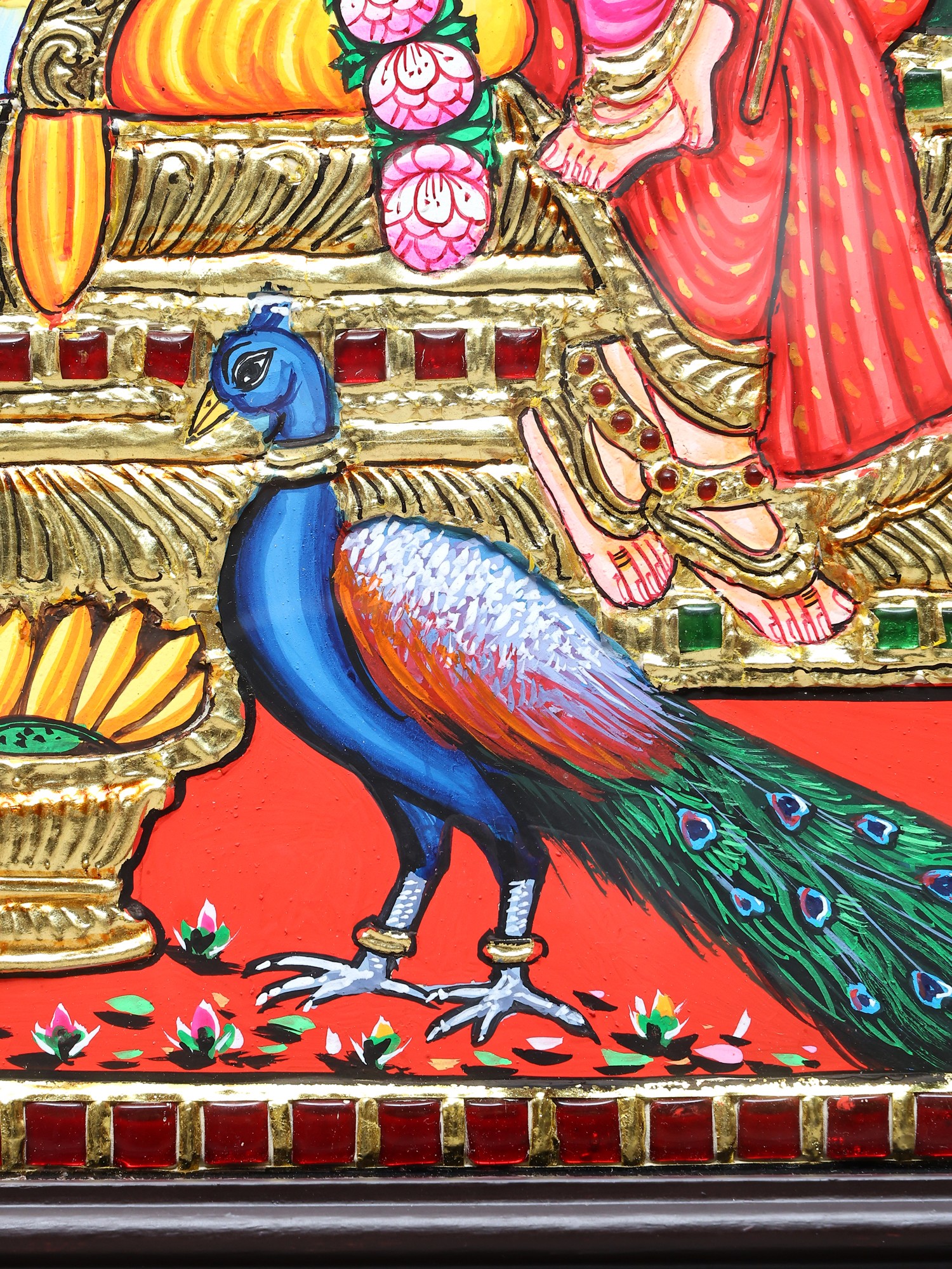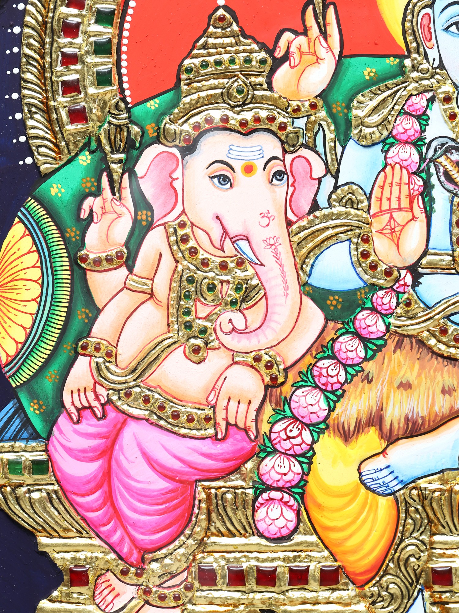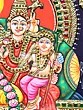 This masterpiece is a quintessential example of the Tanjore (Thanjavur) painting style, an ancient Indian art form originating from the town of Thanjavur in Tamil Nadu. Renowned for its richness, opulence, and adherence to classical iconography, Tanjore paintings are characterized by their use of vibrant natural pigments and the lavish application of gold foil. In this particular artwork, pure 24-karat gold leaf has been meticulously applied to highlight the divine figures, their embellishments, and the ornate architectural elements of the throne. The traditional colors, derived from natural sources, lend a timeless quality and a spiritual resonance to the painting. Each stroke and detail is a testament to the skilled craftsmanship passed down through generations, preserving a rich cultural heritage and offering a gateway to divine contemplation. The entire composition is framed in a deep, dark wood, further accentuating the vibrant artwork within and making it ready to adorn any sacred space or discerning art collection.