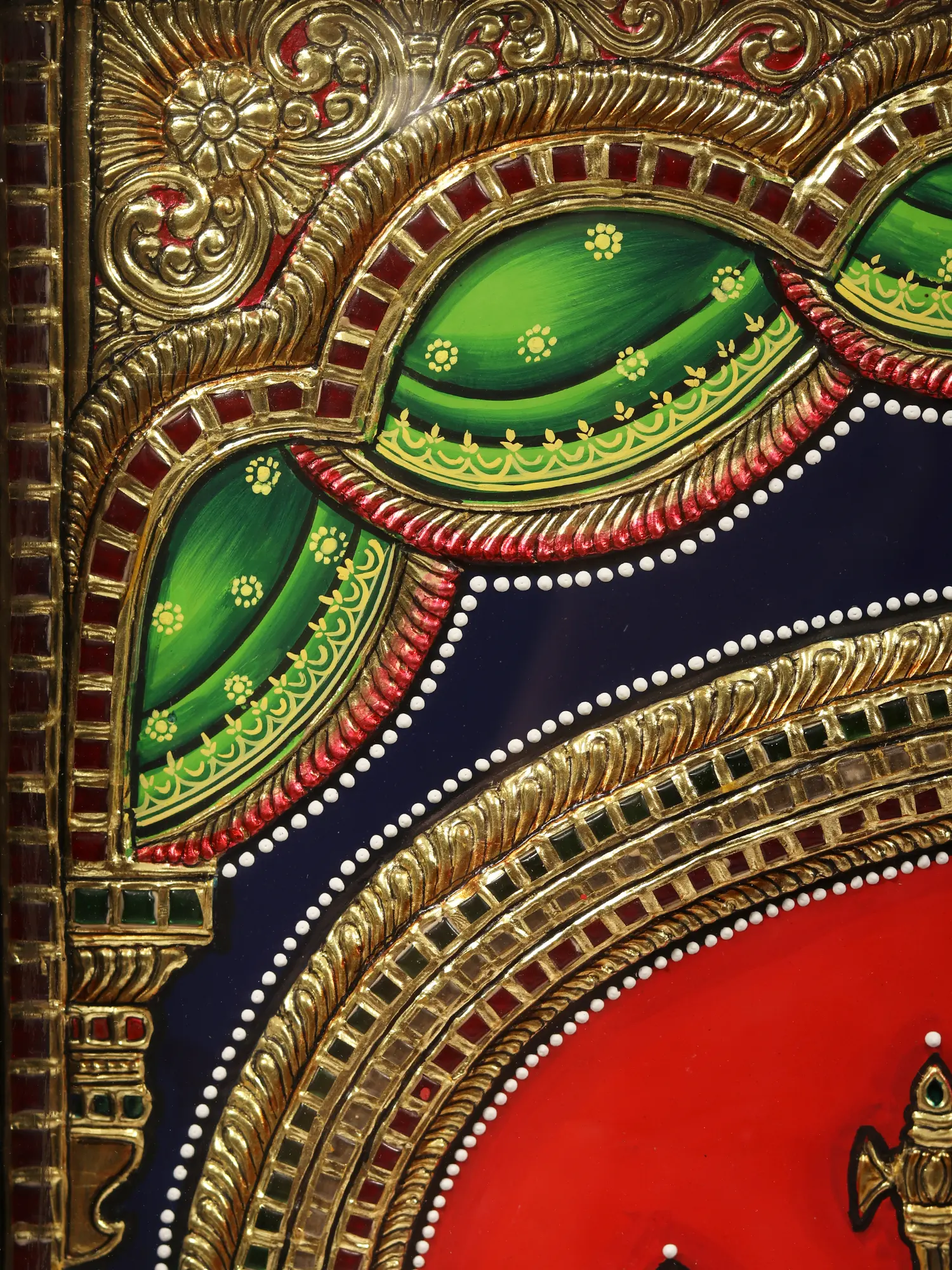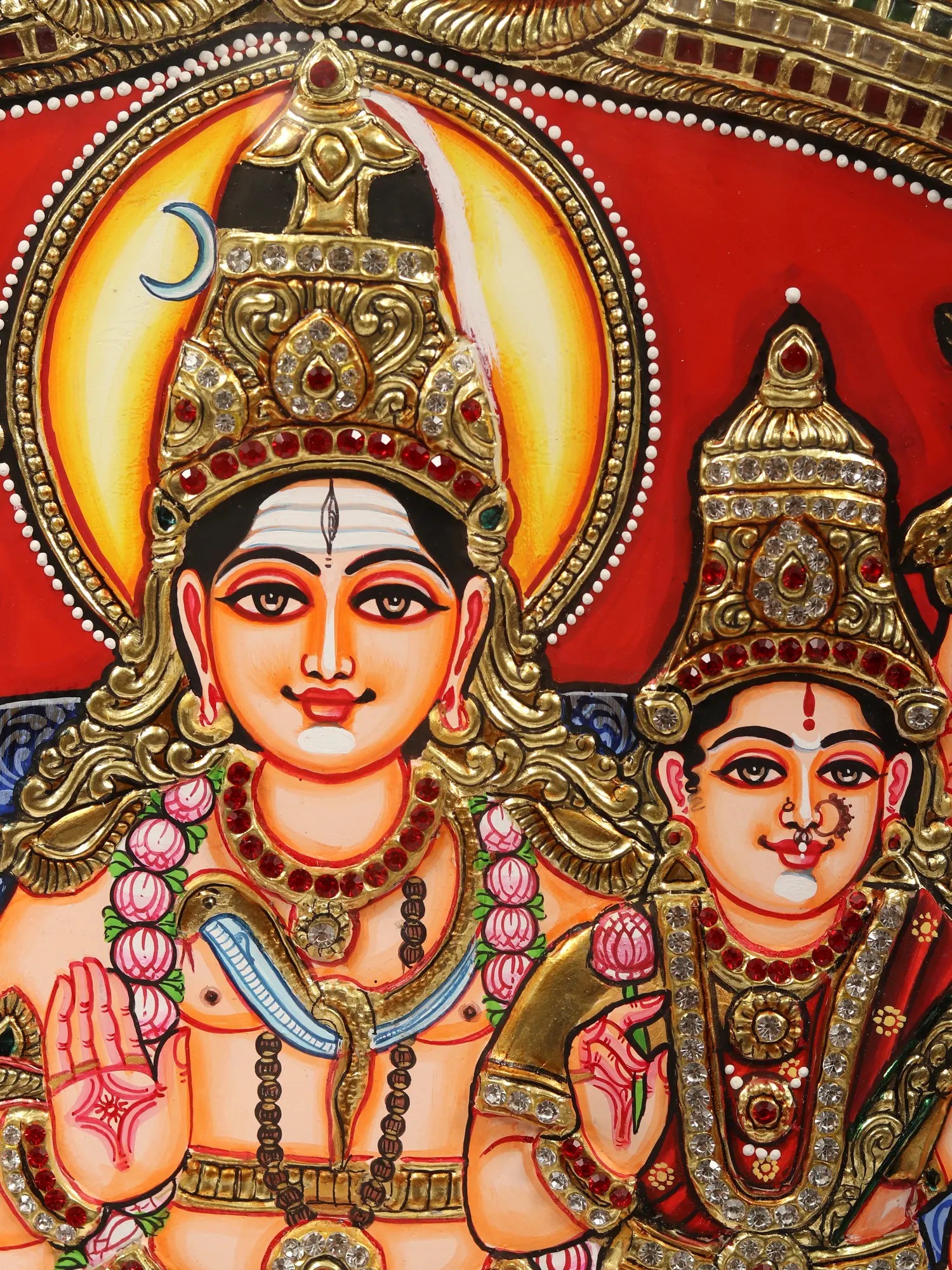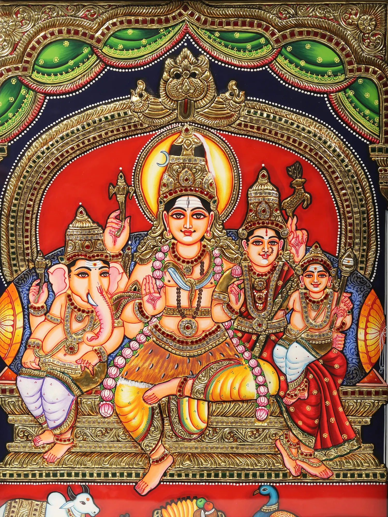 The Shiva Parivaar Tanjore painting radiates the divine splendor of Shiva's celestial family. With resplendent embellishments and vibrant hues, this artwork portrays Shiva in his Pashupati form, seated at the heart of the composition. His divine consort, Uma, sits beside him, bedecked in regal attire, cradling Karttikeya in her lap. Ganesha, in his Chaturbhuja form, sits beside his father. Each member of this celestial household is a formidable deity, and their presence paints the highest vision of an ideal family - strong, loving, and harmonious. This painting captures the ethereal unity of the divine, resonating with the eternal qualities of devotion, strength, and unity that define the Shiva Parivaar.