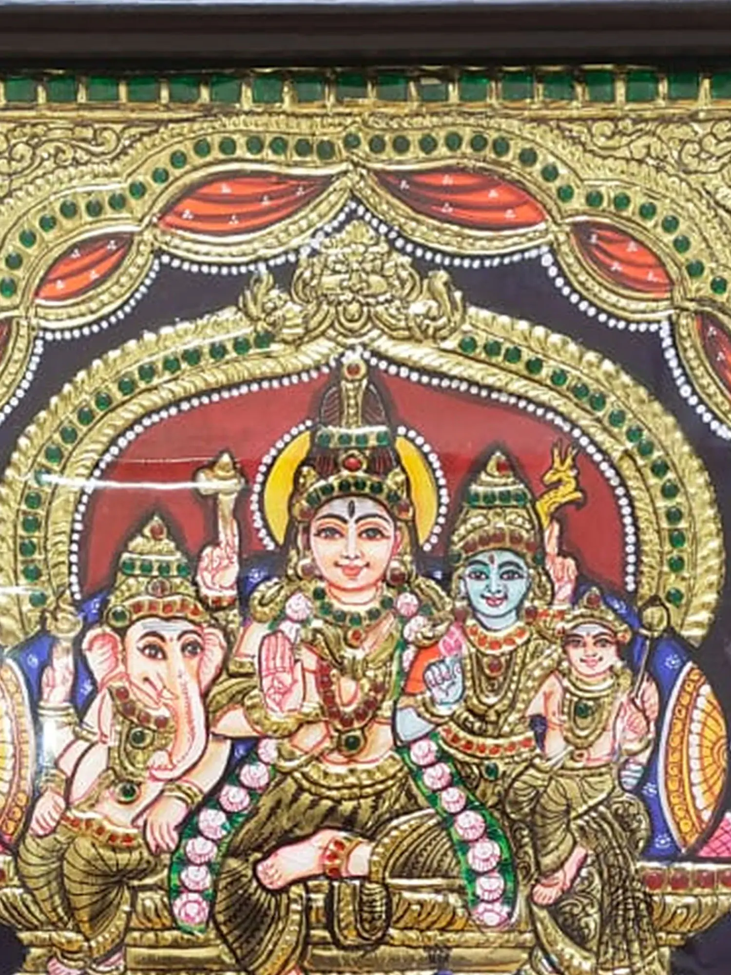 This Tanjore Painting of Lord Shiva's family is a heartwarming portrayal of familial bliss. Traditional colors and meticulous gold foil work enrich the opulence of the artwork, capturing Lord Shiva, Goddess Parvati, Lord Ganesha, and Lord Kartikeya in a celestial moment. The Tanjore painting technique's detailed craftsmanship adds a regal touch, while the framed composition preserves the traditional artistry.