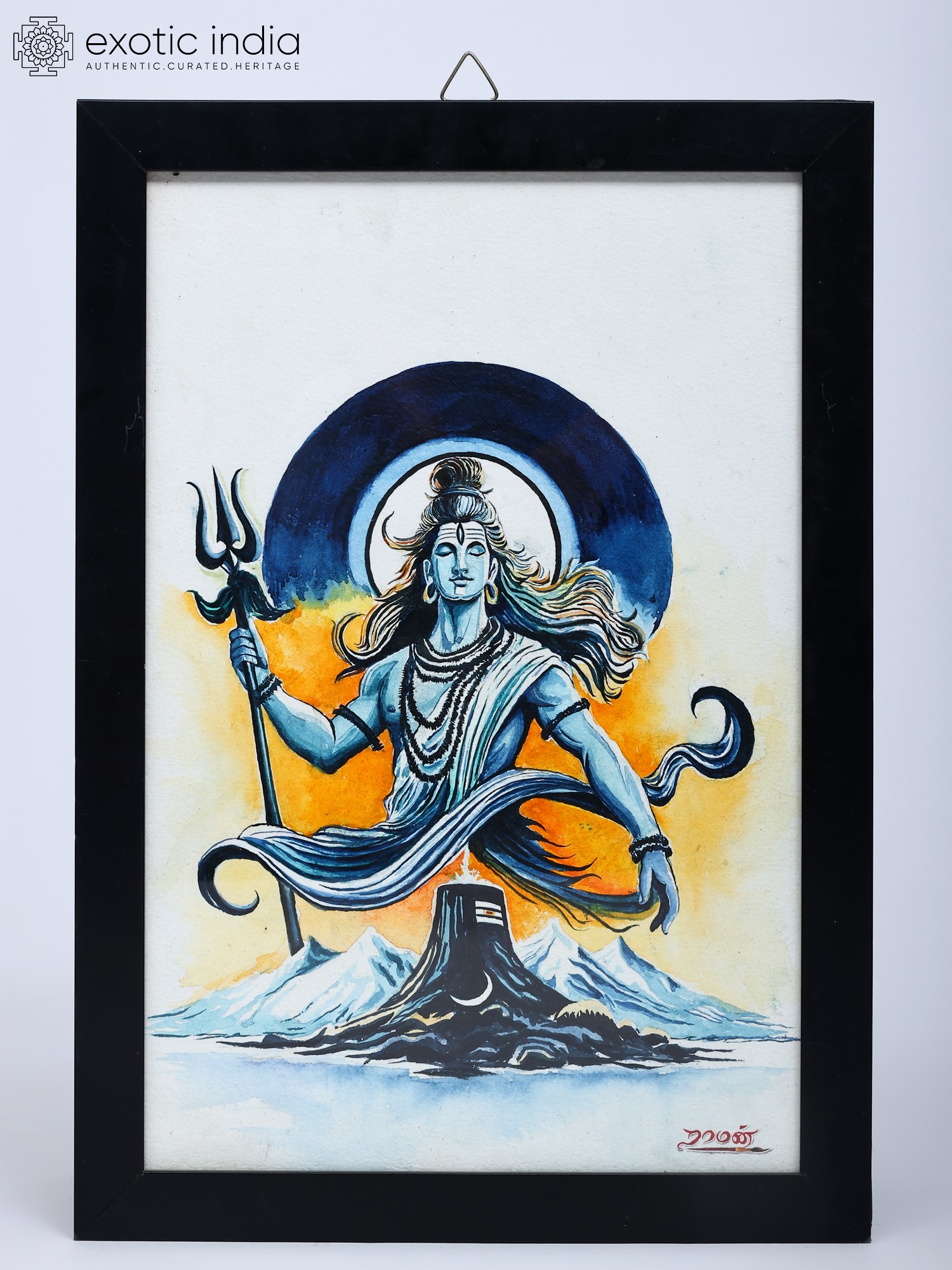 This captivating artwork is more than just a painting; it is a devotional offering, a conduit for spiritual connection. The watercolor medium lends itself to the subtle gradations of color and the fluid forms, allowing the artist to capture the divine grace and raw power of Shiva with remarkable sensitivity. The careful framing in a classic black border enhances the visual impact of the painting, making it a striking addition to any space. Whether for a personal sanctuary or a dedicated meditation area, this piece invites contemplation and fosters a sense of peace and spiritual upliftment. The handmade nature of this artwork ensures that each brushstroke carries the artist's intent and devotion, making this a truly unique and cherished possession.