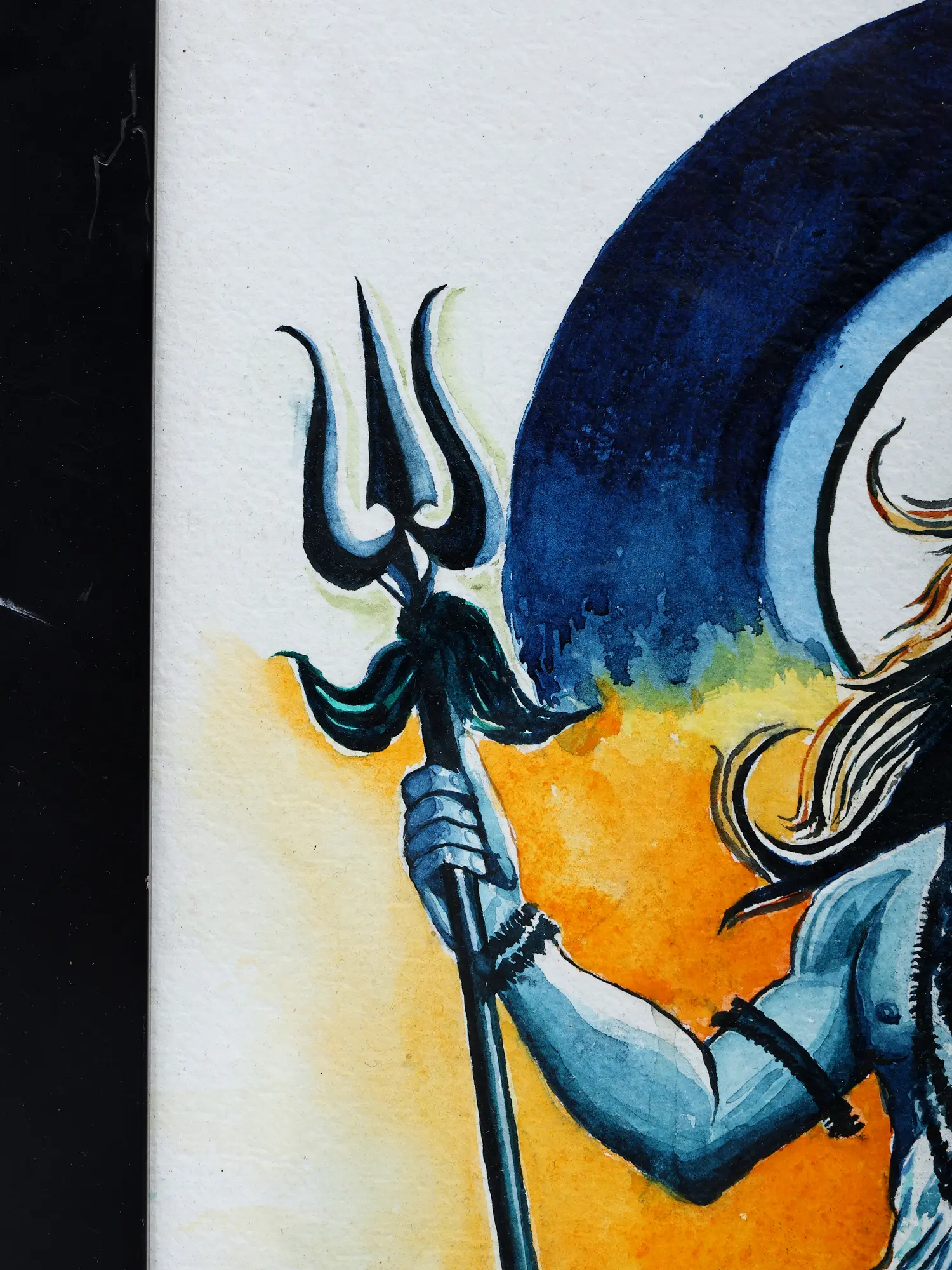 This exquisite handmade watercolor painting captures the profound essence of Lord Shiva, revered as Mahakal – the Lord of Time itself. The artist has masterfully rendered this divine figure using delicate yet bold strokes of watercolor on paper, creating a piece that resonates with spiritual energy and artistic brilliance. Lord Shiva, often depicted with a serene yet powerful presence, is shown here in a contemplative pose, his gaze fixed and his form radiating an aura of immense power and tranquility. His characteristic third eye, symbolizing wisdom and intuition, is subtly suggested, hinting at his cosmic awareness. The artwork showcases Shiva's iconic trident, the Trishula, held firmly in his hand, representing the three fundamental aspects of existence: creation, preservation, and destruction. This powerful symbol underscores Shiva's role as the cosmic dancer, Nataraja, who through his dance, the Tandava, brings about the cycles of destruction and rebirth, essential for the universe's continuous evolution. The flowing locks of hair, unbound and wild, speak of his ascetic nature and his transcendence of societal norms, while the serpents adorning his neck symbolize his control over the primal forces of nature and his mastery over fear and ego.