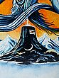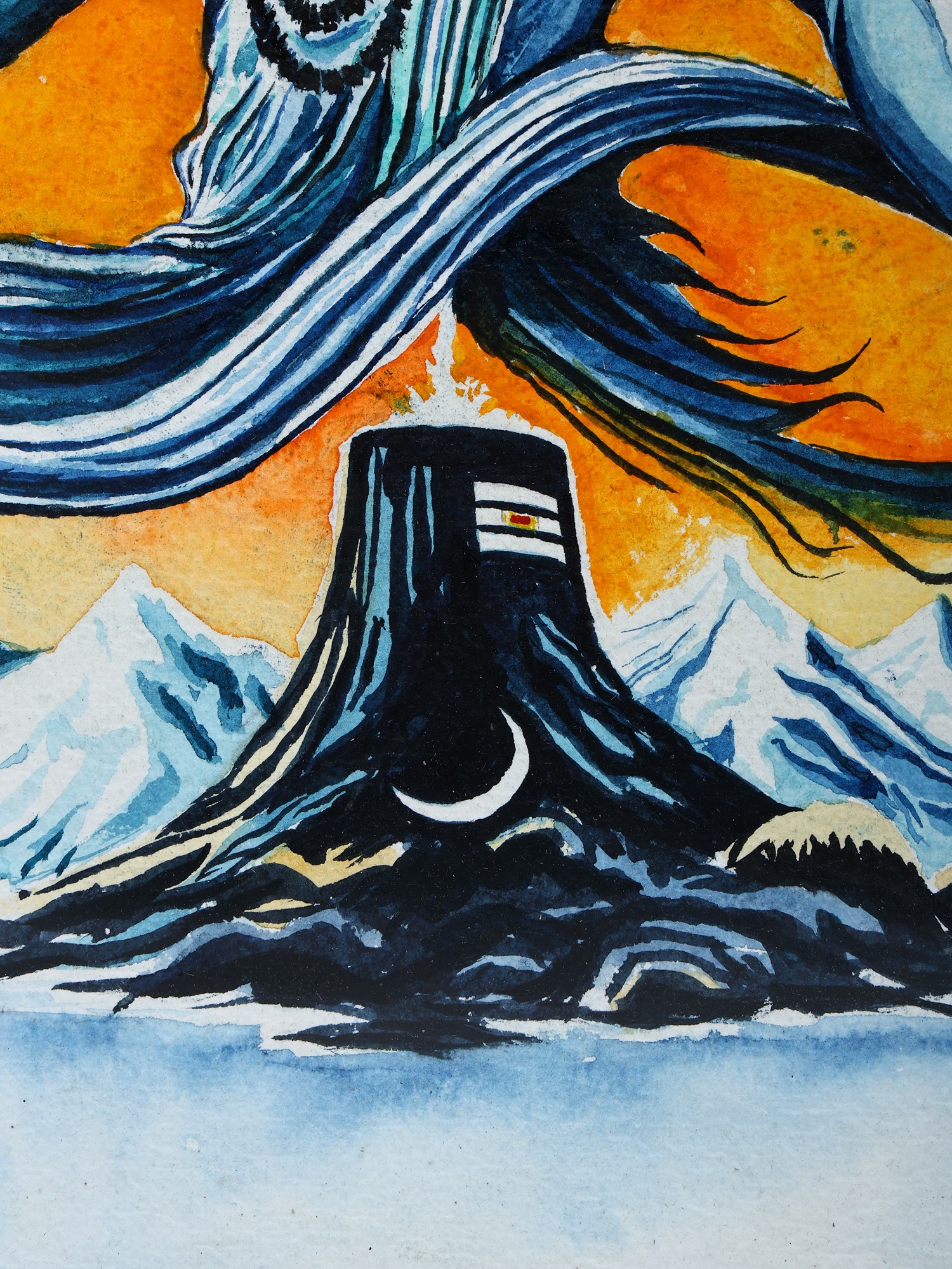 The backdrop of the painting evokes the awe-inspiring grandeur of the Himalayas, Lord Shiva's eternal abode. Snow-capped peaks rise majestically, rendered with a soft, ethereal touch that emphasizes their sacredness and serenity. At the base of the divine figure, a Shiva Lingam is depicted, a potent aniconic representation of Shiva, symbolizing the formless, infinite, and all-pervading nature of the Supreme Being. The Lingam, set against the stark beauty of the mountains and a shimmering body of water, grounds the divine presence in a terrestrial landscape, connecting the celestial with the earthly realm. The vibrant hues of orange and yellow radiating behind Shiva suggest the cosmic fire that sustains and transforms the universe, a testament to Mahakal's ultimate power over time and existence.
