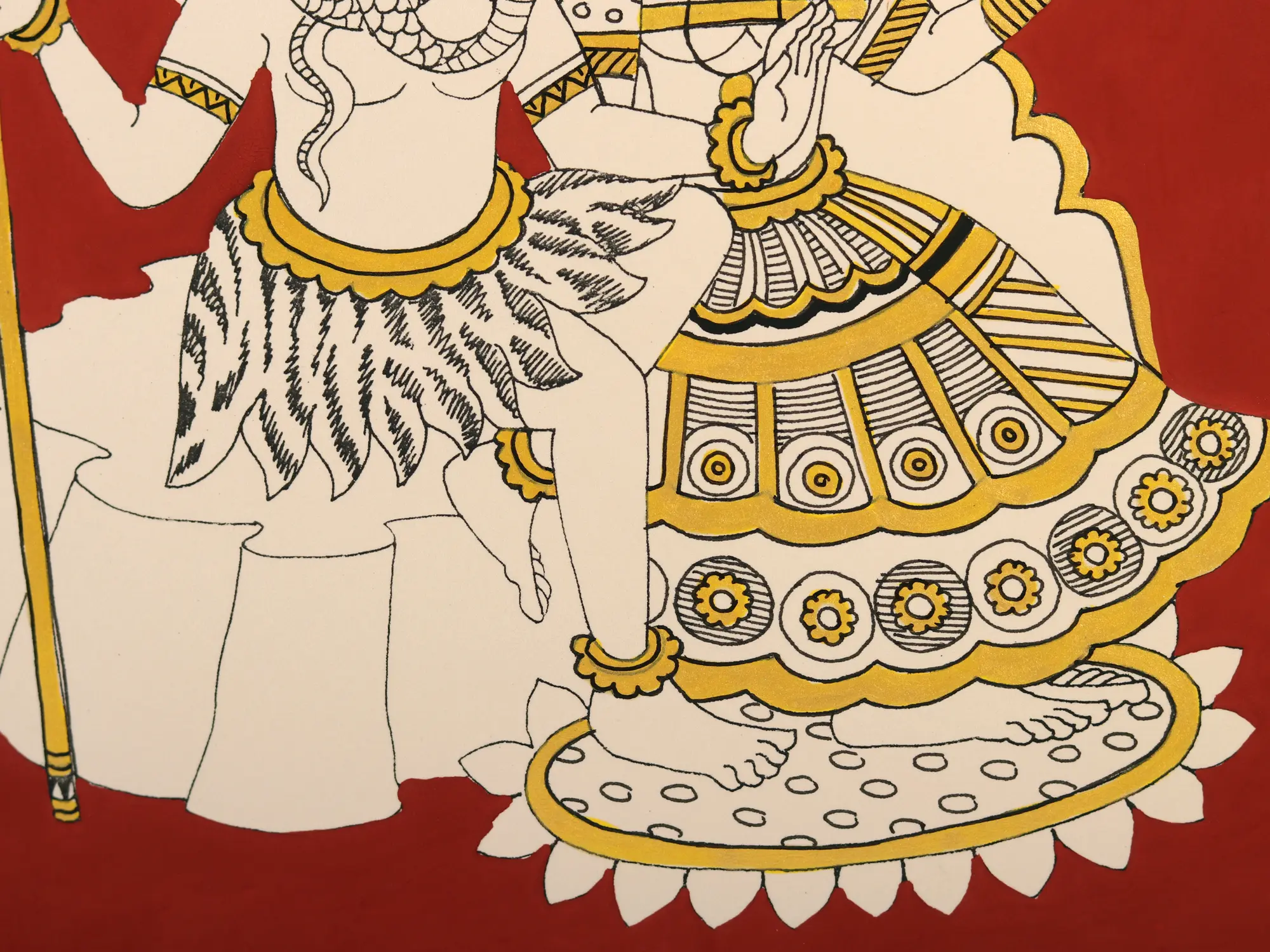 The composition, measuring approximately 7.5 by 7.5 inches, is a testament to intricate detail. You'll appreciate the balanced portrayal of the divine figures, their serene expressions, and the symbolic elements that adorn them. The rich, deep red background accentuates the figures, while the subtle golden outlines and decorative motifs add a touch of regal elegance. Observe the fine rendering of jewelry and attire, each element thoughtfully placed to enhance the overall aesthetic appeal.