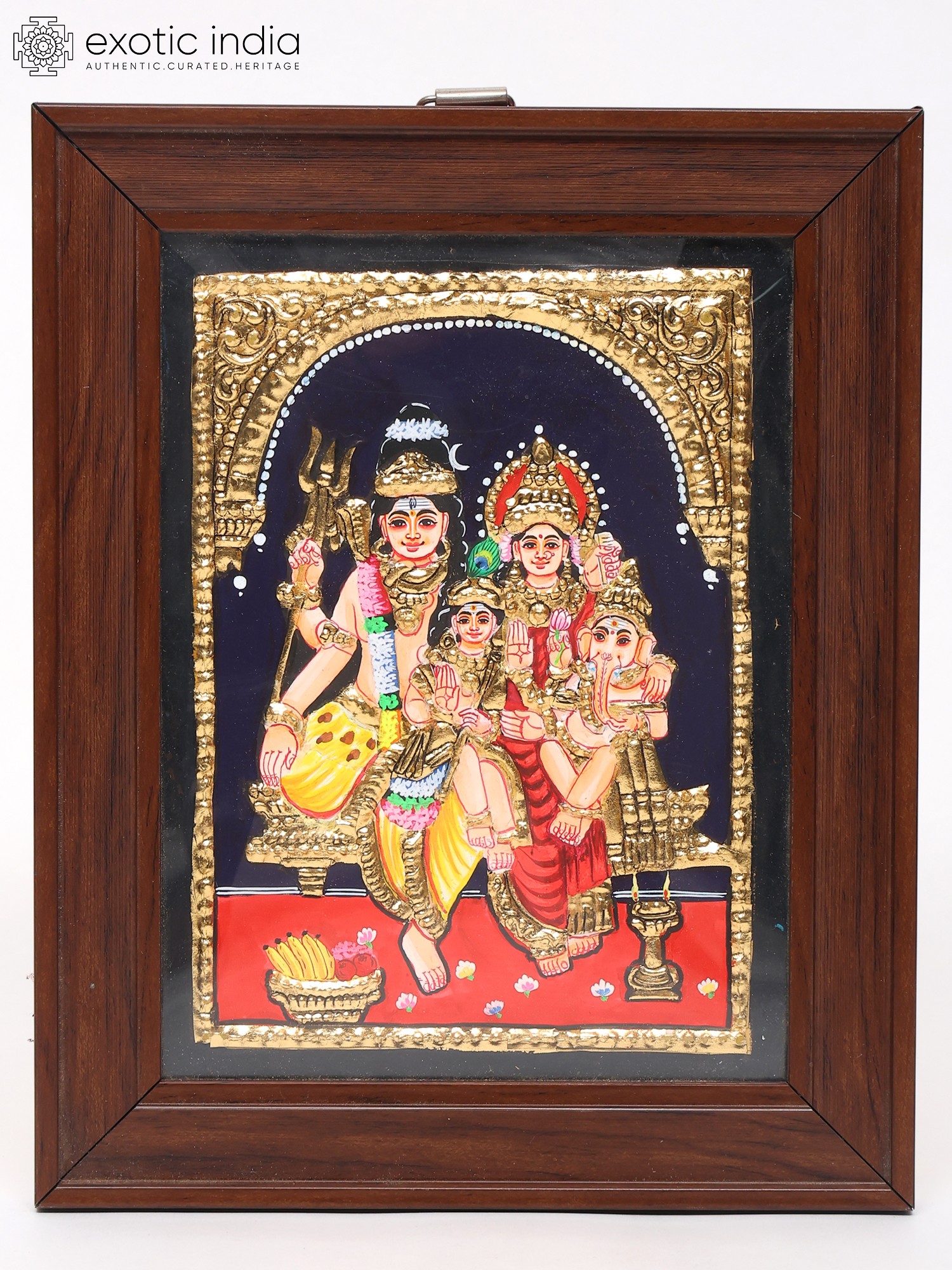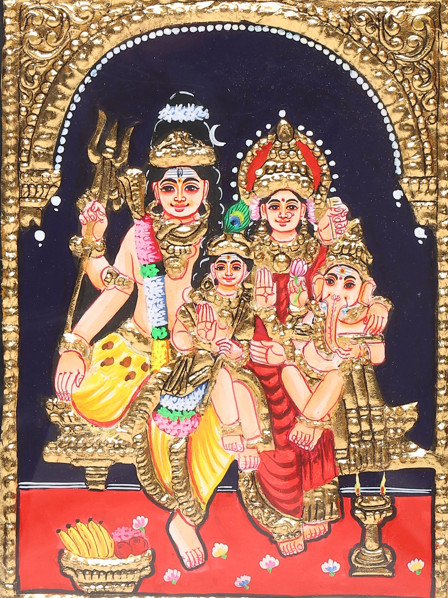 The Lord Shiva with Family Tanjore Painting exudes an aura of divine grace and harmony that blesses any space it adorns. At the heart of this masterpiece, Lord Shiva sits majestically, flanked by Goddess Parvati cradling Sri Ganesha in her loving lap, while Karttikeya rests in his father's embrace.