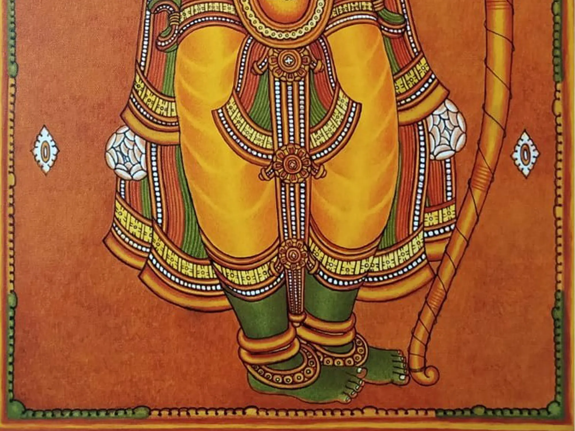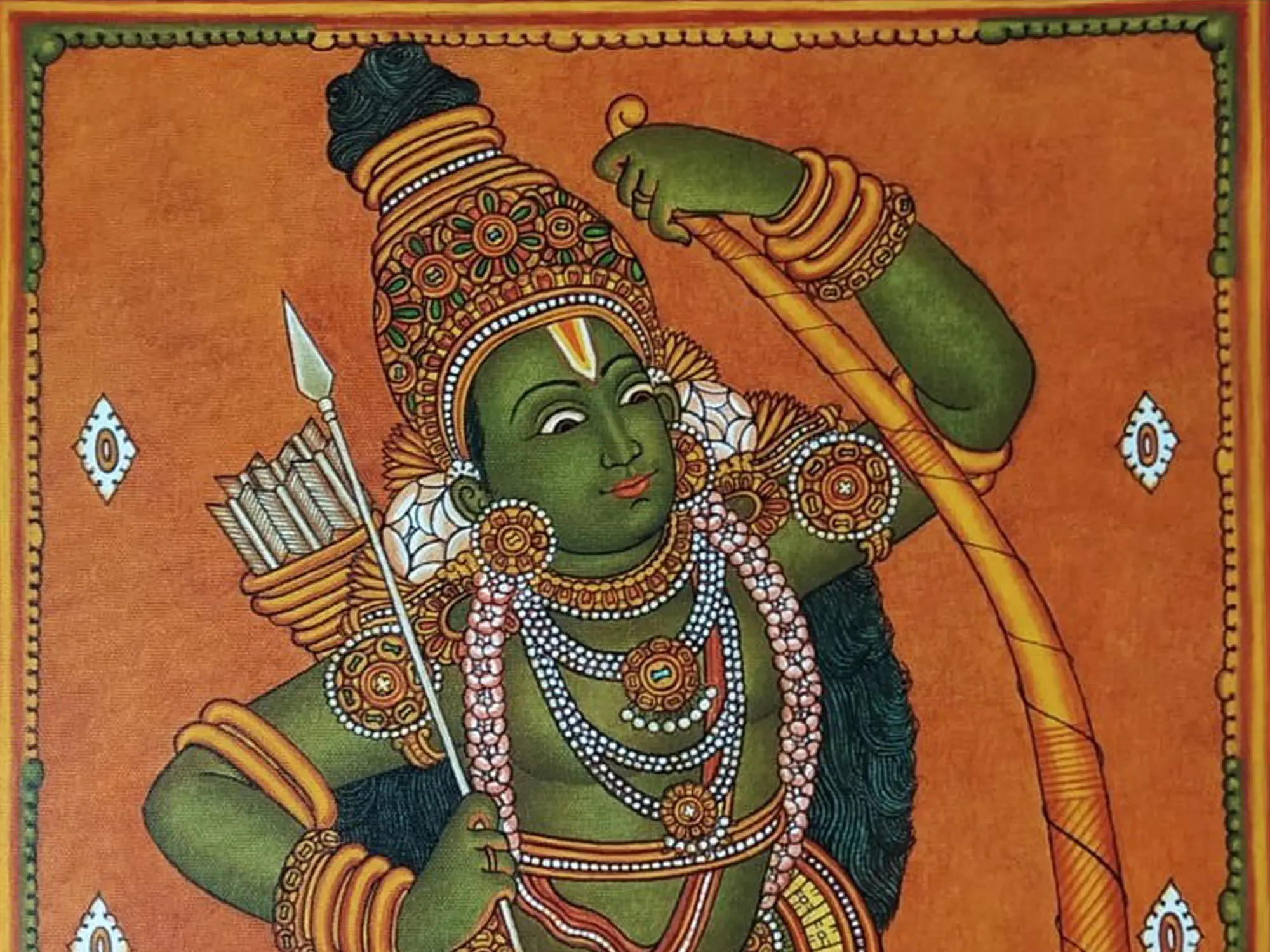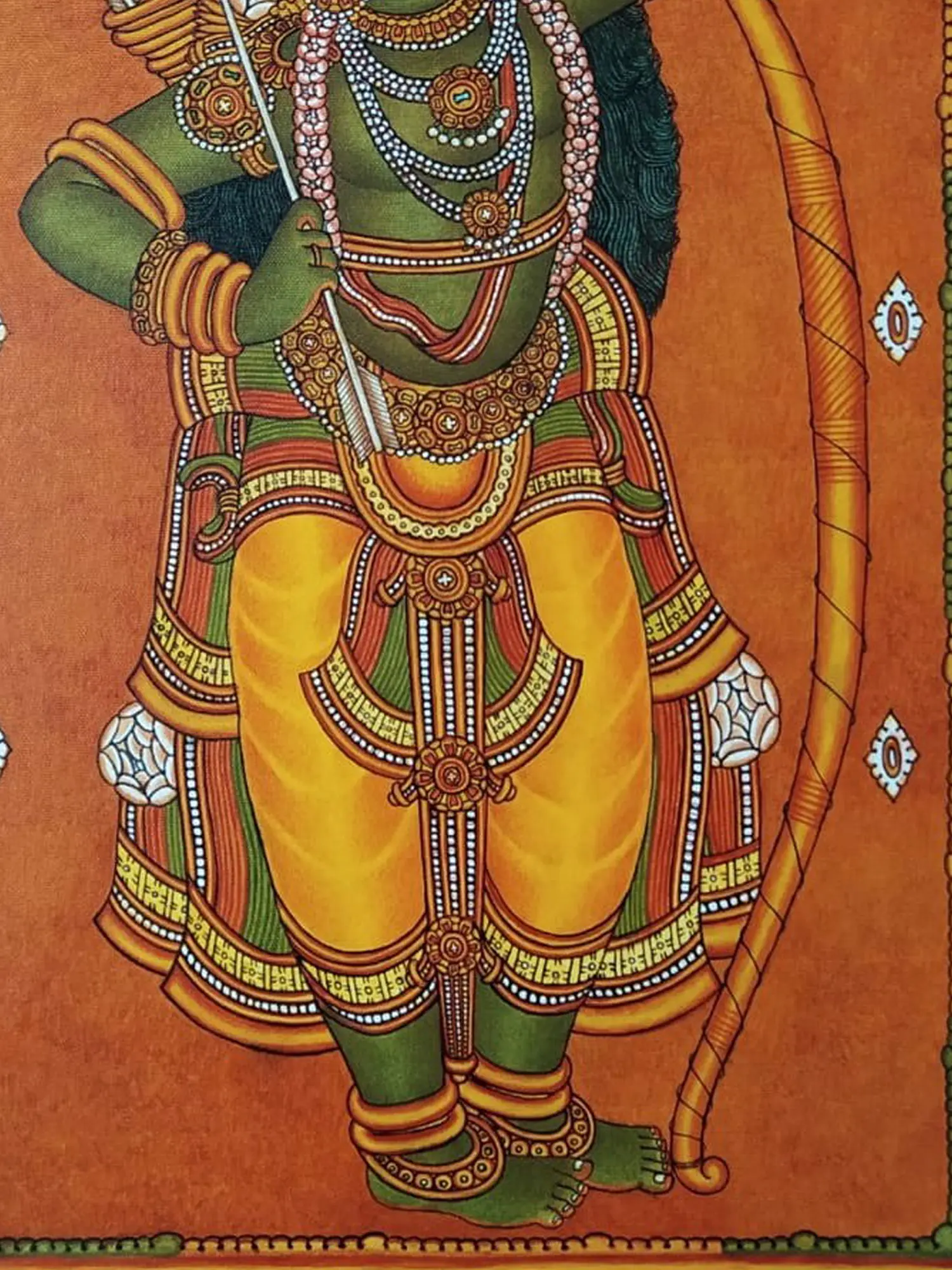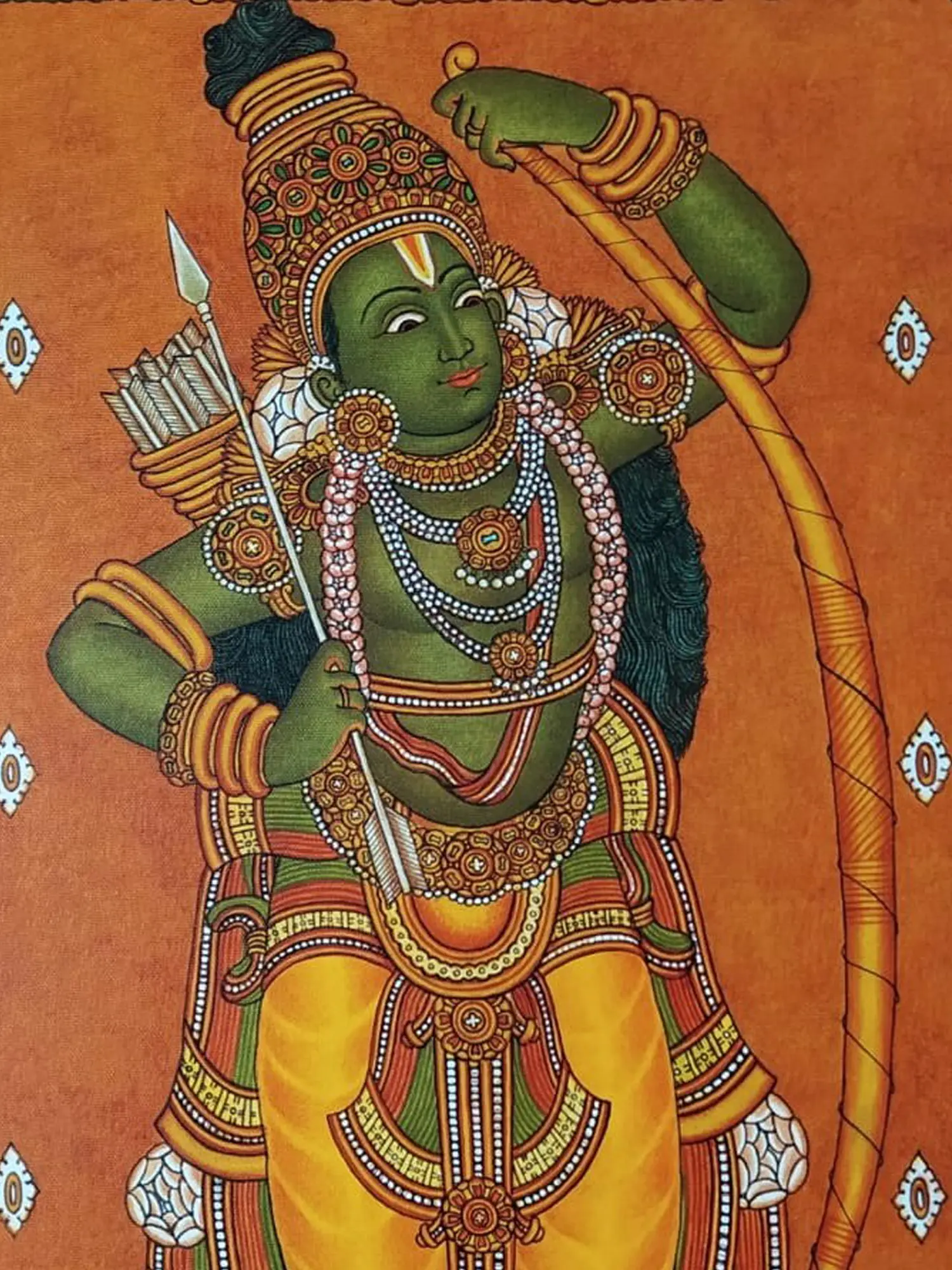 Kodanda-Rama, Sri Rama holding his mighty bow Kodanda, is a theme celebrated in the art of South India. This acrylic on canvas presents the divine beauty of Rama as the celestial warrior, on a vertical canvas that lets one immerse in the aura of Maryadapurshottama Rama. Green-hued, emanating the luster of a green jewel, adorned with an ornate crown that sits over his long and beautiful curled hair, gemmed jewelry, and Pitambara, Sri Rama in this painting strikes a valiant stance, with a sense of vigor in his expressions.