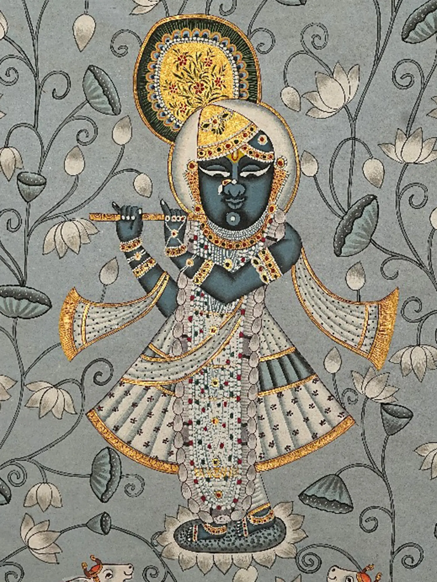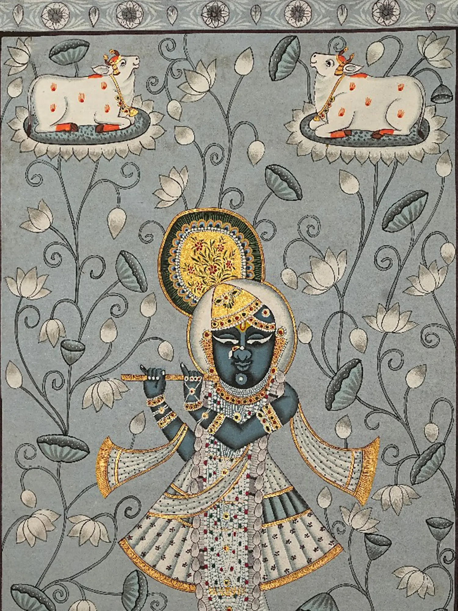 Rooted in the rich cultural heritage of Rajasthan, India, Pichwai paintings are traditionally used to adorn temples and homes, narrating stories of Hindu deities. This particular depiction draws from the devotional tradition surrounding Shrinathji, a revered form of Lord Krishna, often shown as a divine child. The artistic style evokes a sense of timeless devotion and spiritual narrative, connecting you to centuries of artistic and religious expression.