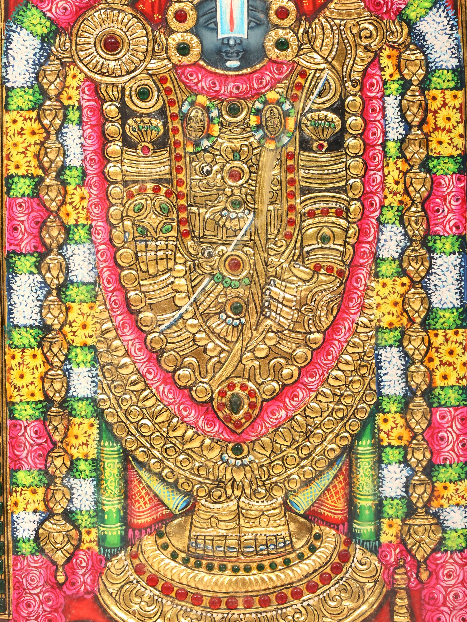 Embossed Tirupati Balaji (Venkateshvara) Tanjore Painting | Traditional Colors with 24 Karat Gold Work | With Frame