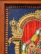 Tanjore paintings are renowned for their rich visual texture, vibrant colors, and the use of embossed foil work, particularly gold leaf. This art form, originating in the town of Thanjavur in Tamil Nadu, flourished during the Maratha rule in the 18th century. Tanjore paintings often depict Hindu deities, and their characteristic style involves inlaying semi-precious stones and decorating with intricate gold work. The effect is one of grandeur, divinity, and eternal beauty. The surrounding Prabhavali, or arch, features the Kirtimukha, a fierce, face-like mythical creature symbolizing protection and warding off evil. Its presence signifies the auspiciousness and protective aura of the divine image.