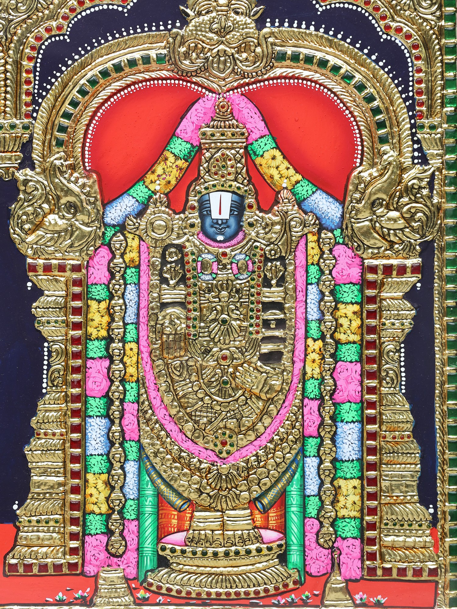 Tanjore Painting Of Standing Lord Tirupati Balaji With Embossing Work | Traditional Colors With 24K Gold | Teakwood Frame
