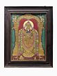 A majestic Tanjore painting depicting Lord Venkateshvara, also known as Balaji, who is the presiding deity of Tirumala Temple at Tirupati in the Andhra Pradesh state of India. He is considered to a form of Lord Vishnu who appeared on the earth in Satya Yuga to reestablish dharma and deliver the ignorant atheists. Daily thousands and lakhs of devotees come to take His blessings at this temple and get absorbed in His love and devotion. The true essence of South Indian artwork can be distinctly seen in this painting.