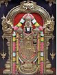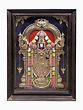 Venkateshwara is the most popular deity of south India on whom successive dynasties of kings of Tamilnadu, Andhra Pradesh and Karnataka had lavished munificent grants and endowment. In this painting, four-armed Vishnu is seen standing on a lotus placed on a golden pedestal. In his two upper hands, he holds his Sudarshan Chakra and the Panchajanya Conch Shell, while his lower hands are in the boon-granting Varada Mudra and resting posture. A serpent is also wrapped around each of his upper arms. The arched eyebrows, gently lowered eyes, and full lips give the deity’s countenance the calm and introspective look as seen on the Chola bronzes. The two golden gleaming lamps are shown on both sides. The Tanjore painting of Venkateshvar is not only gilded in gold but has a thick paisley border on the side which magnifies the beauty of southern Indian Tanjore. Several little greens, white, and red gleaming stones have been embedded in the coating in such a way that they form the detailing in this painting, making it stand out.