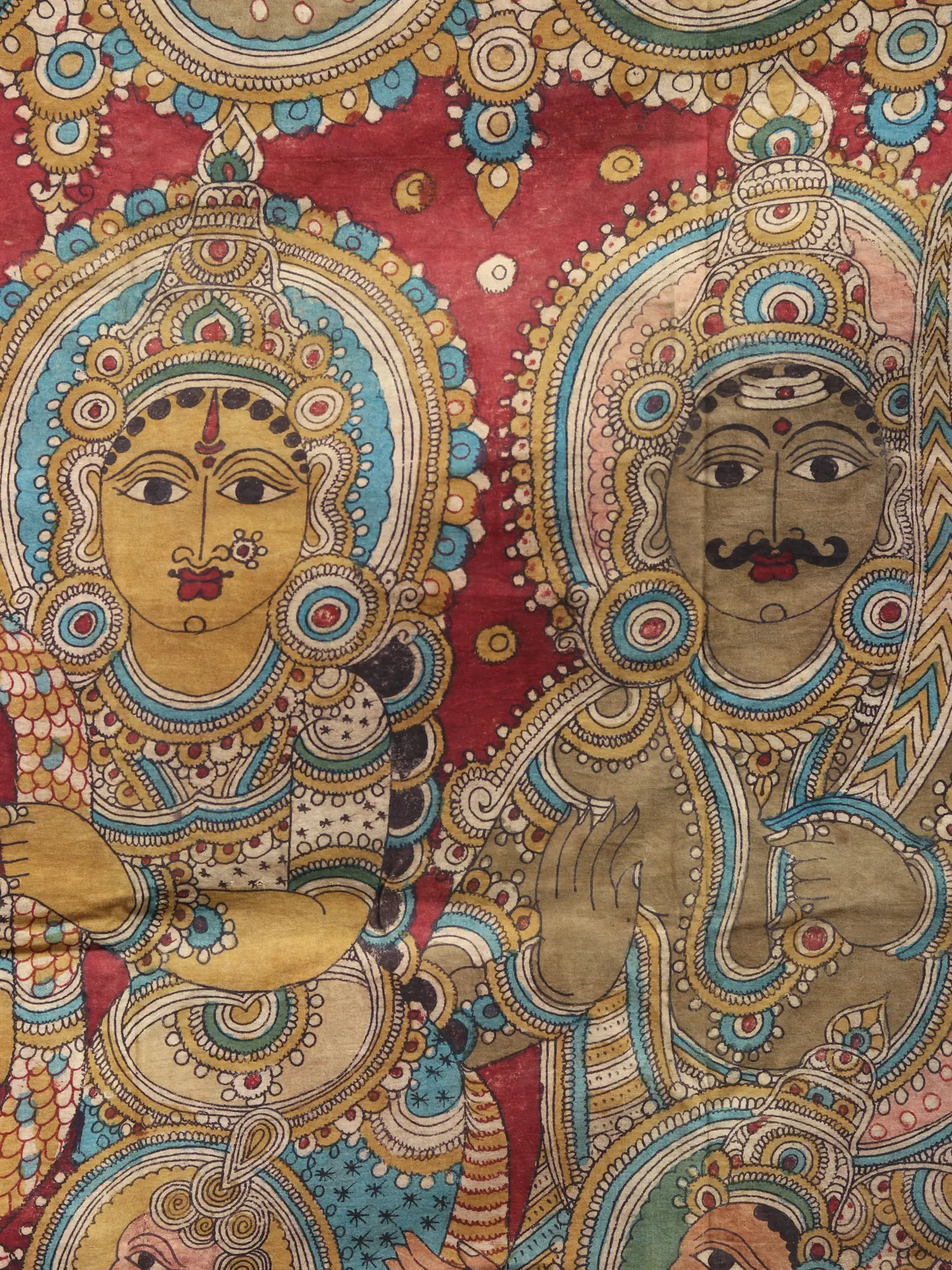 Each stroke of pigment on this Kalamkari artwork is a testament to generations of skill, meticulously applied to natural cotton. Artisans employ traditional techniques, hand-dyeing and painting with natural dyes to achieve a depth and vibrancy that synthetic mediums cannot replicate. The intricate detail and careful composition reflect a profound understanding of form and narrative, resulting in a piece that is both a visual masterpiece and a cultural artifact.