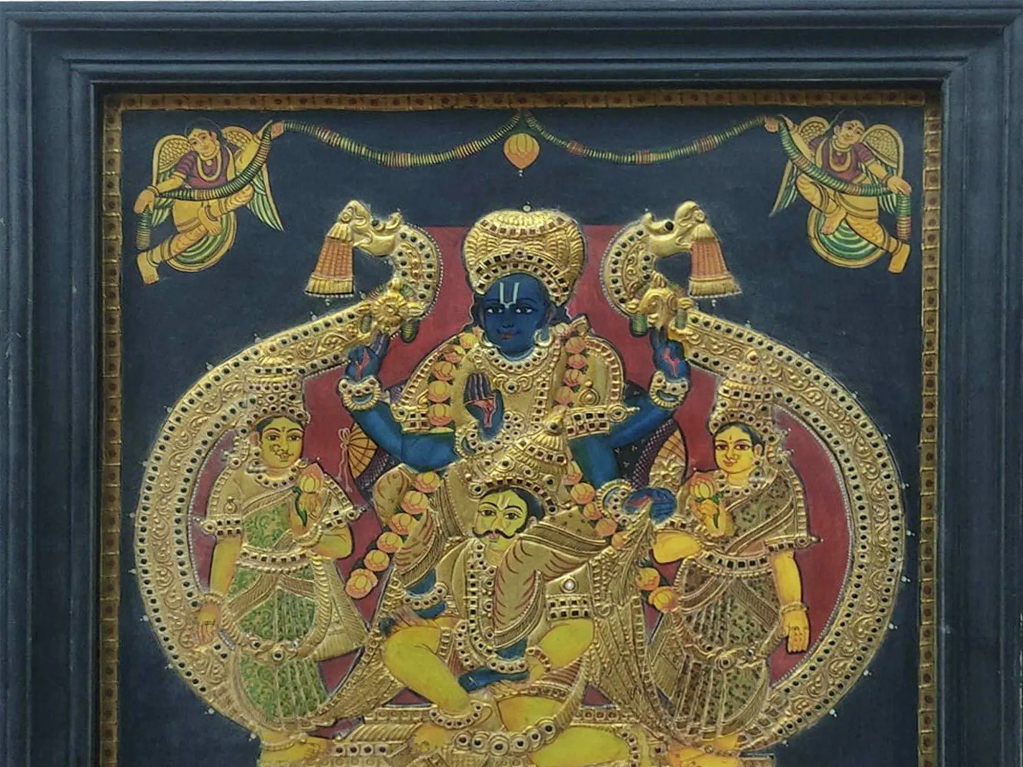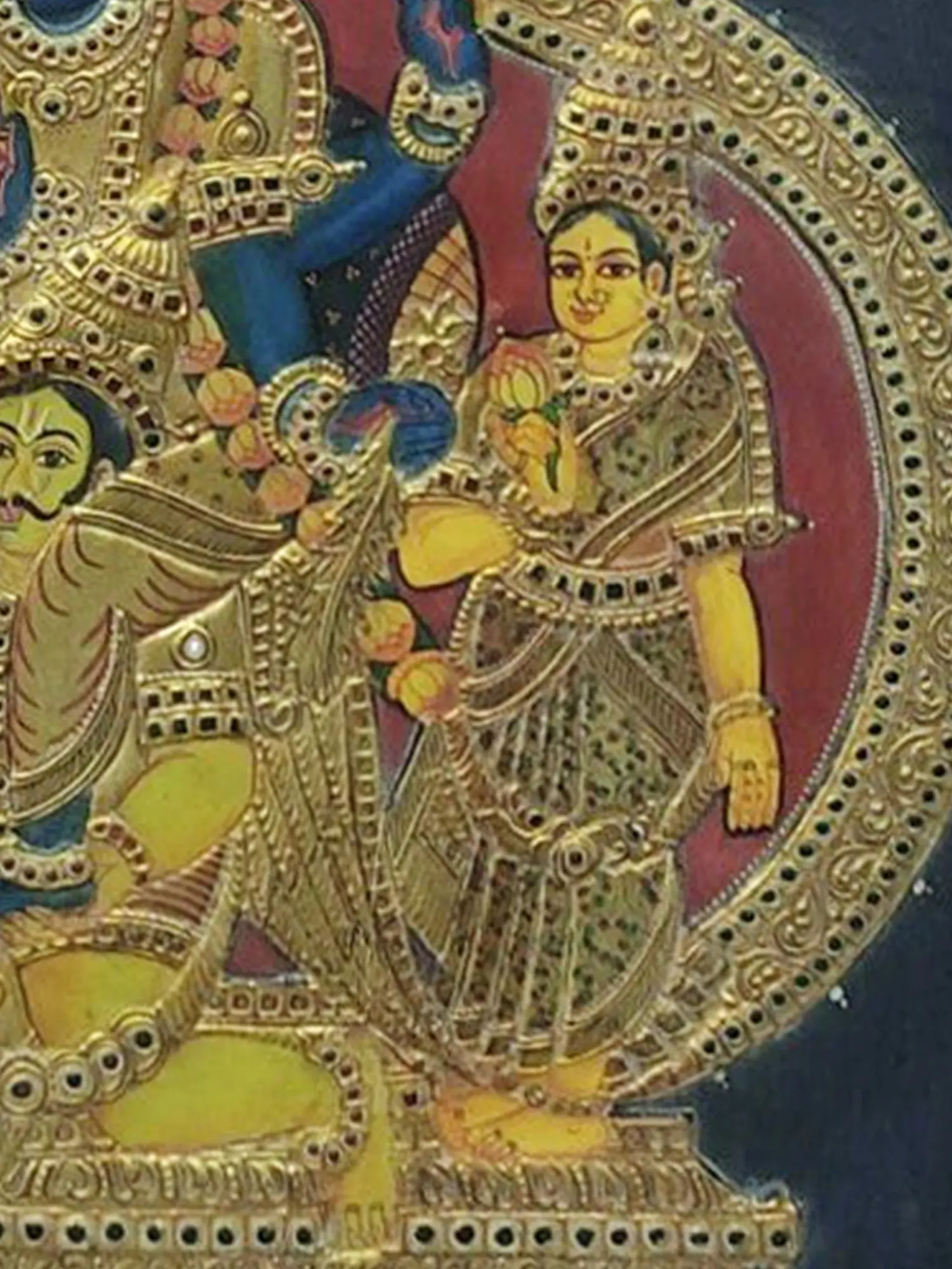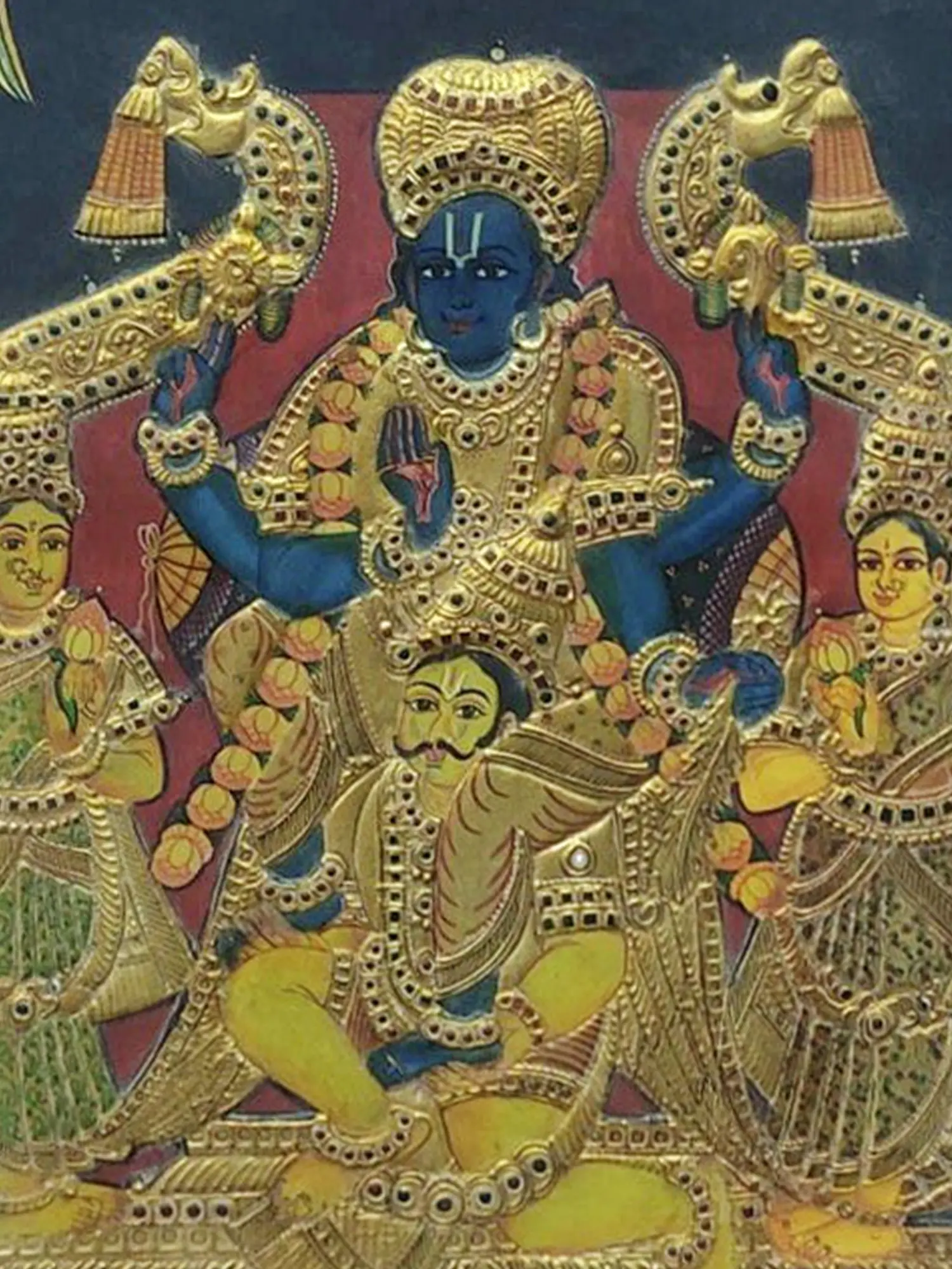 Nestled within the ornate wooden frame, the canvas unveils a celestial spectacle — Lord Vishnu, the Preserver of the Cosmos, enthroned atop his divine mount, Garuda. Flanking the Lord are the resplendent figures of Shridevi and Bhudevi, epitomising the grace and abundance of the divine realm. This Tanjore creation pays homage to the eternal connection between devotion and craftsmanship, inviting you to embark on a transcendent journey through the annals of tradition.