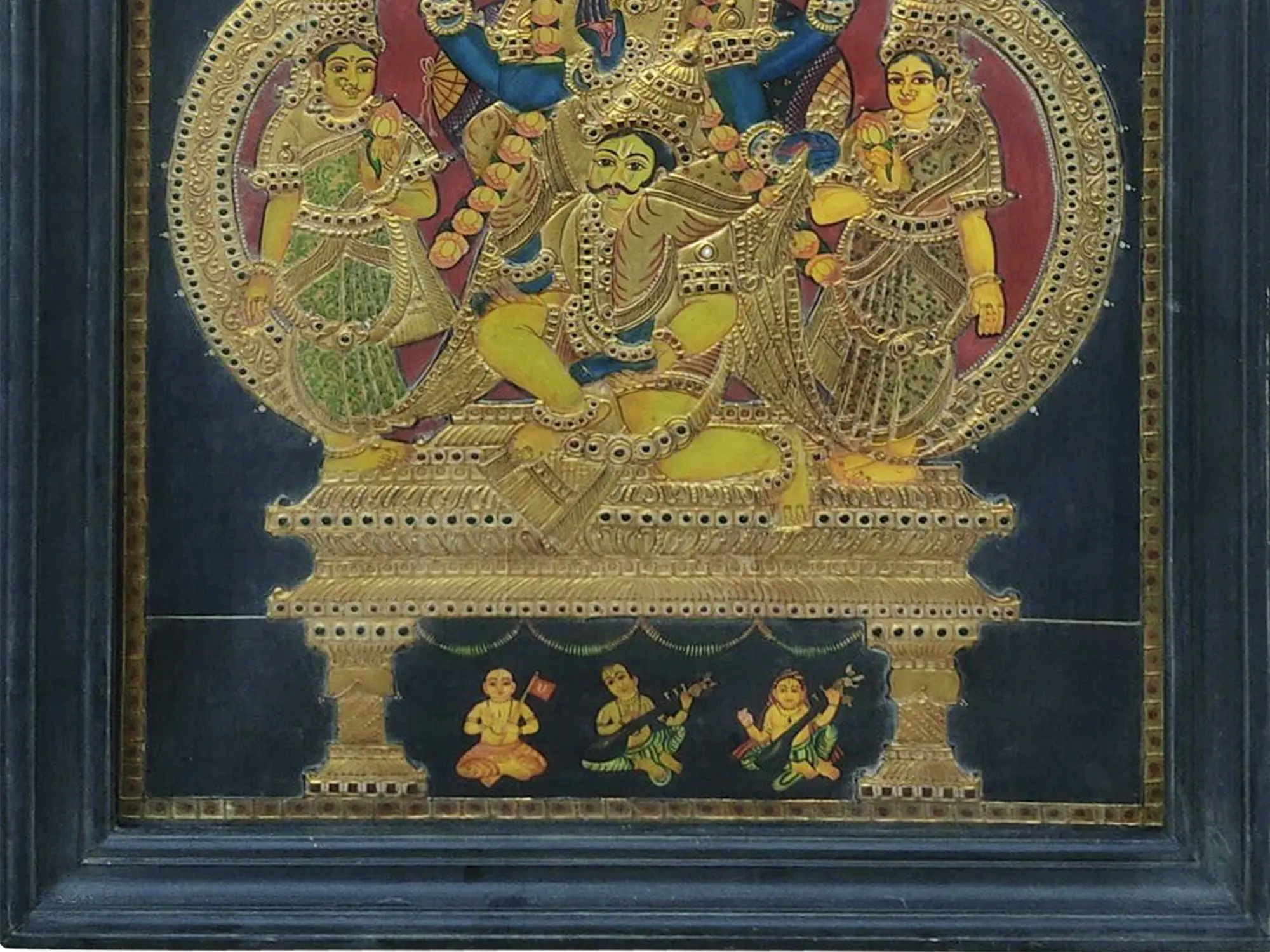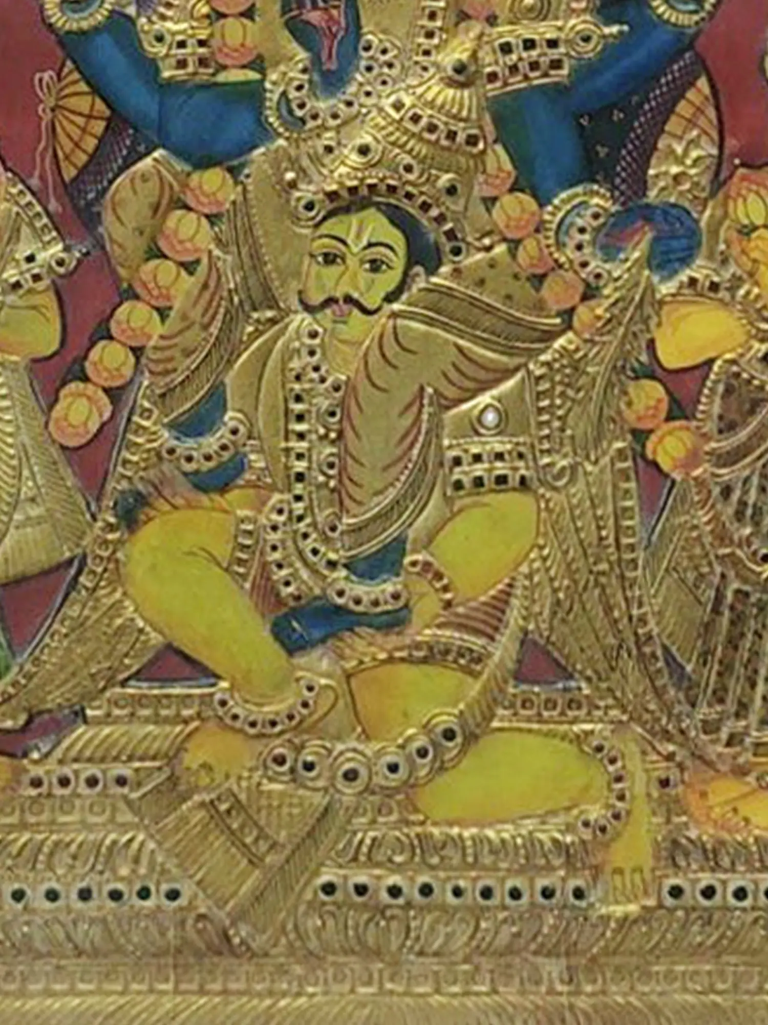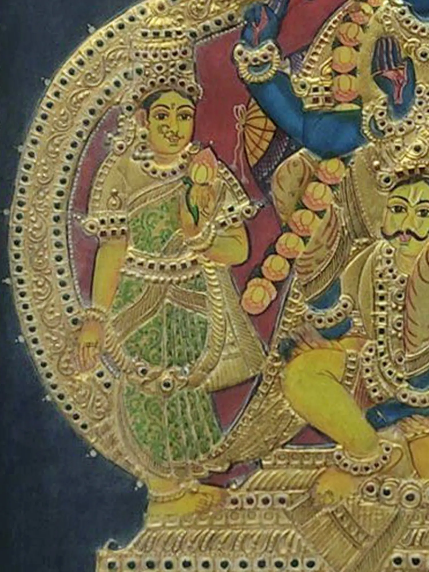 Nestled within the ornate wooden frame, the canvas unveils a celestial spectacle — Lord Vishnu, the Preserver of the Cosmos, enthroned atop his divine mount, Garuda. Flanking the Lord are the resplendent figures of Shridevi and Bhudevi, epitomising the grace and abundance of the divine realm. This Tanjore creation pays homage to the eternal connection between devotion and craftsmanship, inviting you to embark on a transcendent journey through the annals of tradition.