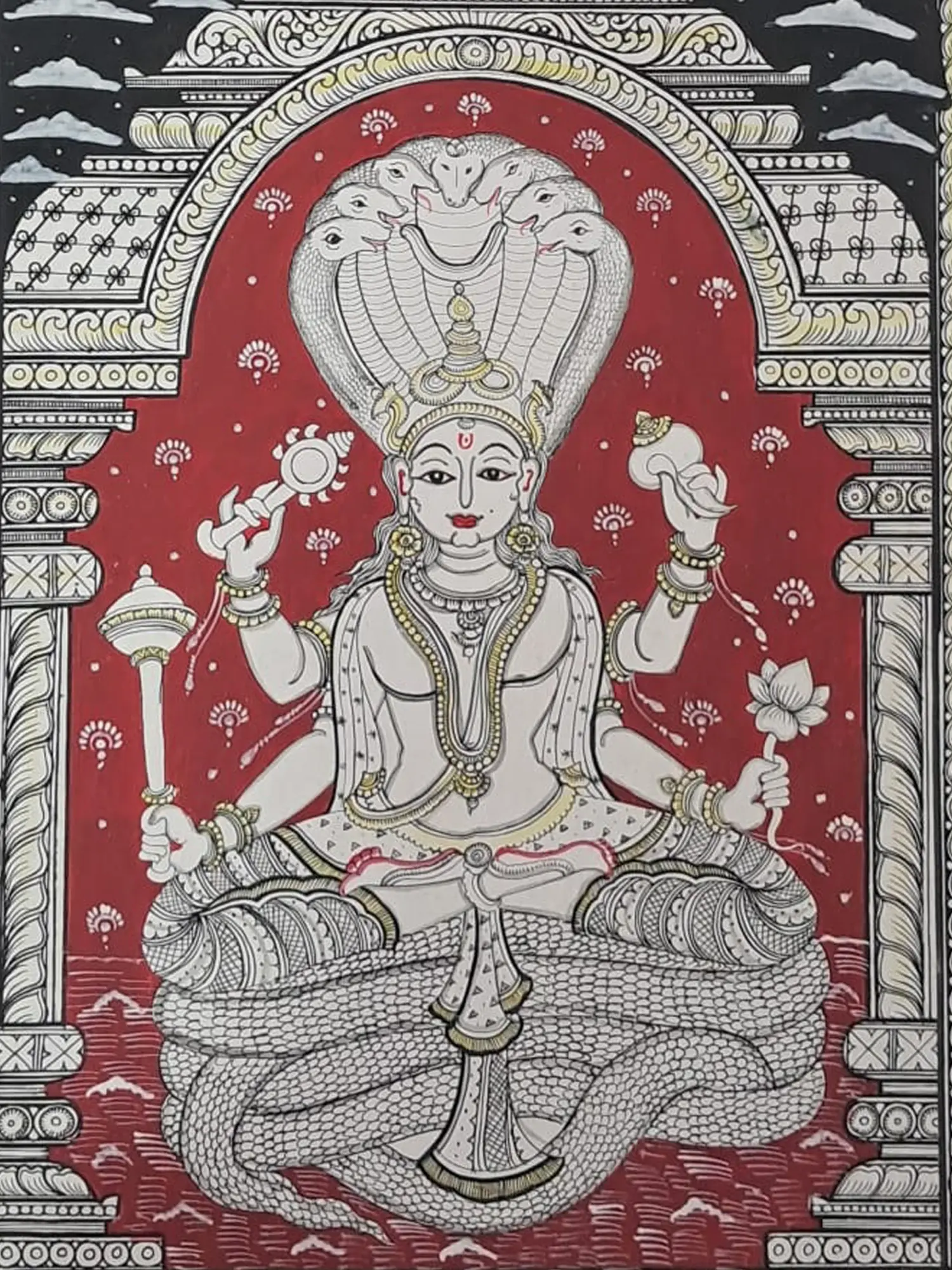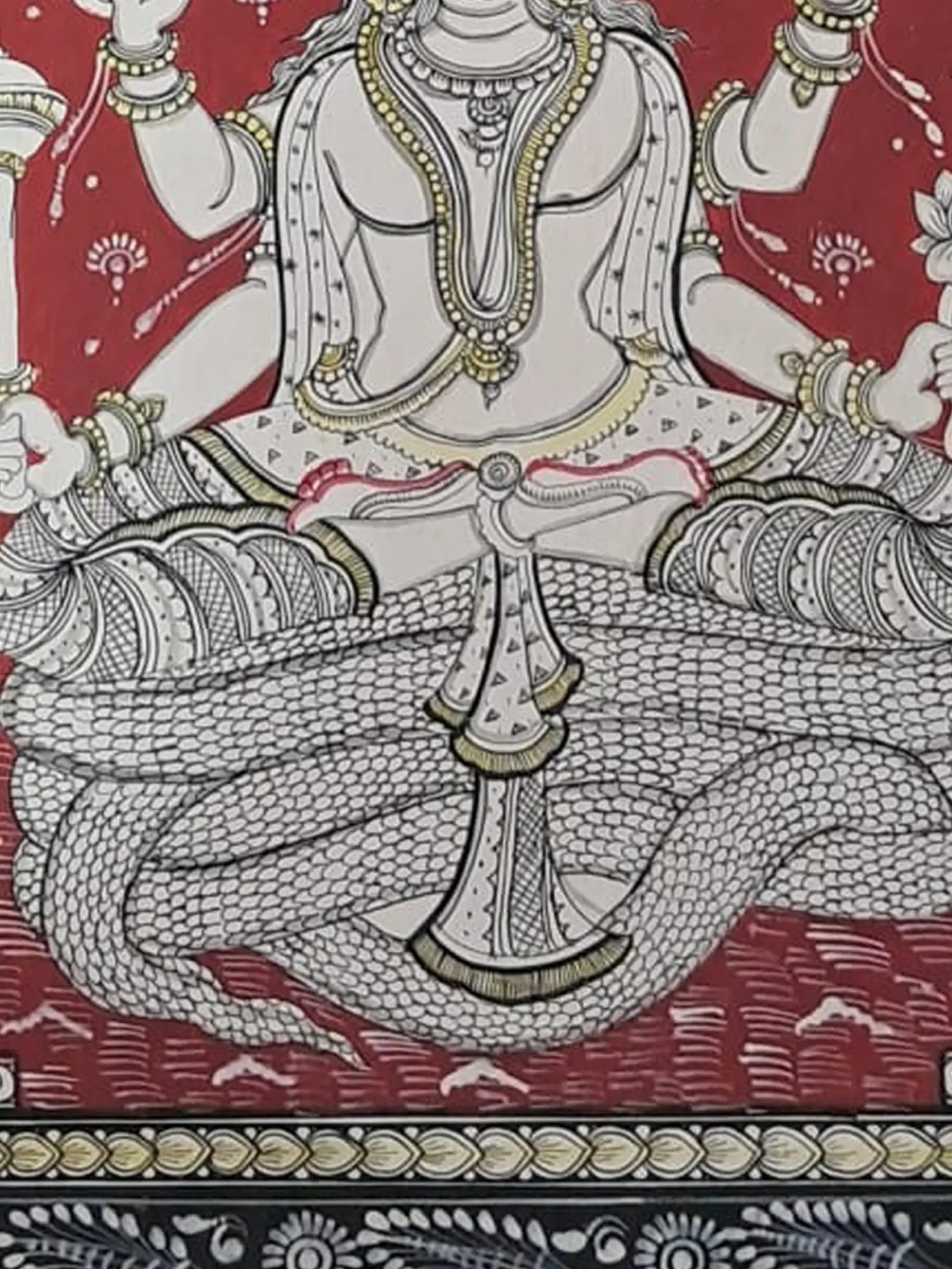 In this sacred rendition, which has been created by Surendra Nath Swain, Lord Vishnu, the sustainer and preserver of the universe, sits regally upon the coils of “Sheshnag,” the king of all serpents. Adorned with celestial grace, the Lord sits in “Padmasana,” his countenance suffused with serene omnipotence. Every single detail of this artwork, rendered in natural stone hues, whispers tales of cosmic harmony.