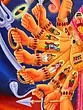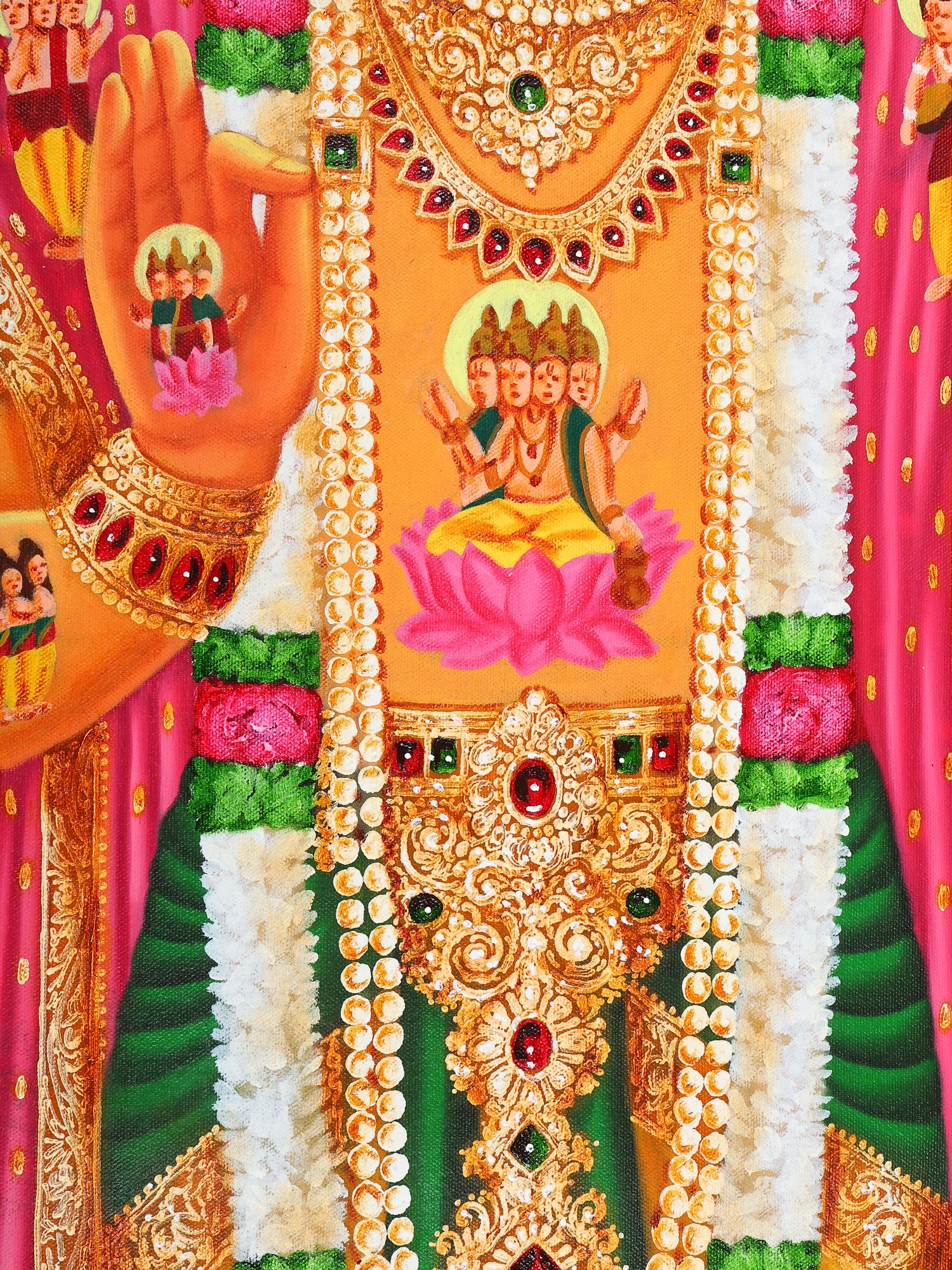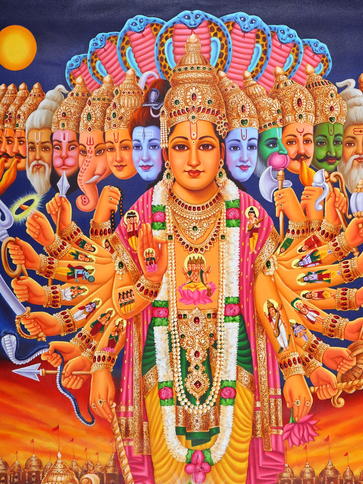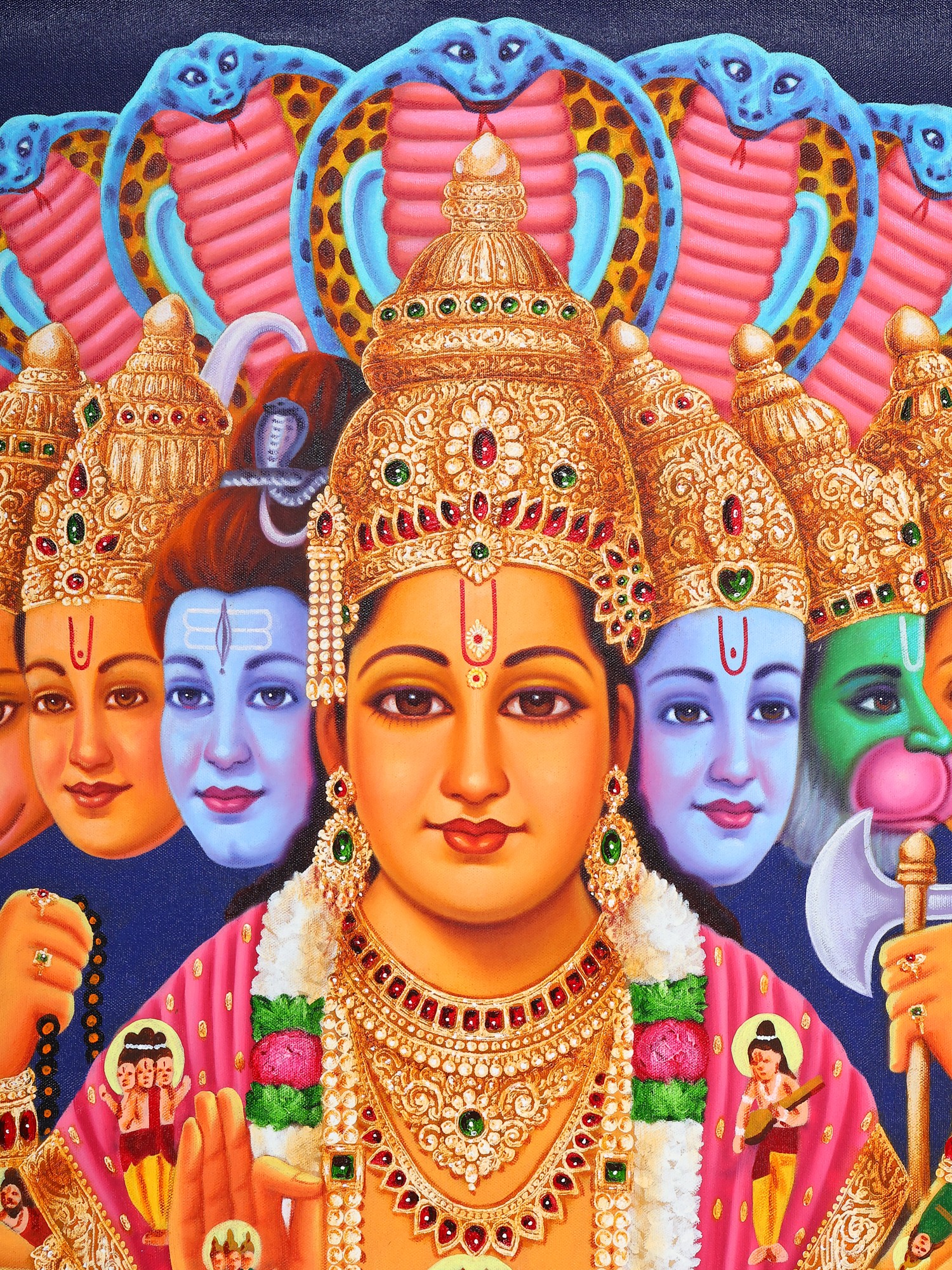 The Vishvaroopa is possessed of the heads of all the devas in the Hindu pantheon, from the wrathful to the equanimous. Above the row of gold crowns rises the multitude of hoods of the shashtanaga. Dressed in a gorgeously coloured dhoti and angavastram, the Vishvaroopa has an infinite number of limbs, each wielding a divine weapon against the onslaught of adharma. Statement gold adornments that convey the glamour of the Vishvaroopa, and the image of every imaginable deity on His skin and His attire and all over His very being.