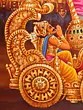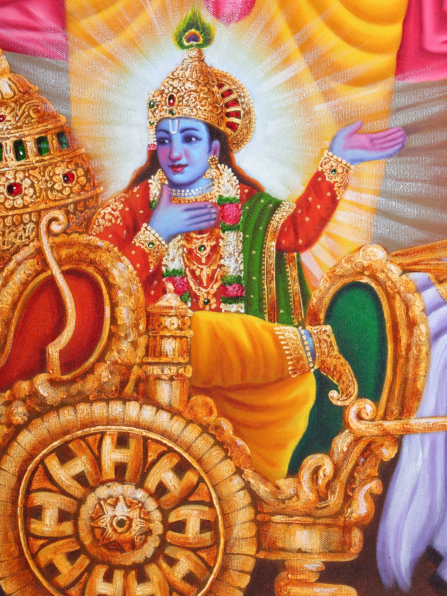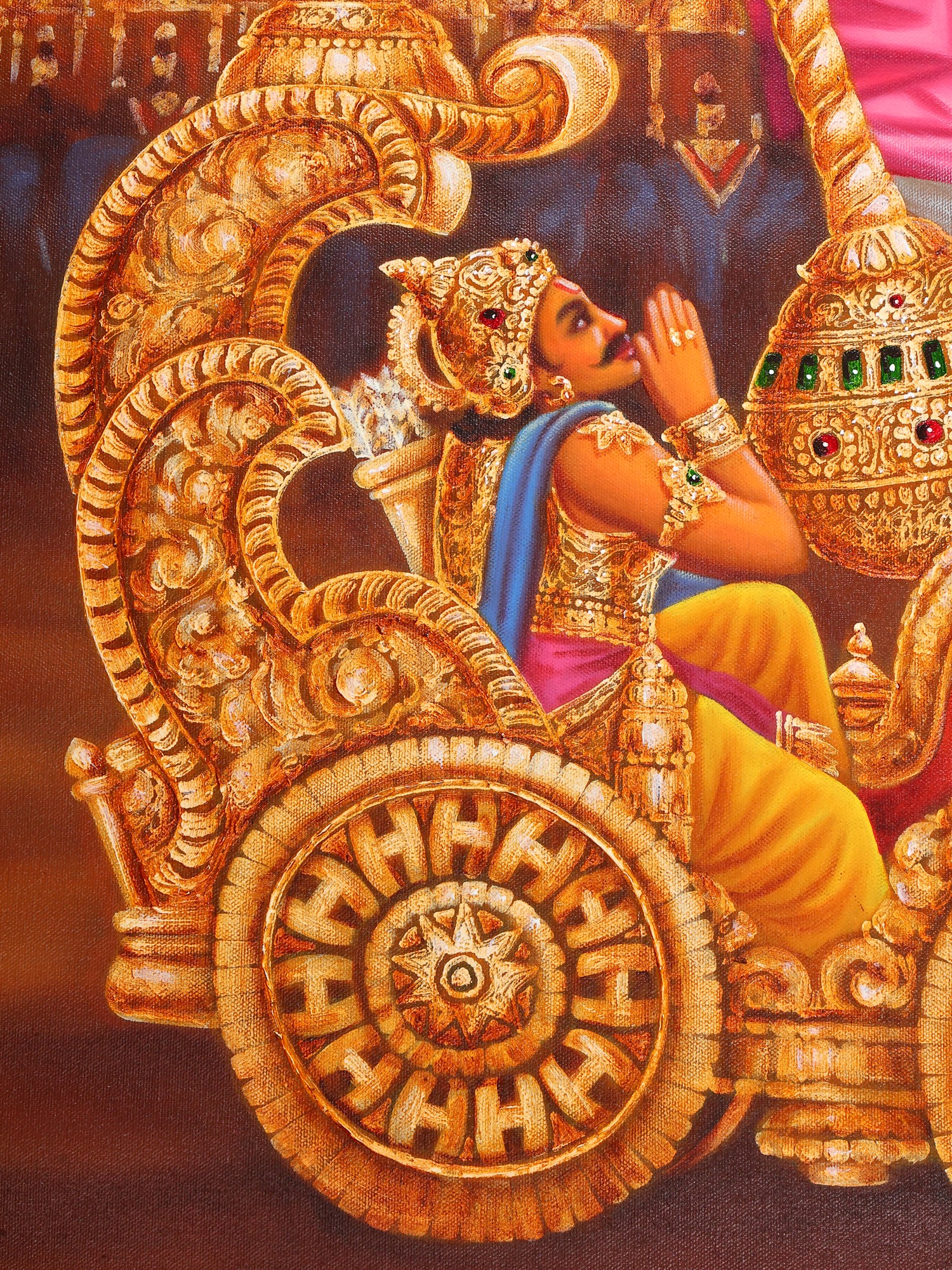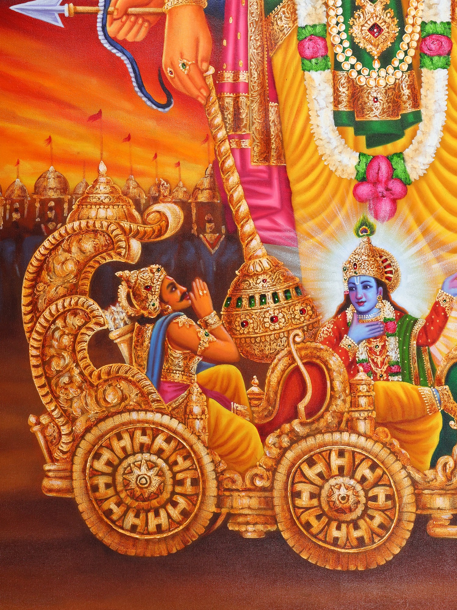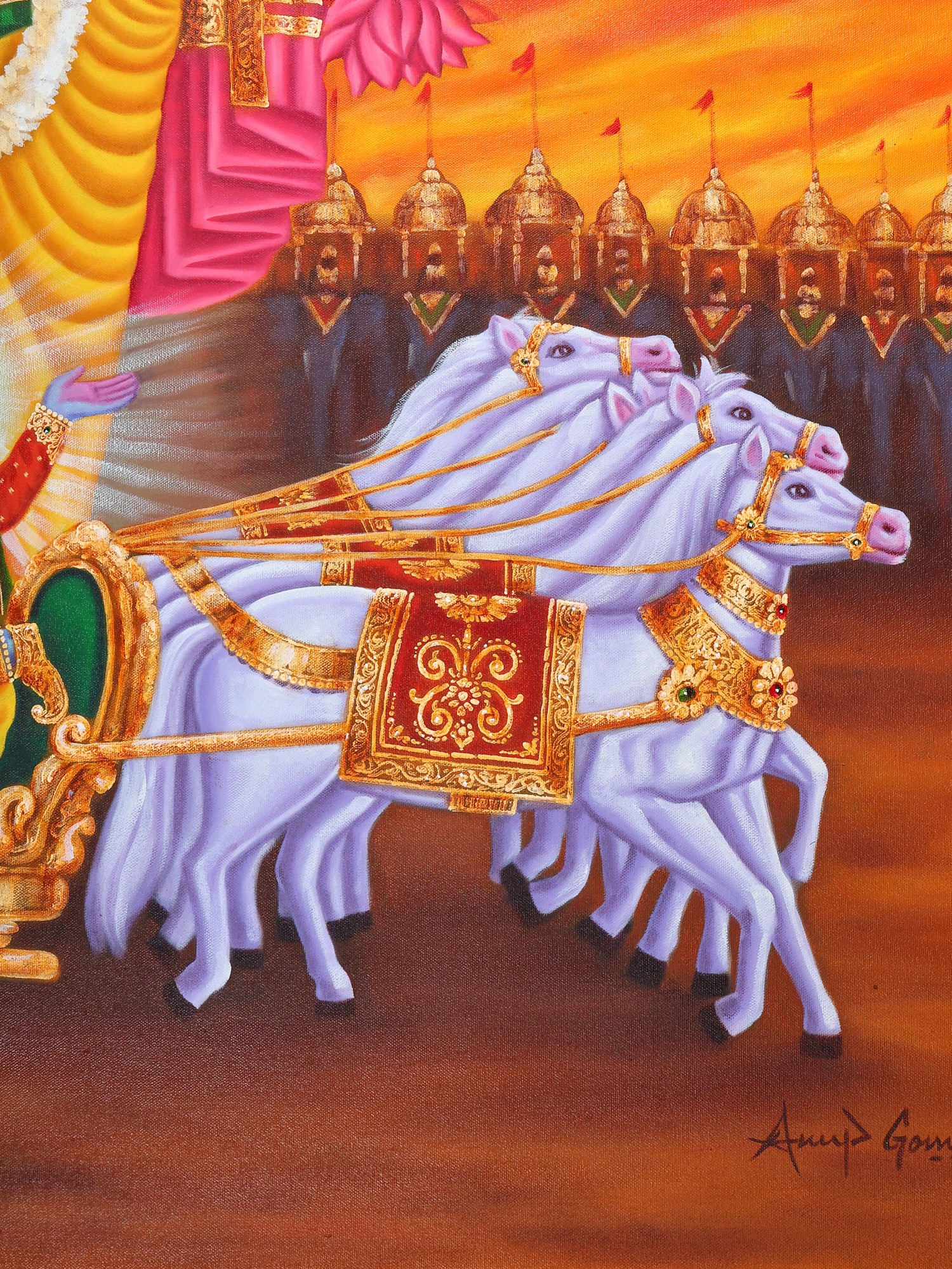 At His feet is the chariot of Lord Krishna who is responsible for the revelation. Arjuna is overwhelmed and looks up to Vishvaroopa with superlative devotion. In a chariot of gold drawn by milk white horses, he is on the verge of charging into battle and fulfilling his duty ordained by the divine. The background comprises a view of the extensive Kaurava army, their flags blending into the gold and blue of the heavens above.