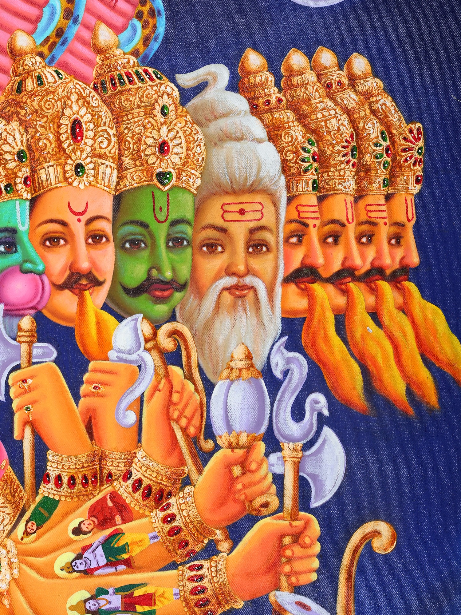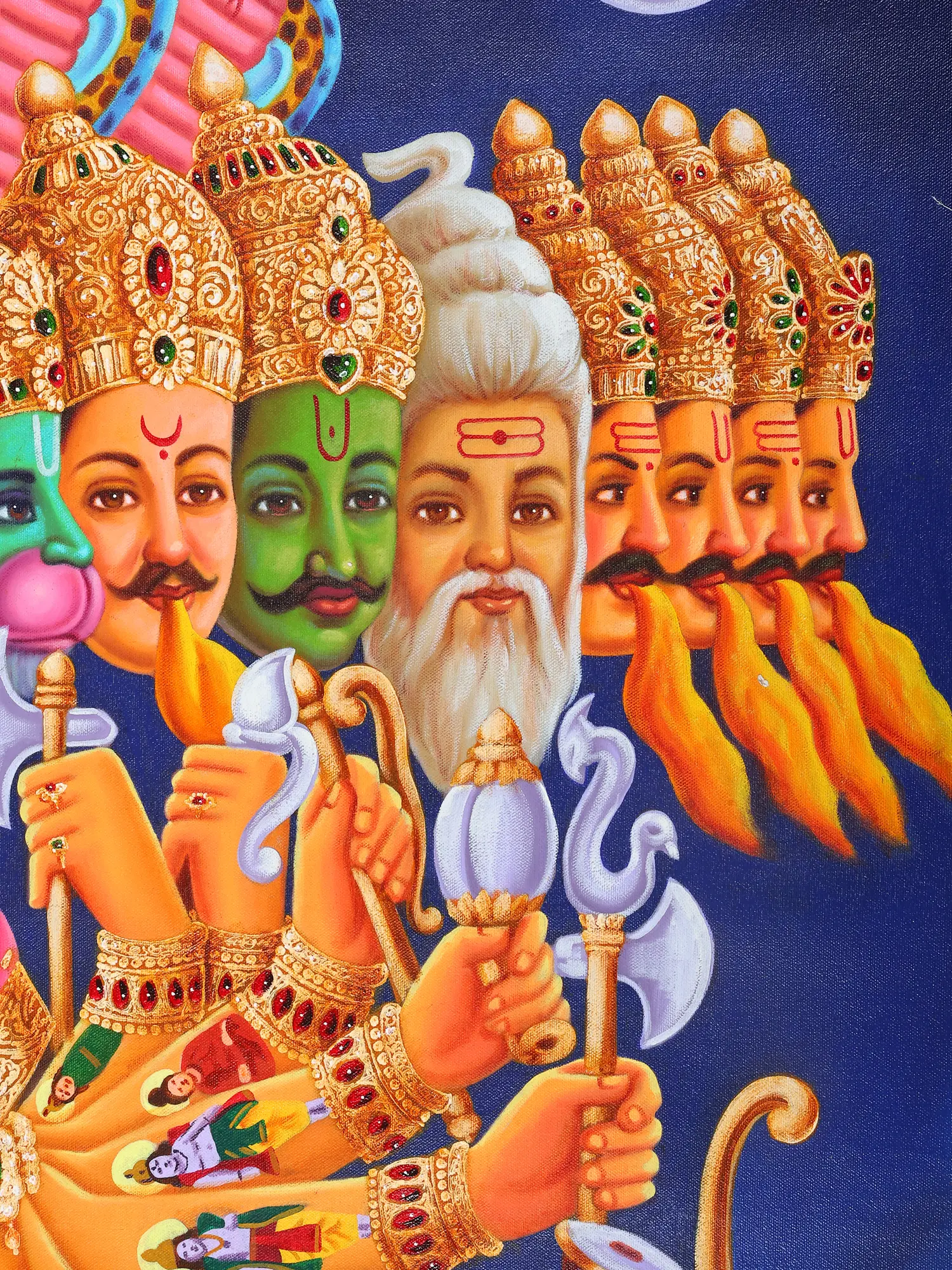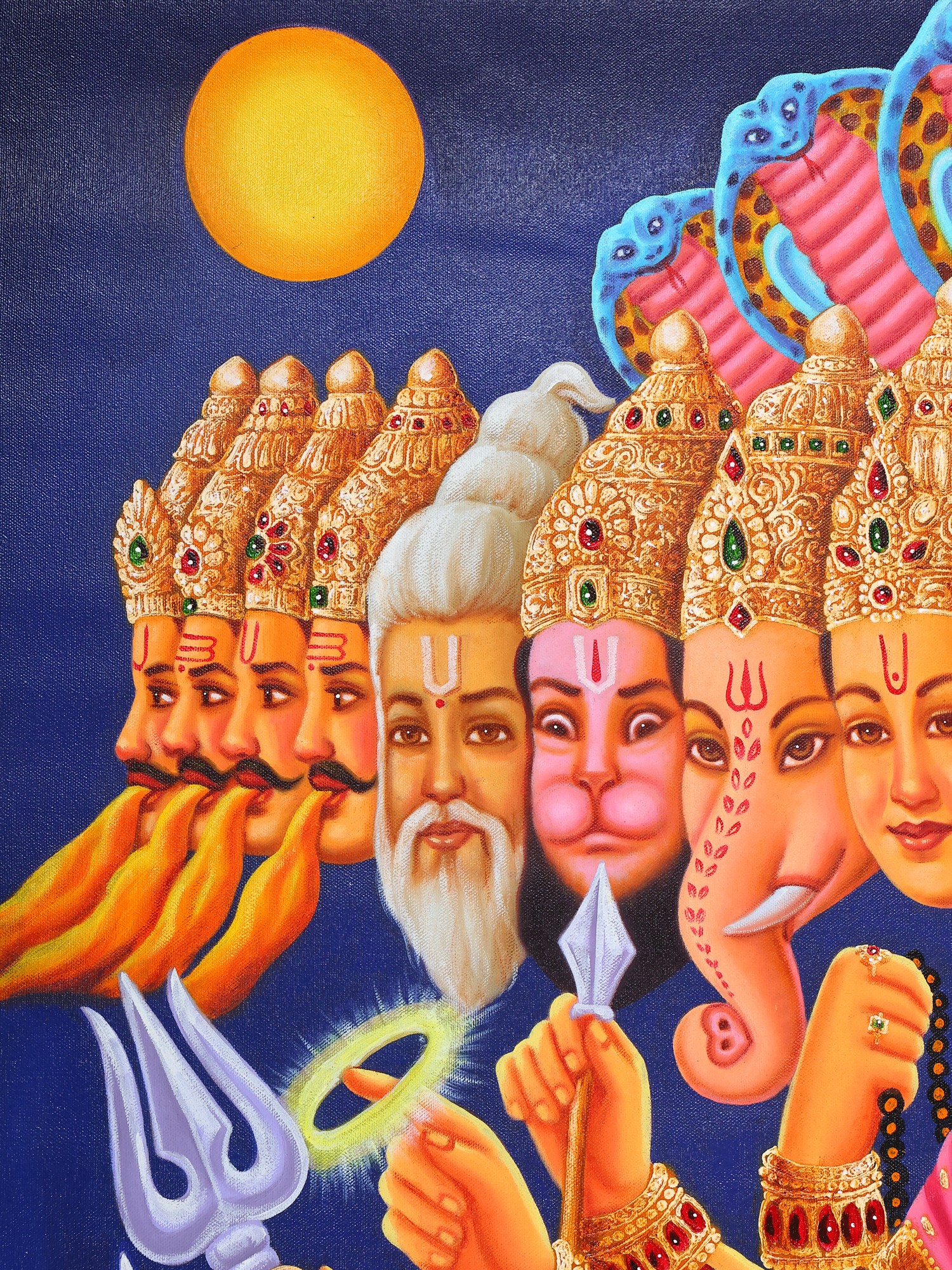 This exquisite oil painting on canvas captures one of the most profound and awe-inspiring moments in Hindu scripture. It depicts the awe-inspiring Vishvaroopa, the cosmic form of Lord Krishna, as revealed to the warrior-prince Arjuna on the battlefield of Kurukshetra. This pivotal moment, immortalized in the Bhagavad Gita, transcends ordinary understanding, offering a glimpse into the divine essence and the infinite nature of the Supreme Being. The canvas pulsates with divine energy. At its heart stands Krishna, radiating an otherworldly light, his central form serene and compassionate. Yet, this is no ordinary depiction. Surrounding him, cascading outwards, are myriad faces, each representing a different deity, element, or aspect of existence. Multiple heads of celestial beings and serpents form a radiant halo, symbolizing the boundless power and omnipresence of the divine. Numerous arms extend in all directions, each adorned with intricate jewelry and holding various divine weapons and symbols – the discus, mace, conch, lotus, and more – signifying the Lord's control over all creation and his ability to protect and destroy. The vibrant colors and meticulous detail bring to life the sheer magnificence and complexity of this universal form. The scene below places the viewer directly into the heart of the epic Mahabharata. Arjuna, humbled and awestruck, is shown in his chariot, his hands pressed in reverence. His charioteer, Lord Krishna, calmly guides the magnificent horses, the epitome of grace and divine intervention. The grand chariot itself, richly decorated, symbolizes the vehicle of destiny and the path of righteousness. The backdrop of an impending battle, with armies arrayed in the distance and a fiery sunset casting dramatic shadows, underscores the immense significance of this divine discourse. The moon and sun in the sky further emphasize the cosmic scale of the revelation, indicating that this vision encompasses all of time and space. This artwork is more than just a painting; it is an invitation to contemplate the infinite. It draws inspiration from tales where divine beings unveil their true forms to mortals, such as when the goddess Durga revealed her terrifying and glorious form to the gods to vanquish the demon Mahishasura. The Vishvaroopa is the ultimate manifestation of God's all-encompassing nature, a vision that can bestow liberation and profound spiritual understanding. It speaks to the ultimate reality that lies beyond human perception, the source from which all things originate and to which all things return. This painting serves as a powerful reminder of the divine within and around us, a testament to the eternal truths of existence.