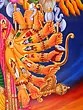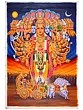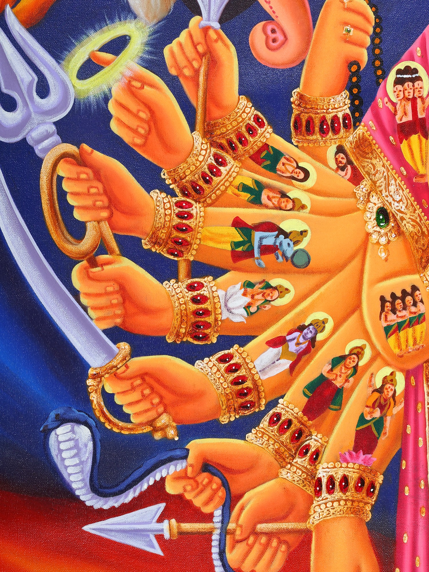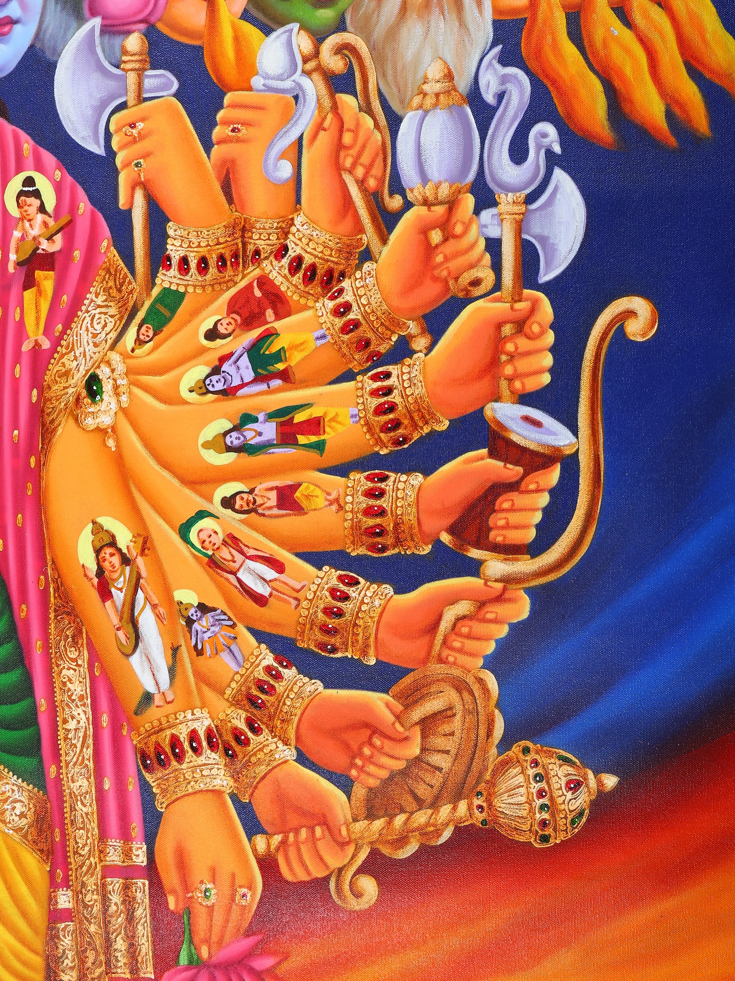 In the nick of time, the Vishvaroopa is revealed to the pandava Arjuna. Of the numerous Vishvaroopas (theophanies of Lord Vishnu), the one that you see on this page remains the most legendary. For the erstwhile prince of Hastinapura, it transformed a moment of abject weakness into fuel for triumph. This life-sized oil painting captures the Vishvaroopa, which sprung to the vision of Arjuna in the thick of battle at Kurukshetra and set the warrior-prince upon the irreversible path of his dharma.