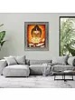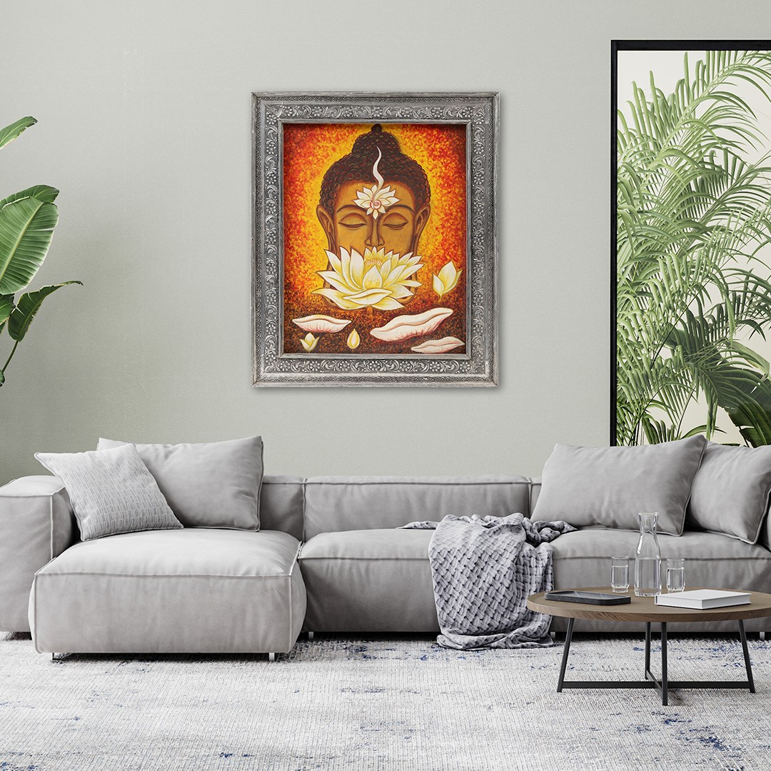 The Lotus Buddha Oil Painting is delicately surrounded by a silver frame covered with intricately carved flowers and vines, and it represents serenity and wisdom. Yellow and red royal colours decorate the background, lending the artwork a majestic air.