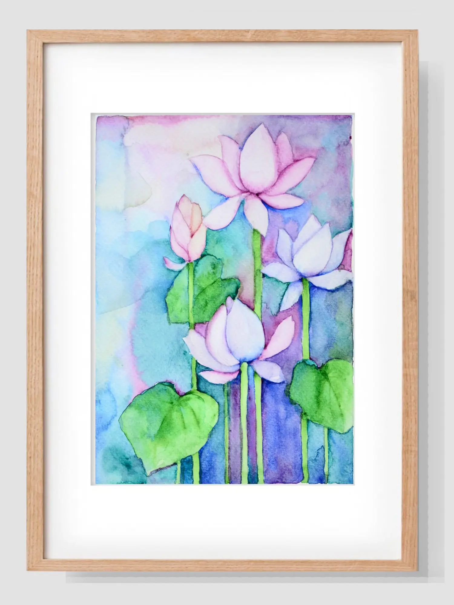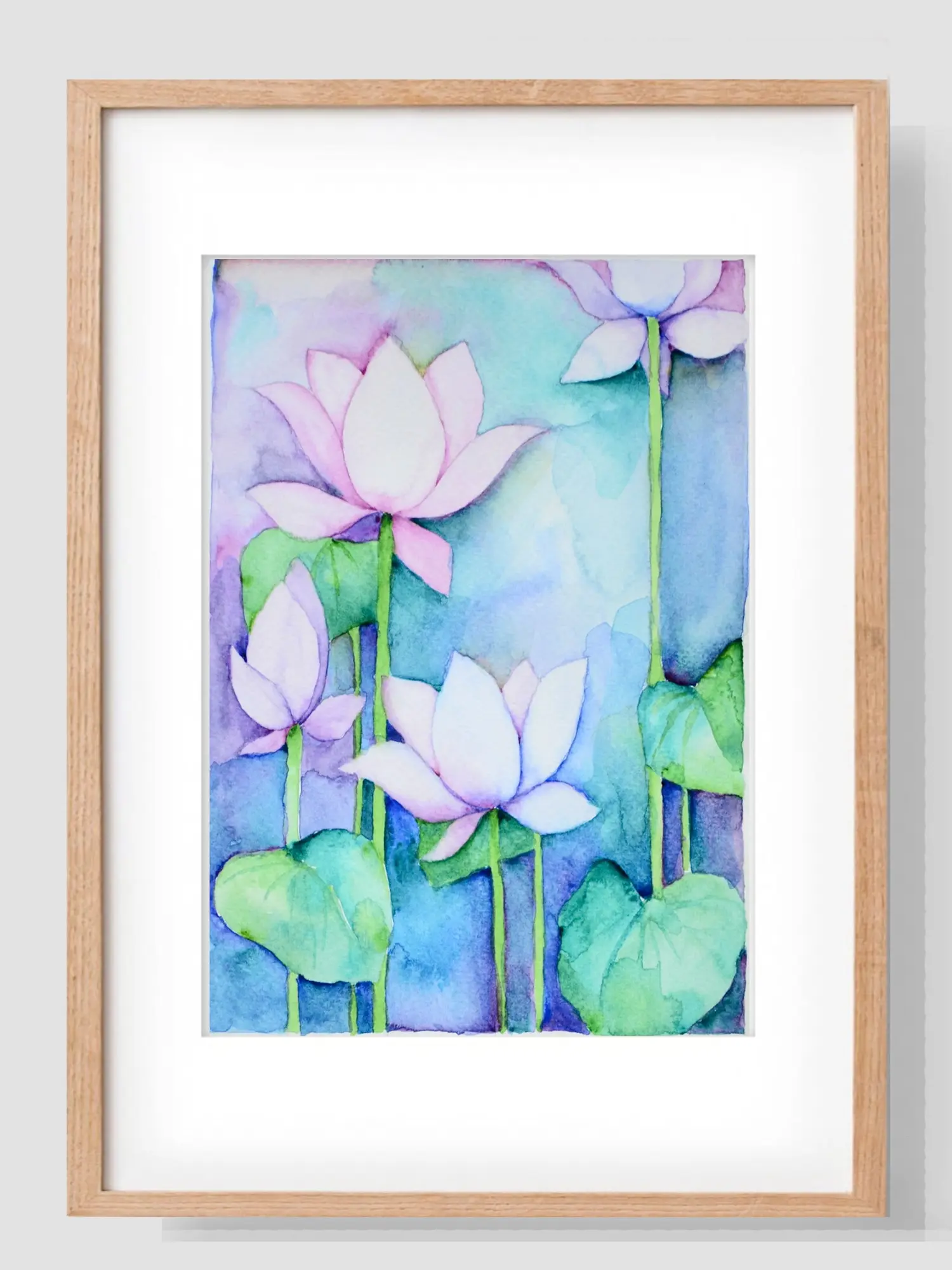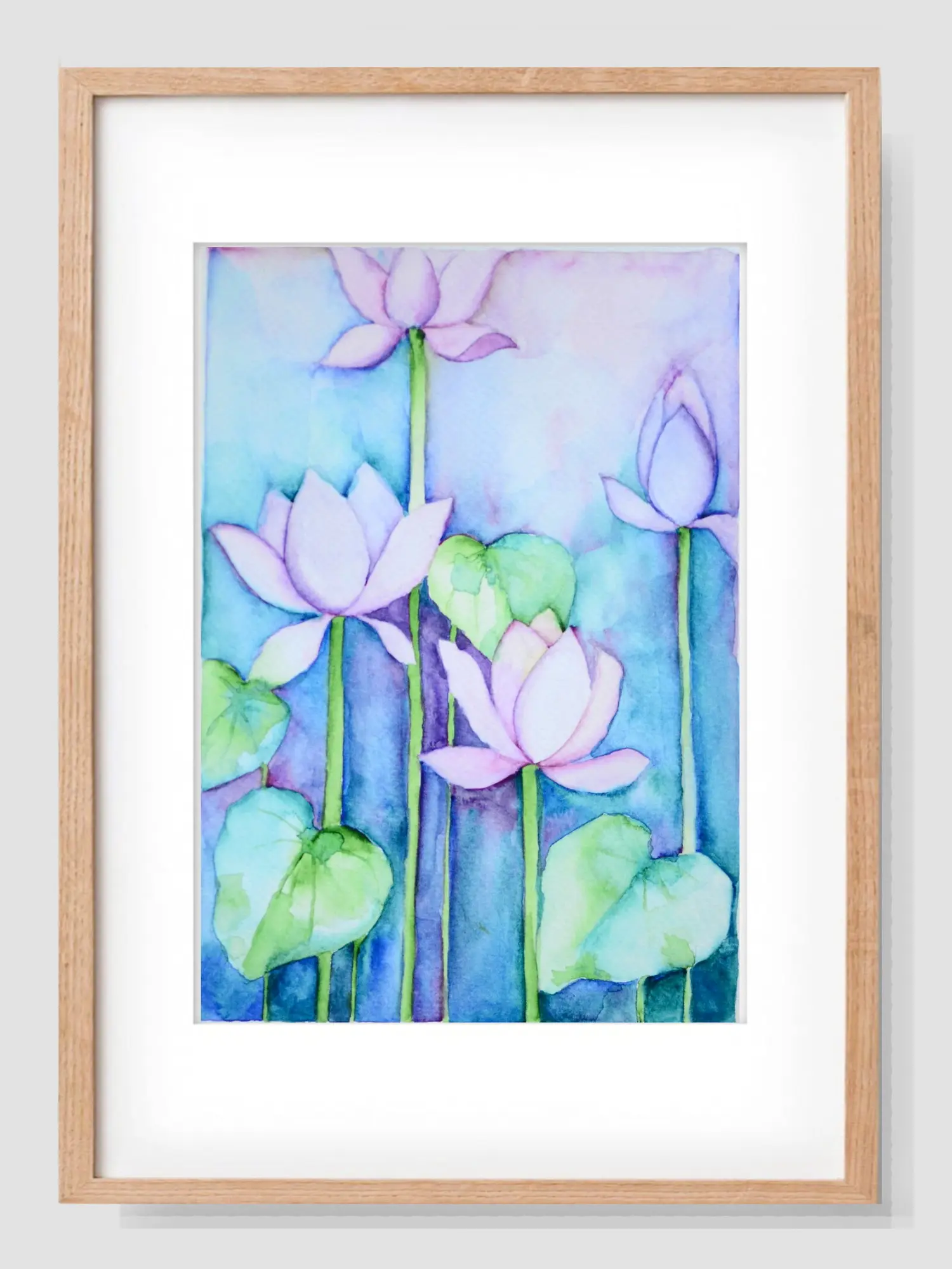 Observe the tender petals unfurling, each brushstroke conveying a sense of graceful movement. The interplay of soft purples, blush pinks, and cool blues creates a dreamlike atmosphere, while the vibrant greens of the lily pads anchor the composition with naturalistic charm. Each piece measures 8.00 inches in height and 5.00 inches in width, offering a versatile scale that allows for intimate contemplation or a striking visual statement.