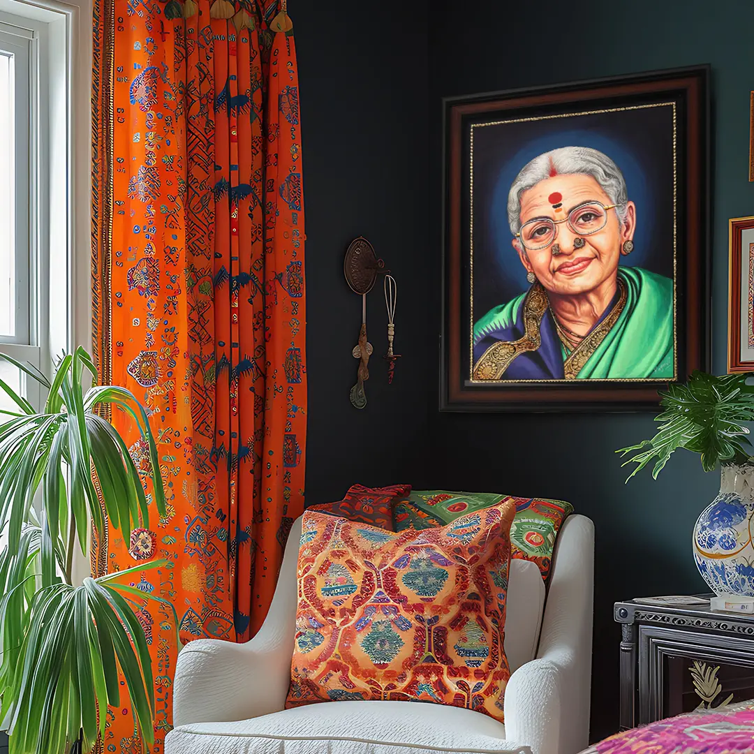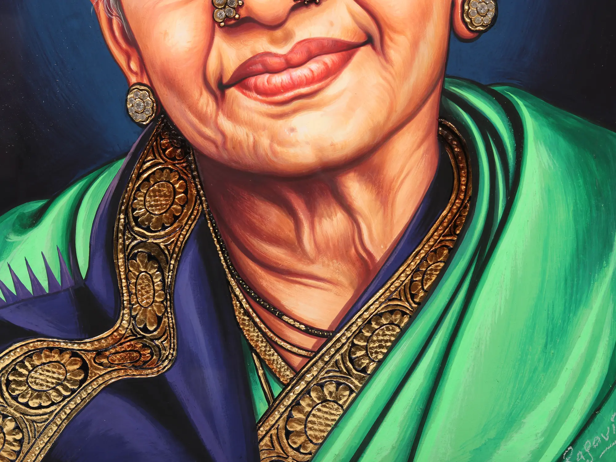 Celebrate the legendary M. S. Subbulakshmi with this beautiful Tanjore portrait that transcends mere likeness. Her soulful gaze and poised demeanour resonate with the power of music to touch our hearts and elevate our spirits. In her image, we find a connection to the timeless melodies that still resonate in the echoes of time through Carnatic talams.