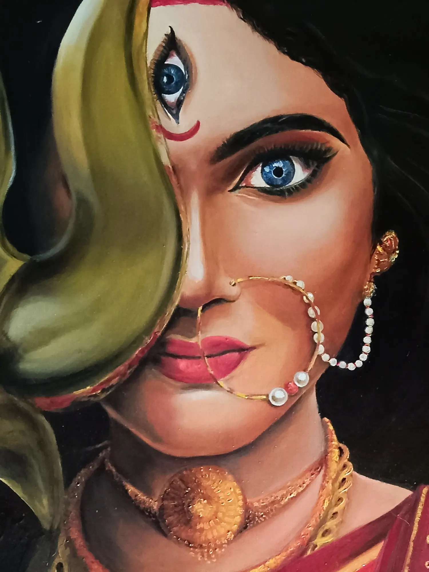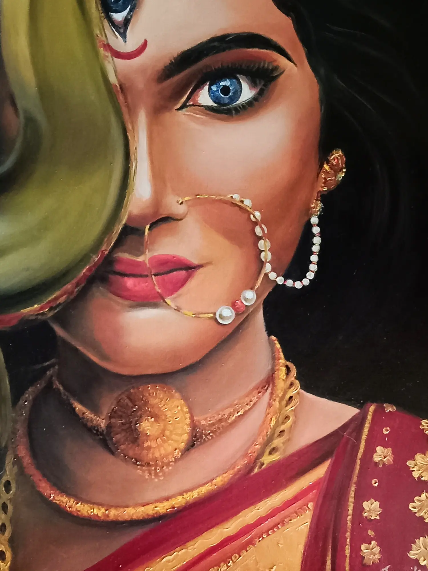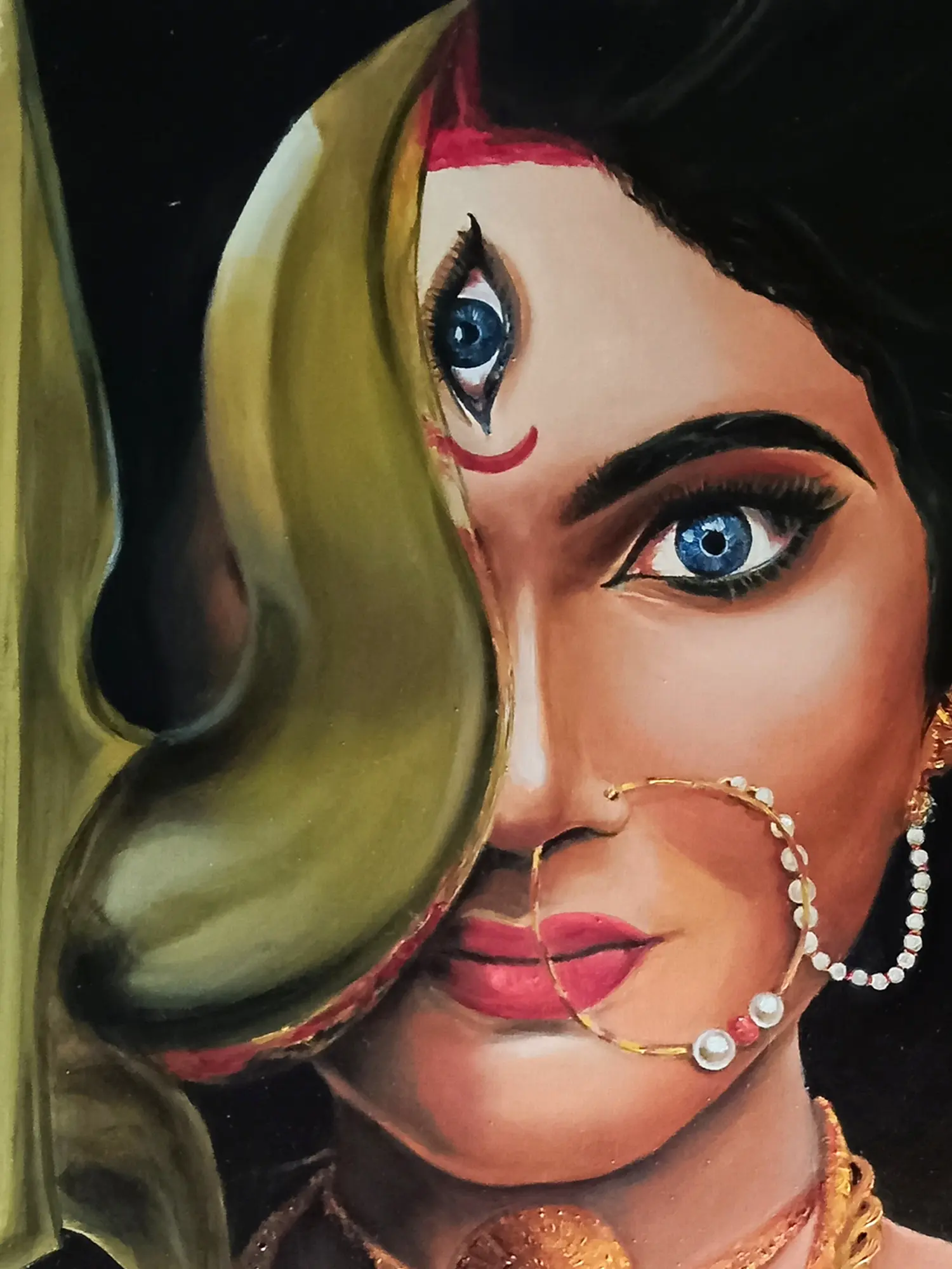 In Souvik Hazra's oil-on-canvas masterpiece, the depiction of Goddess Durga transcends conventional boundaries, capturing the trinayani or three-eyed aspect with finesse. The exquisite portrayal ingeniously utilizes symbolism, with the Trishul covering half of Durga's face, symbolizing Lord Shiva's blessings. The other half reveals beautifully rageful eyes, exuding controlled anger that radiates a sense of protective strength.