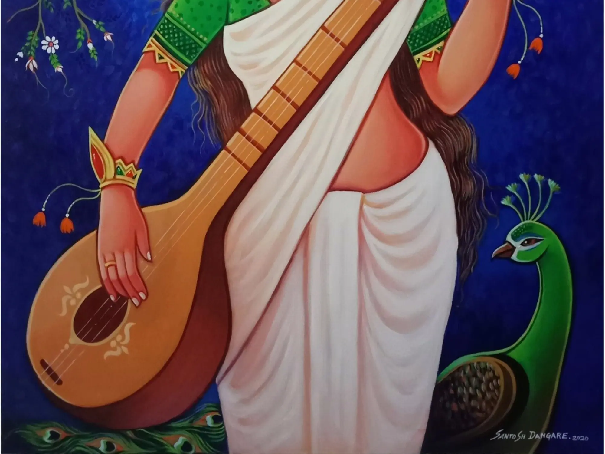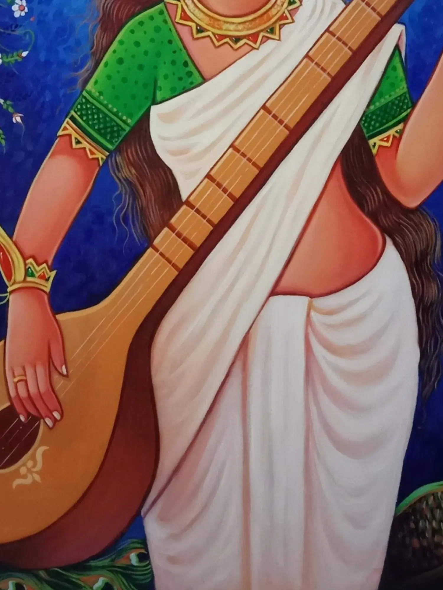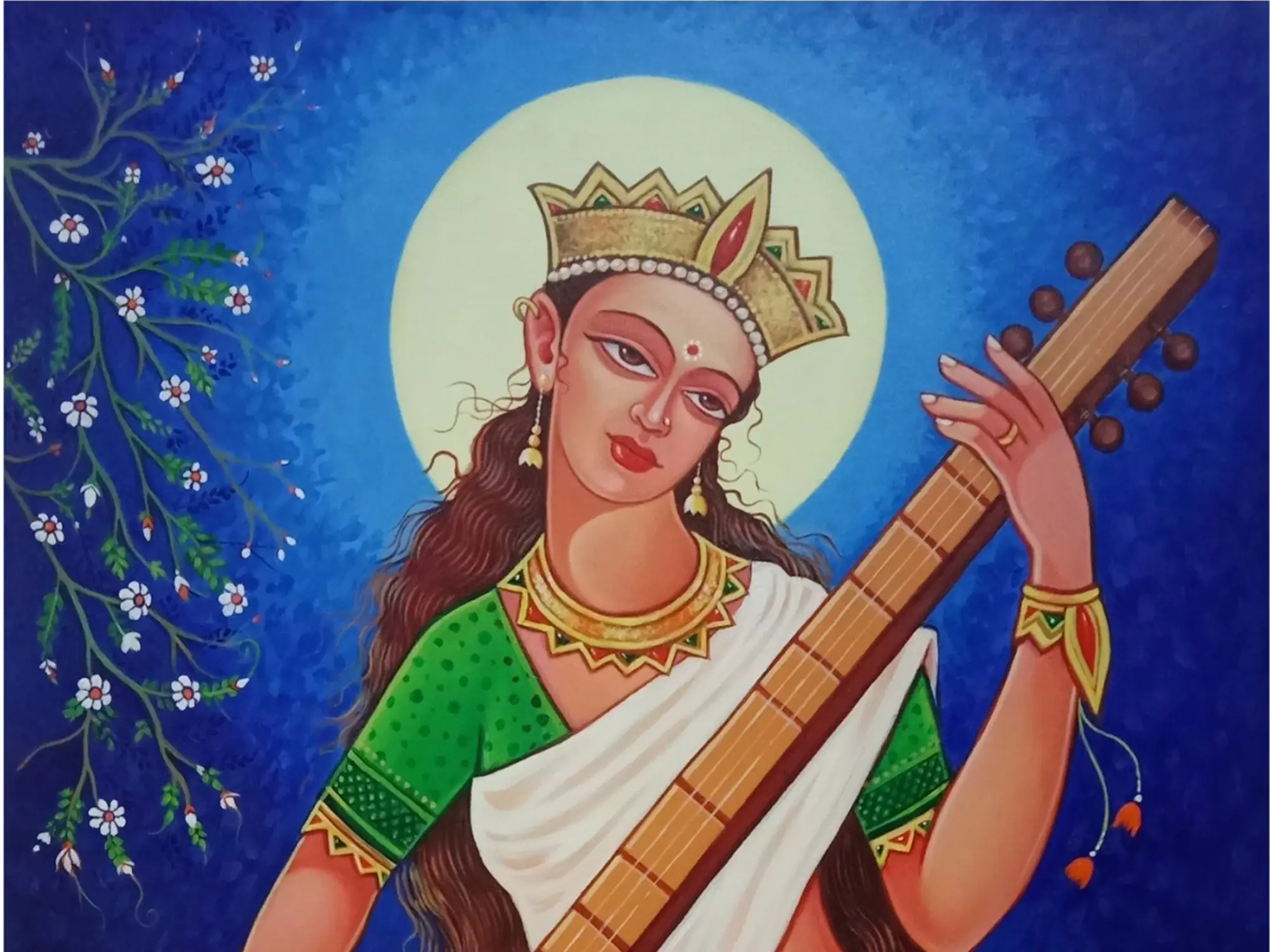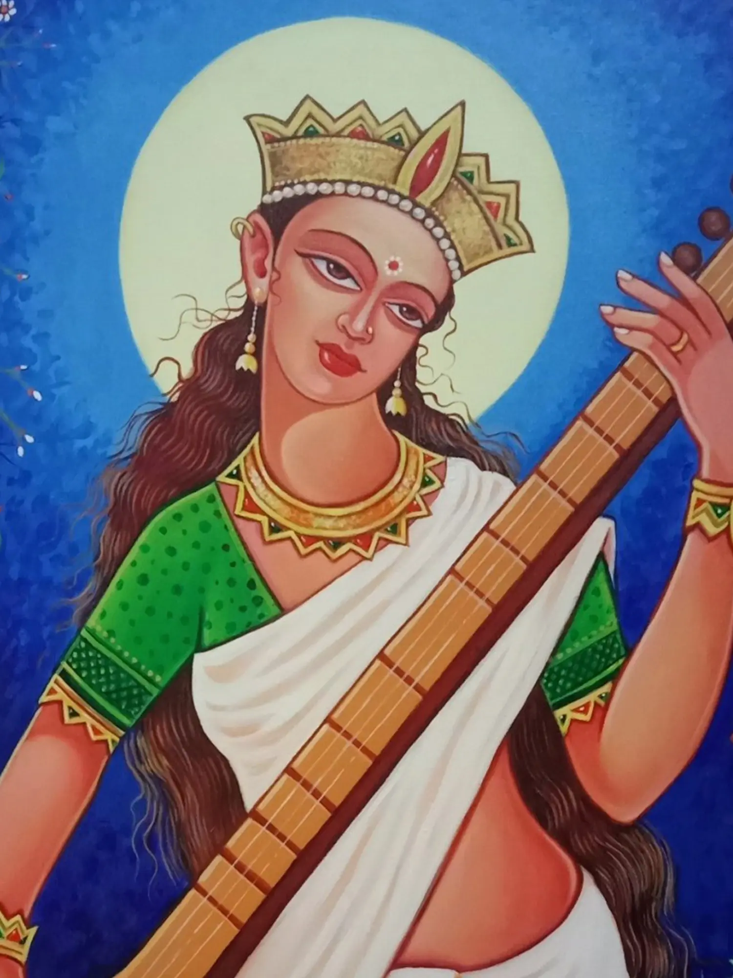 canvas, the goddess Saraswati appears as the abode of purity, divinity, and