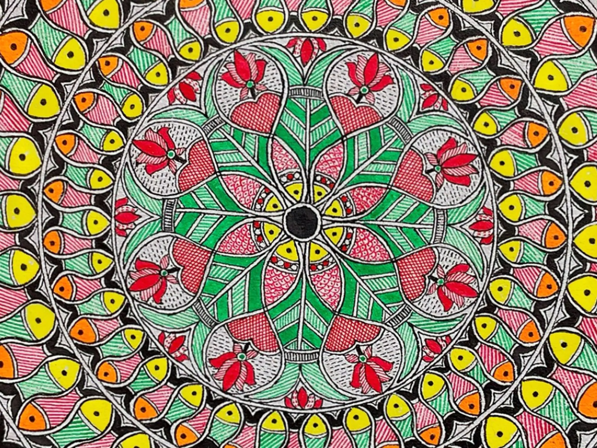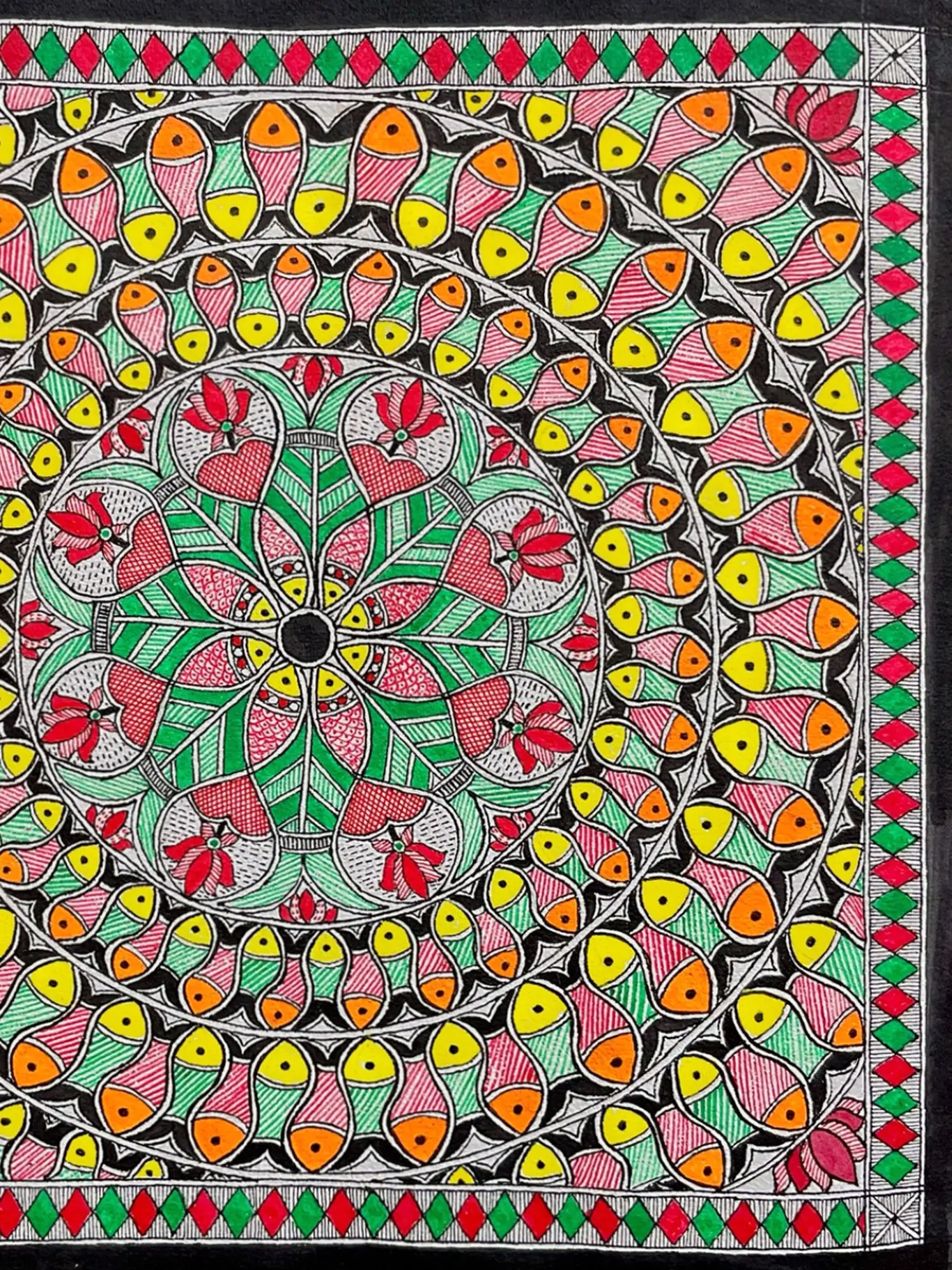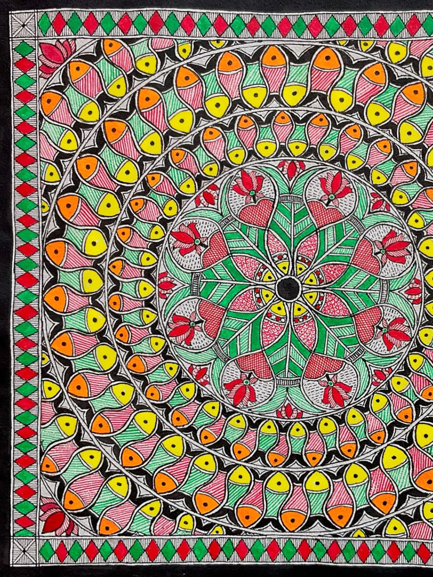 In this captivating acrylic painting, the pattern emerges as a symbol of luck and prosperity, embodying the vibrant spirit of Indian folklore and tradition as the marine beauties play Raas. Bold strokes and vivid colours bring the dance of the fish to life, evoking a sense of joyous celebration and abundance. Each swirling movement captures the dynamism and energy of the traditional dance, while intricate details pay homage to its cultural significance. This painting serves as a reminder of the enduring power of tradition and the boundless possibilities that arise when we embrace the blessings of the natural world.