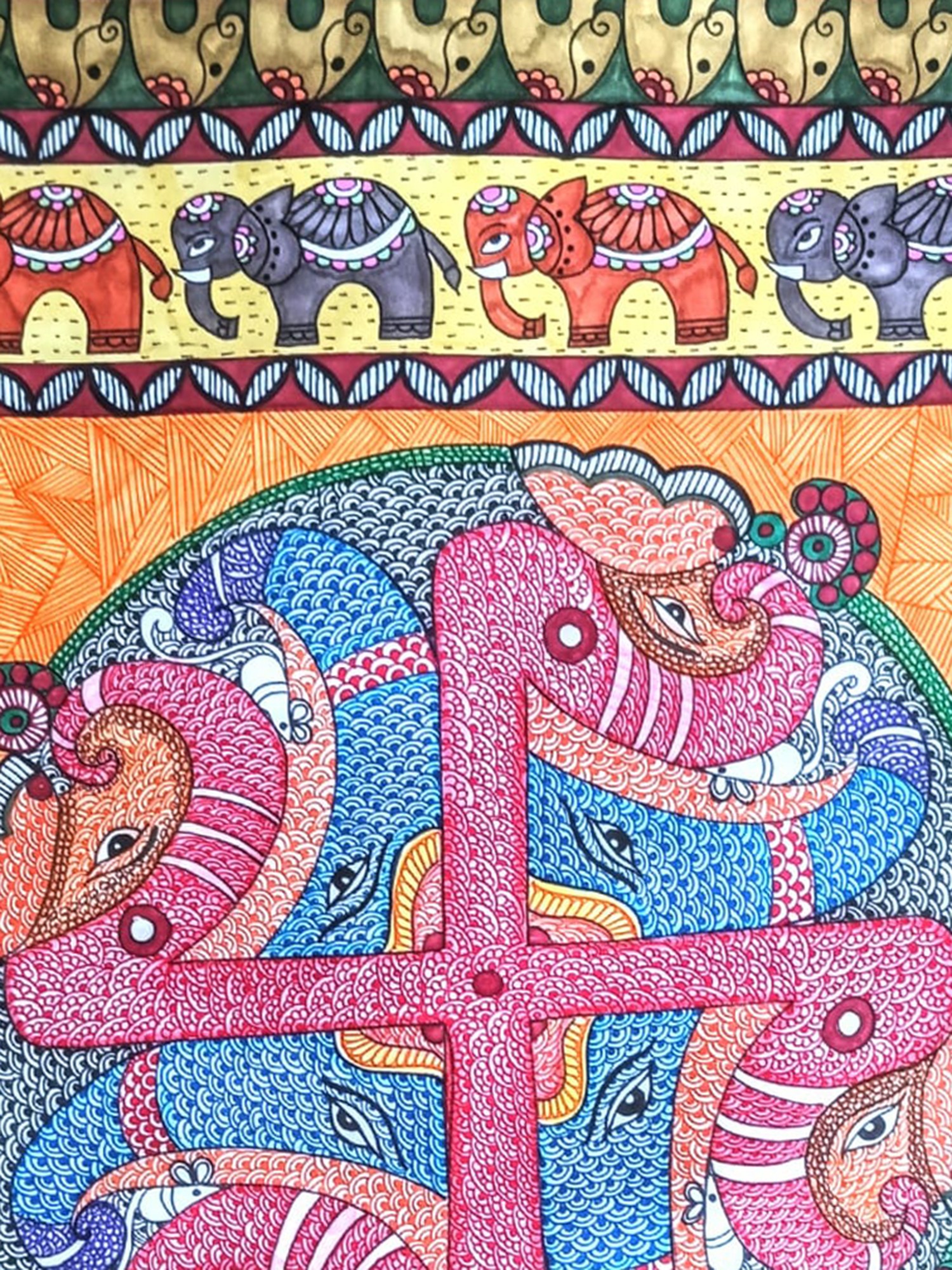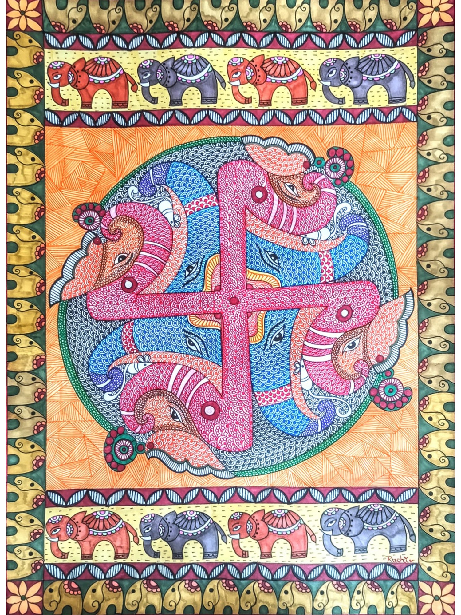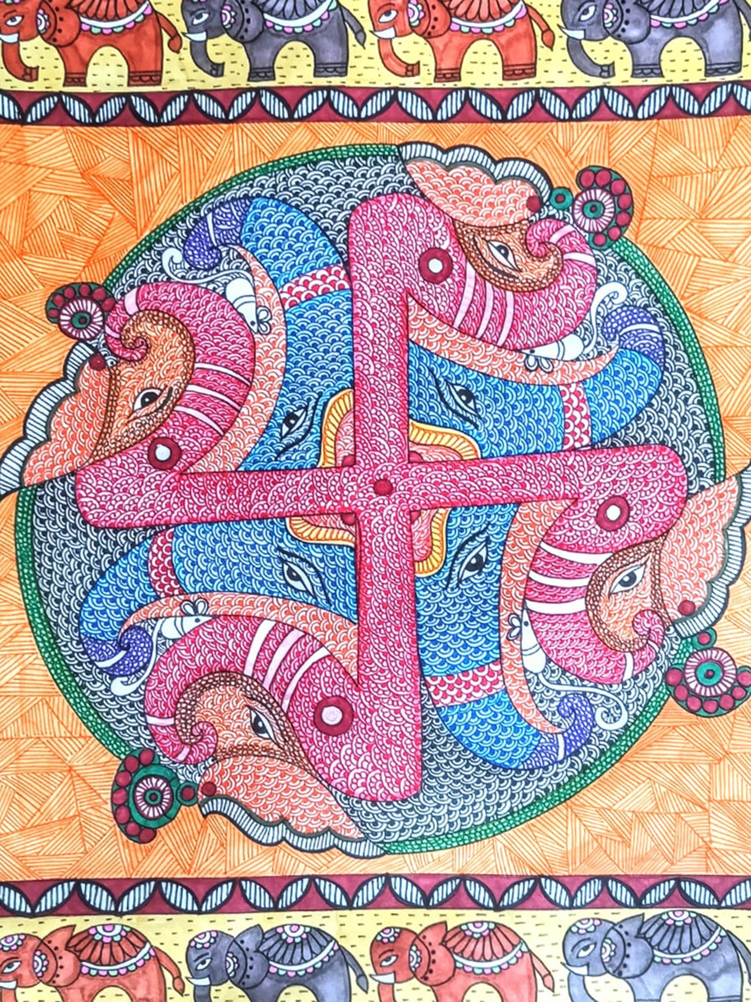 The background of the painting bursts with an energetic yet harmonious array of geometric patterns, a signature of the Madhubani style. The use of alcohol markers and fineliners on paper allows for a vivid saturation of color and a precision of line that accentuates the intricate textures. The central Swastika is enveloped by a textured green border, resembling a stylized lotus or a protective embrace. Surrounding this are fields of radiating orange lines, evoking a sense of warmth and divine energy. The outer borders are adorned with two distinct patterns. The upper and lower sections feature rows of meticulously depicted elephants, a symbol of strength, loyalty, and royalty, further reinforcing the auspicious theme of the artwork. The side borders display a repeating motif of golden, stylized swirls and floral elements, adding a touch of regal elegance and visual rhythm. The overall composition is a testament to the artist's ability to balance complex detail with a clear and impactful narrative, creating a piece that is both visually captivating and spiritually resonant. This painting is more than just an artwork; it is an invitation to embrace good fortune and celebrate life's blessings.