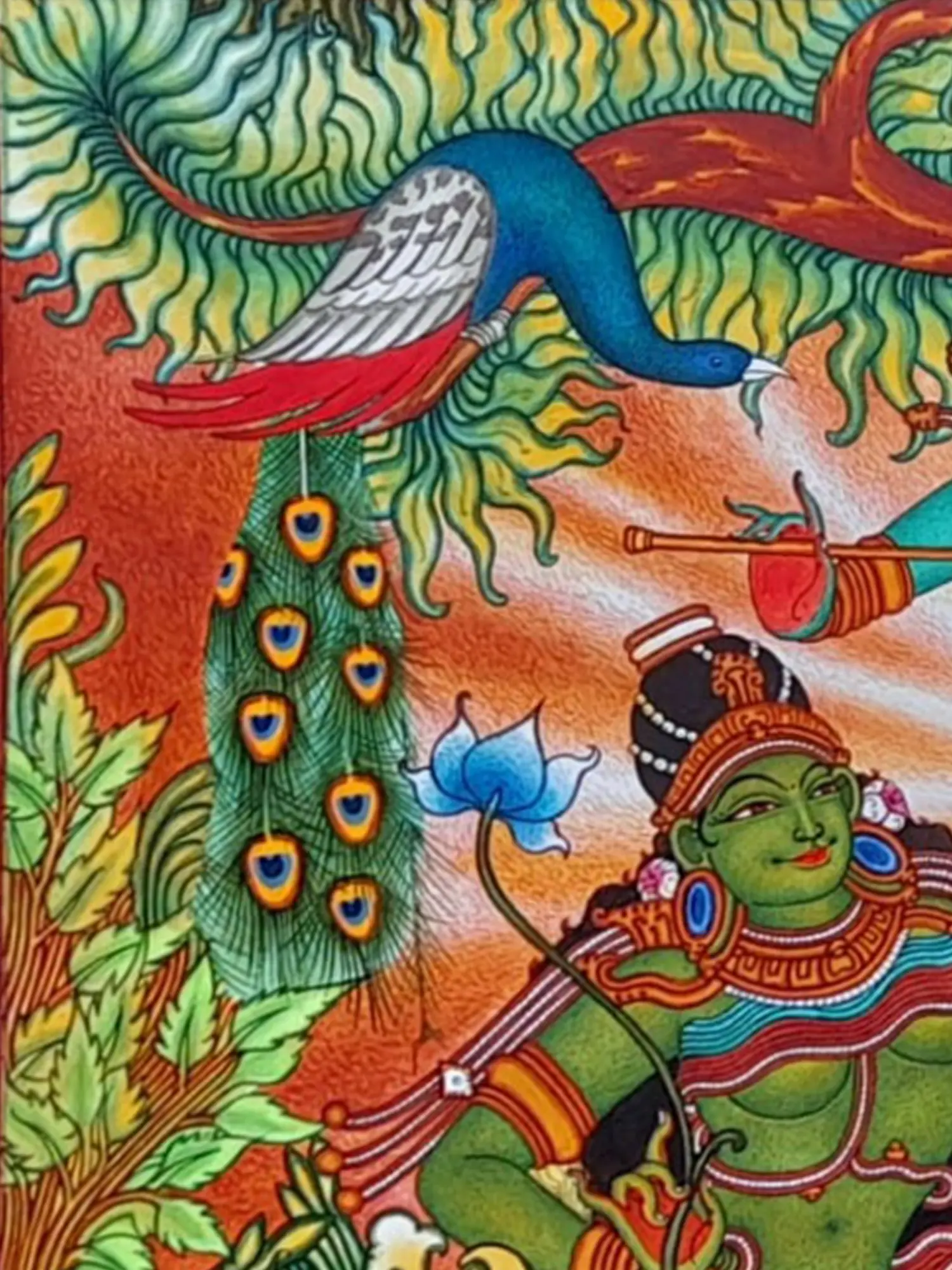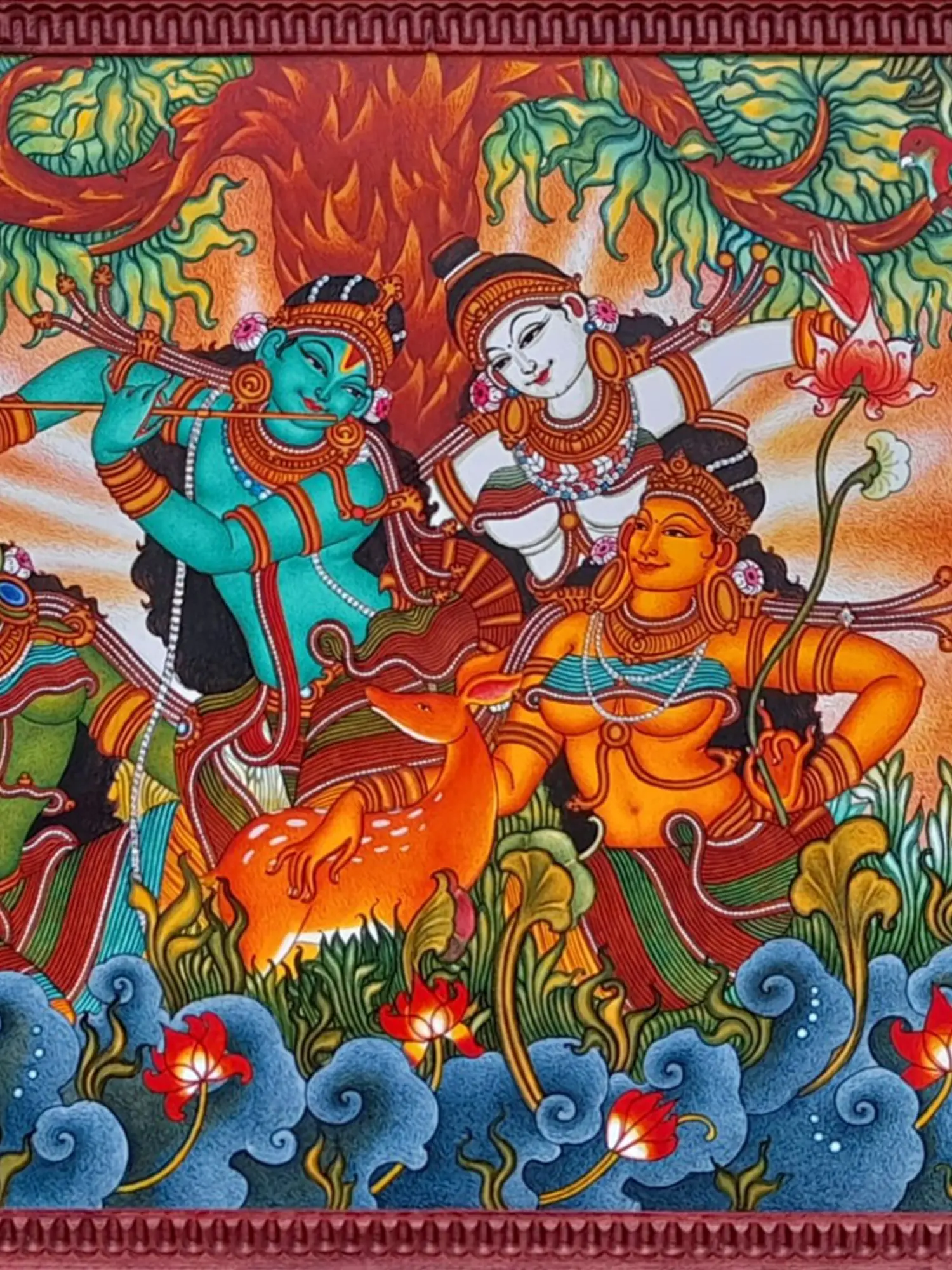 The Maadhurya (sweetness) of Madhuvan (the forest of nectar), where Krishna performs his Lila with his beloved Radha and Gopis, has been transformed into vibrant shades by Vishnu Shreedhar in this acrylic on canvas, inspired by the lyrical imagery of Kerla murals. The horizontal canvas becomes a window for the devotee to relish in the Lilas of Krishna, the blue-skinned Lord who stands under the tree with his flute, accompanied by the moon-faced Radha. The divine duo are surrounded by nature in full bloom, celebrating the love of Radha and Krishna and two Gopis, who gaze at the Jugal Jodi with affection. Celestially beautiful, this depiction of Krishna-Lila is a devotional landscape for the Bhakta, to drench in the nectar of Krishna and Radha’s togetherness.