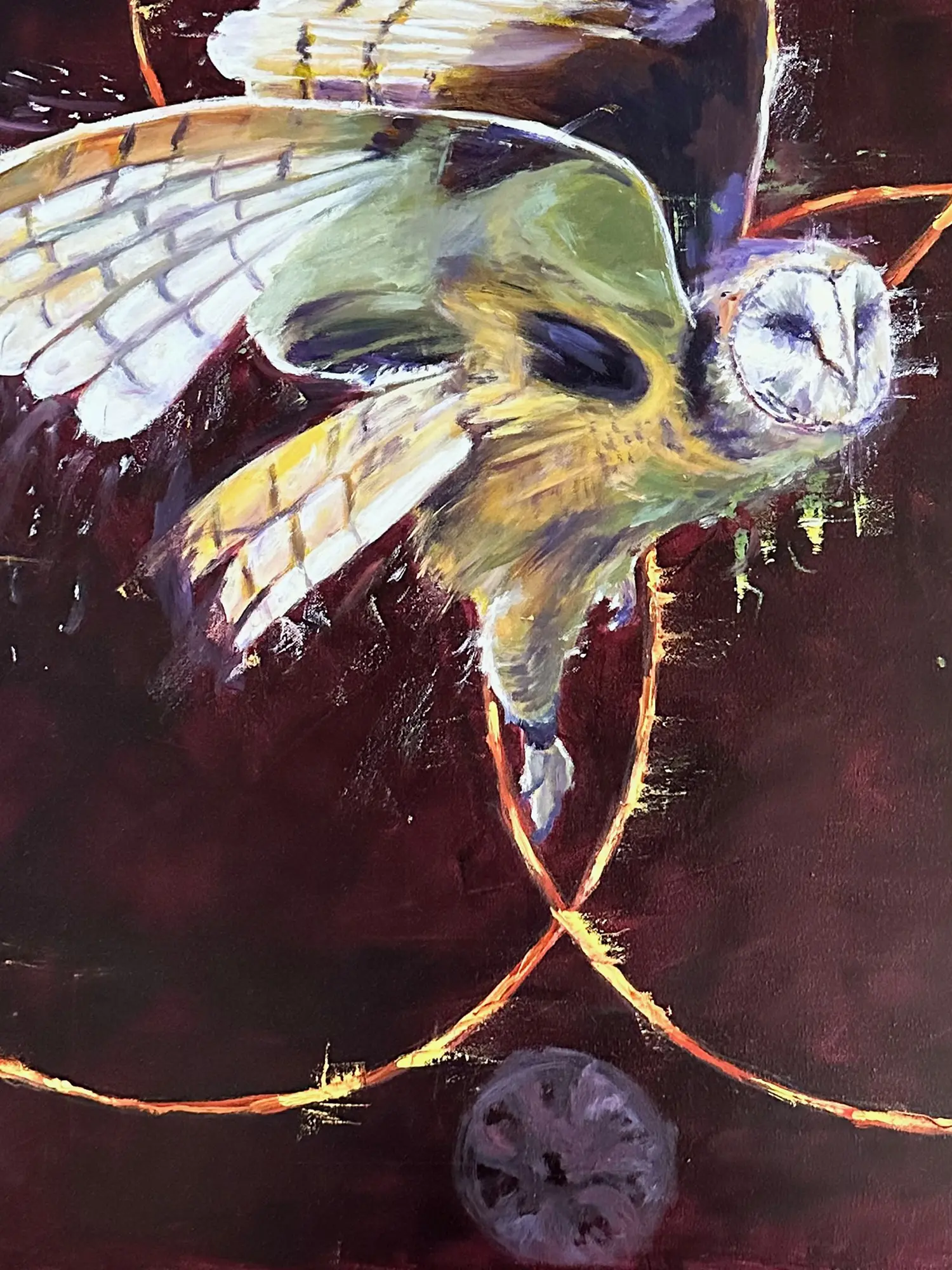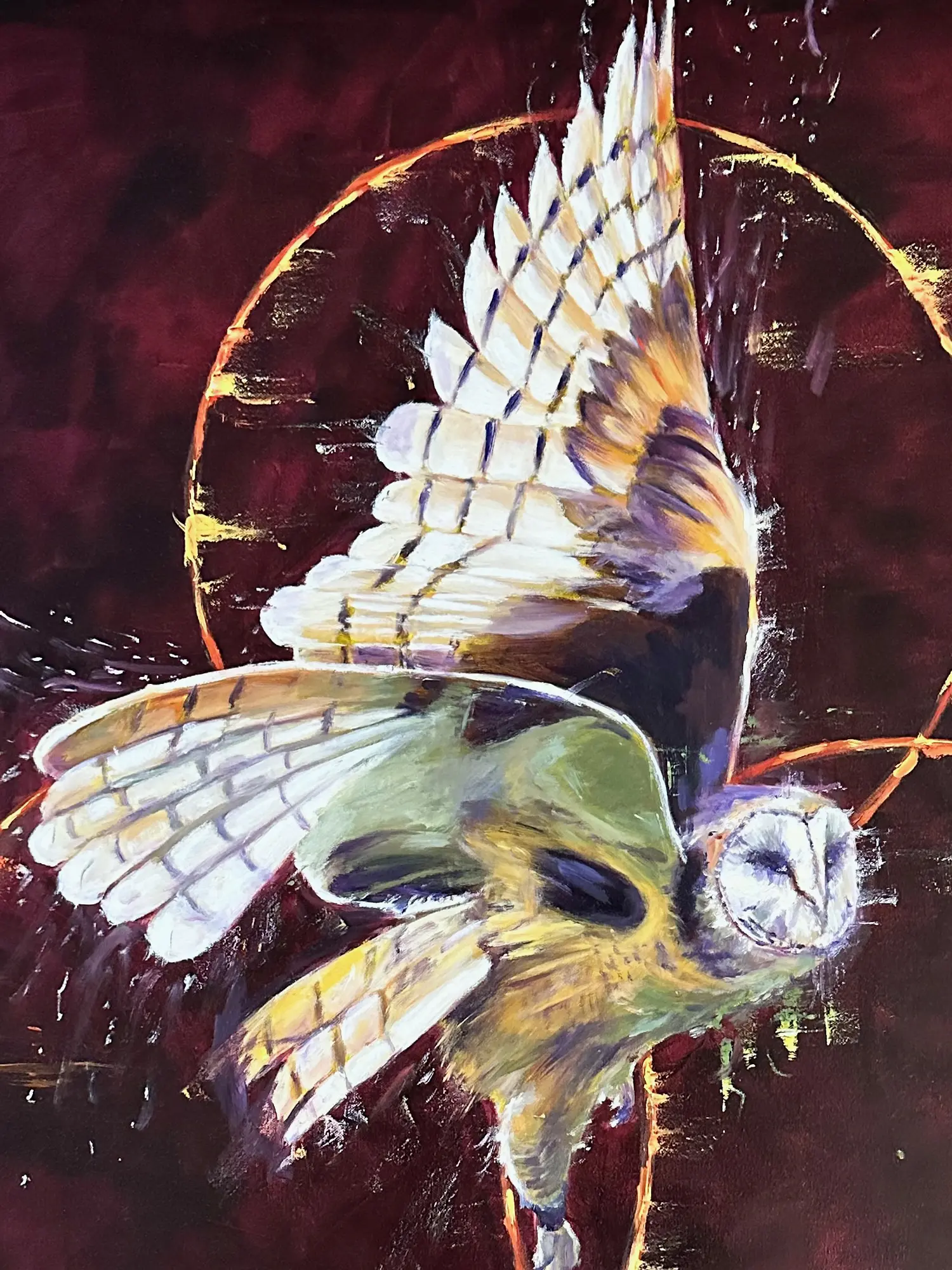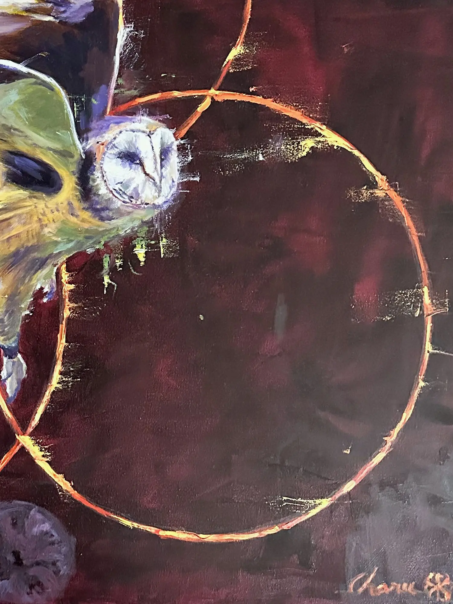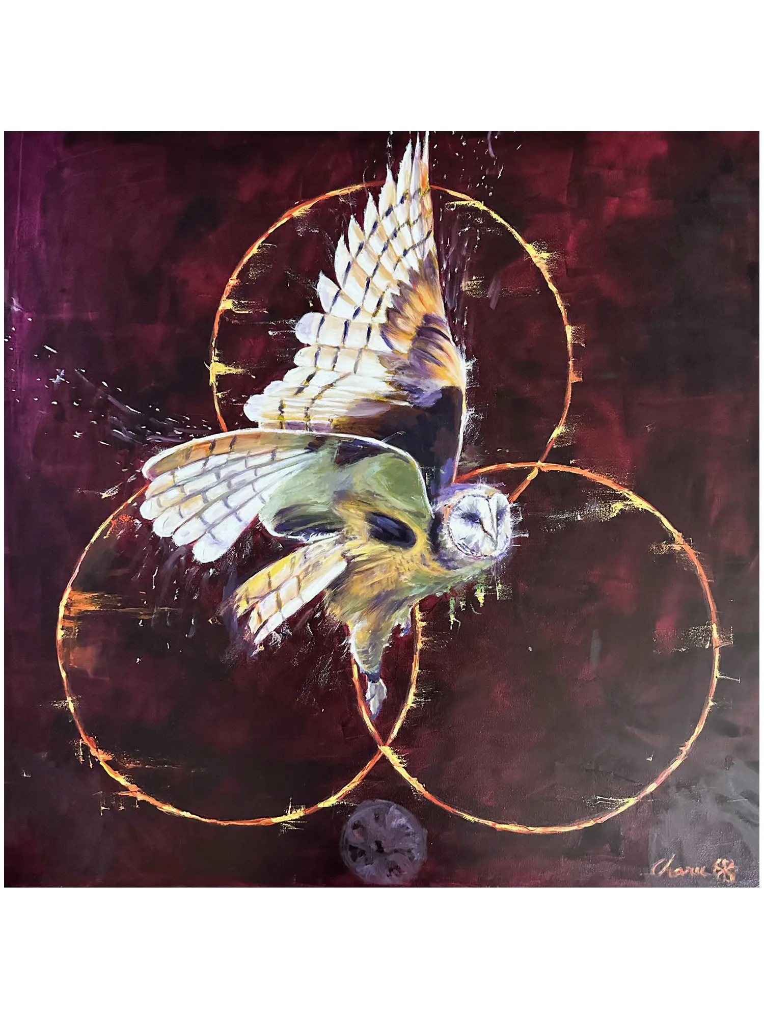 The painting itself is a masterclass in oil painting technique. Sridhar uses a rich palette of colours, with the burgundy background providing a stunning contrast to the owl's creamy white and olive-green plumage. The golden rings that frame the owl’s flight, applied with a textured, almost-gilding effect, add a touch of mystical radiance. These rings, potentially representing cycles of time, the universe, or even the three realms of the Celtic Otherworld, enhance the overall narrative and invite viewers to contemplate their deeper meaning. The visible brushstrokes further demonstrate the artist’s skill, allowing for a spontaneous and expressive feel. The painting’s large scale (30 inches x 30 inches) adds to the immersive experience, allowing the viewer to lose themselves in the detail and the drama of the barn owl’s flight.