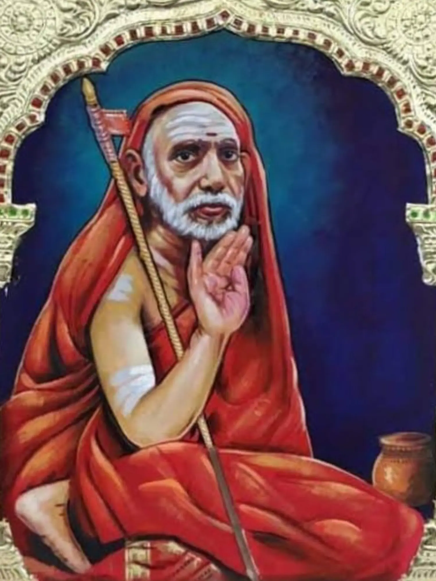Shading in blue in the background complements the austere aura of Mahaperiyava’s saffron ascetic garbs, enhancing the divine energy that radiates from the Tanjore.