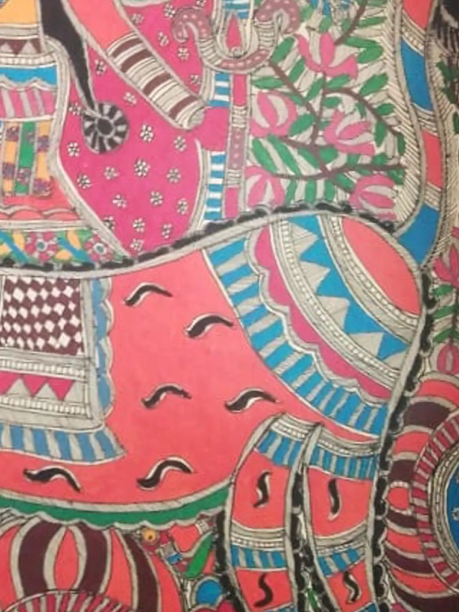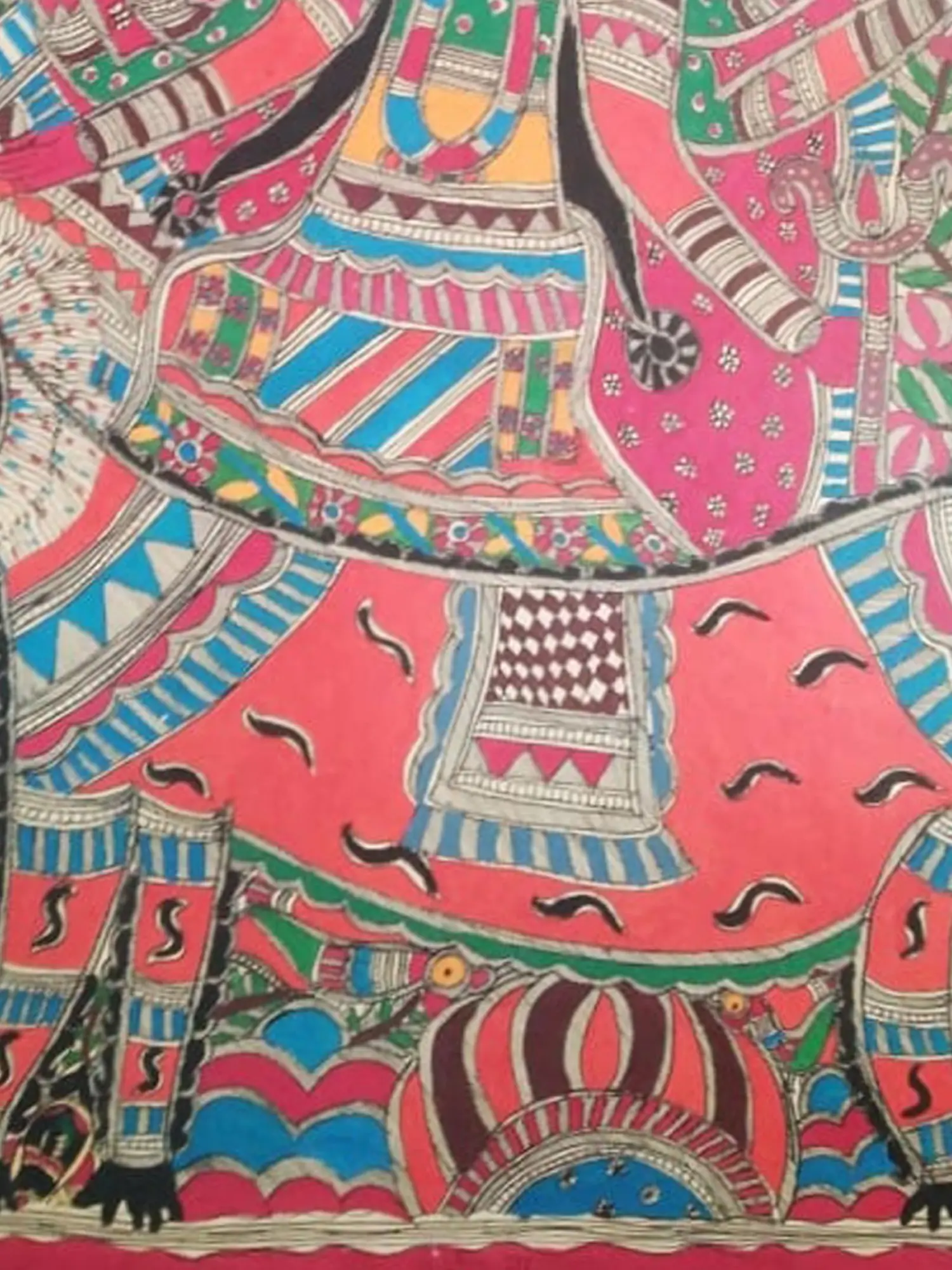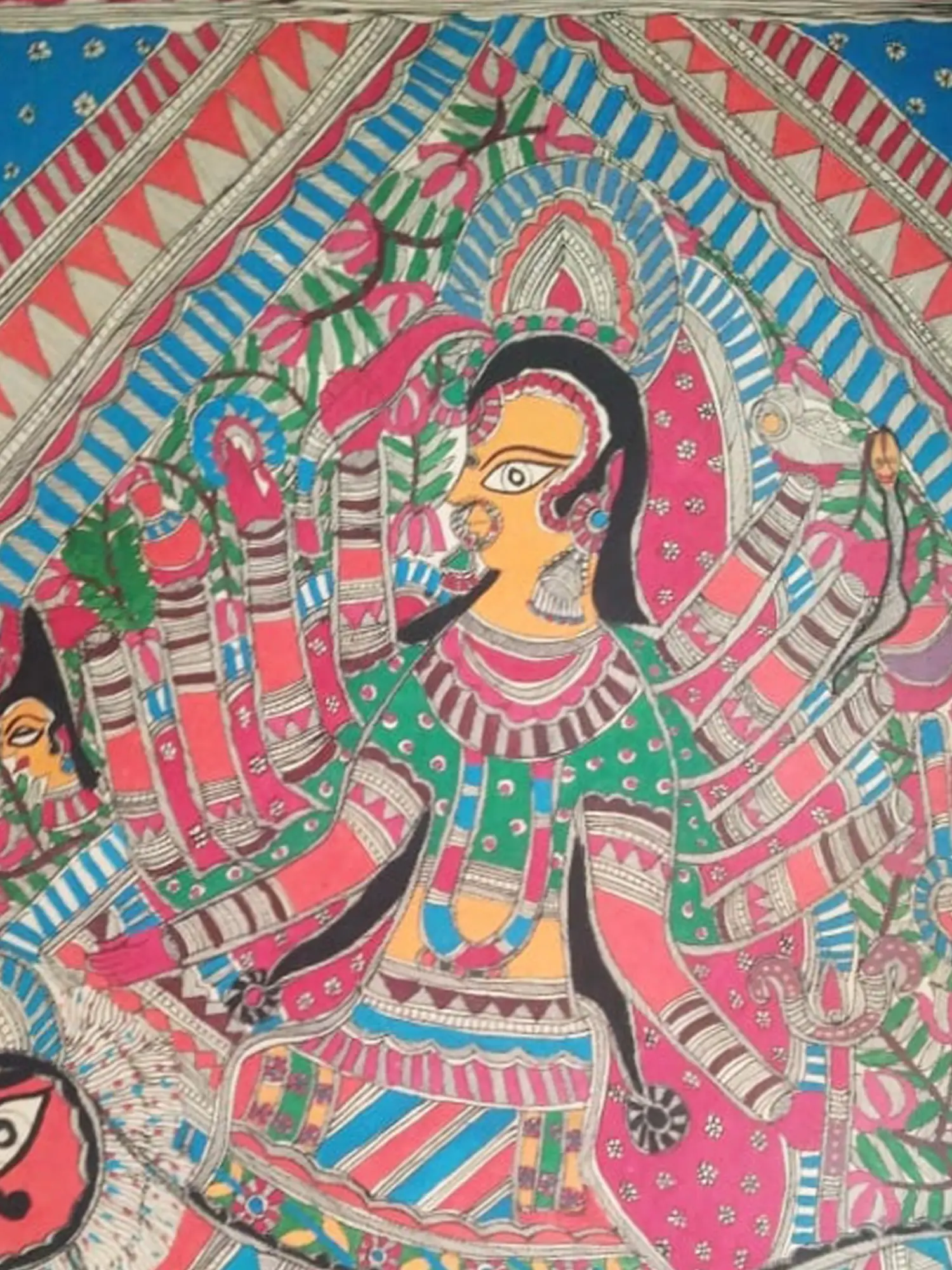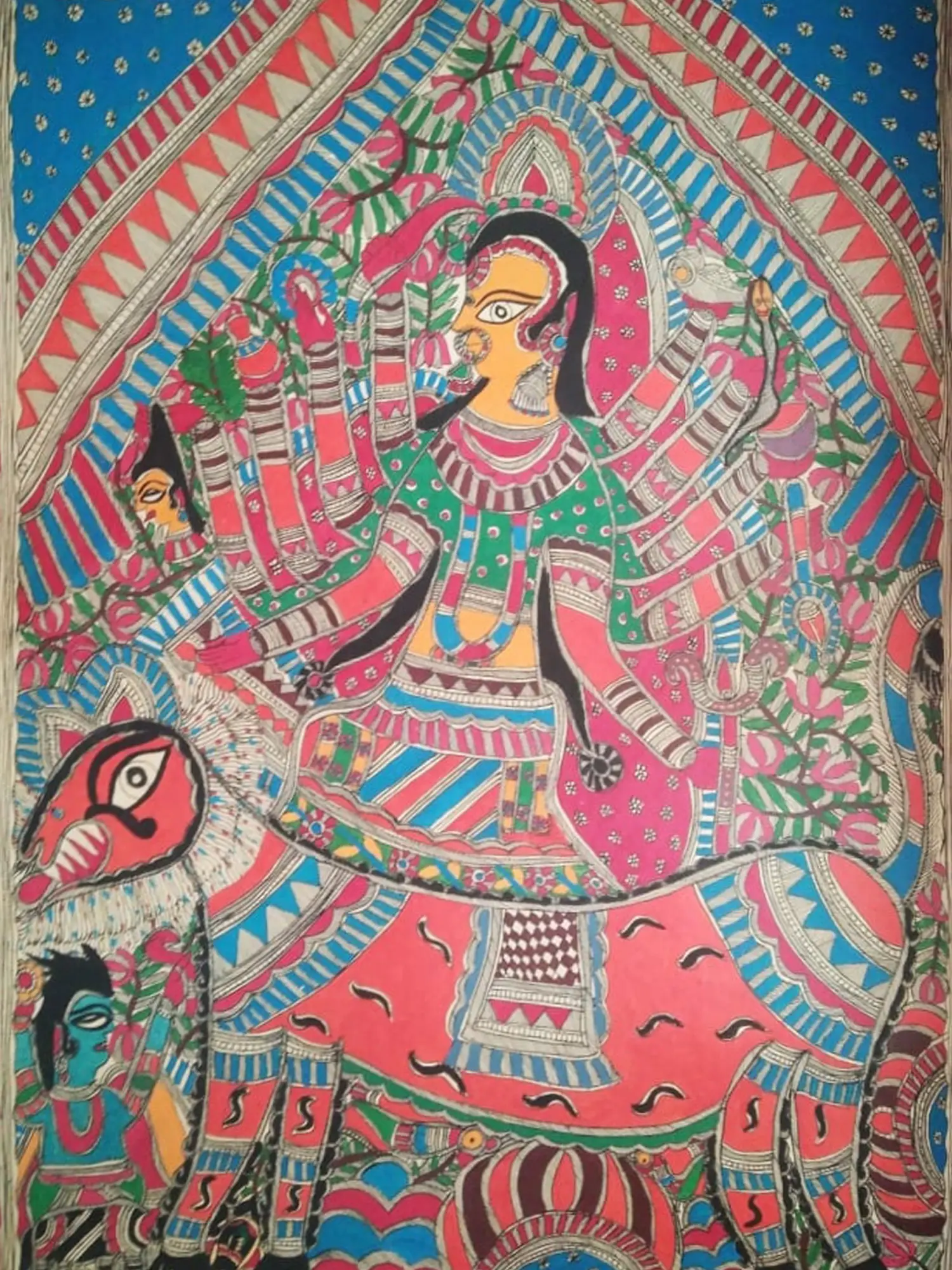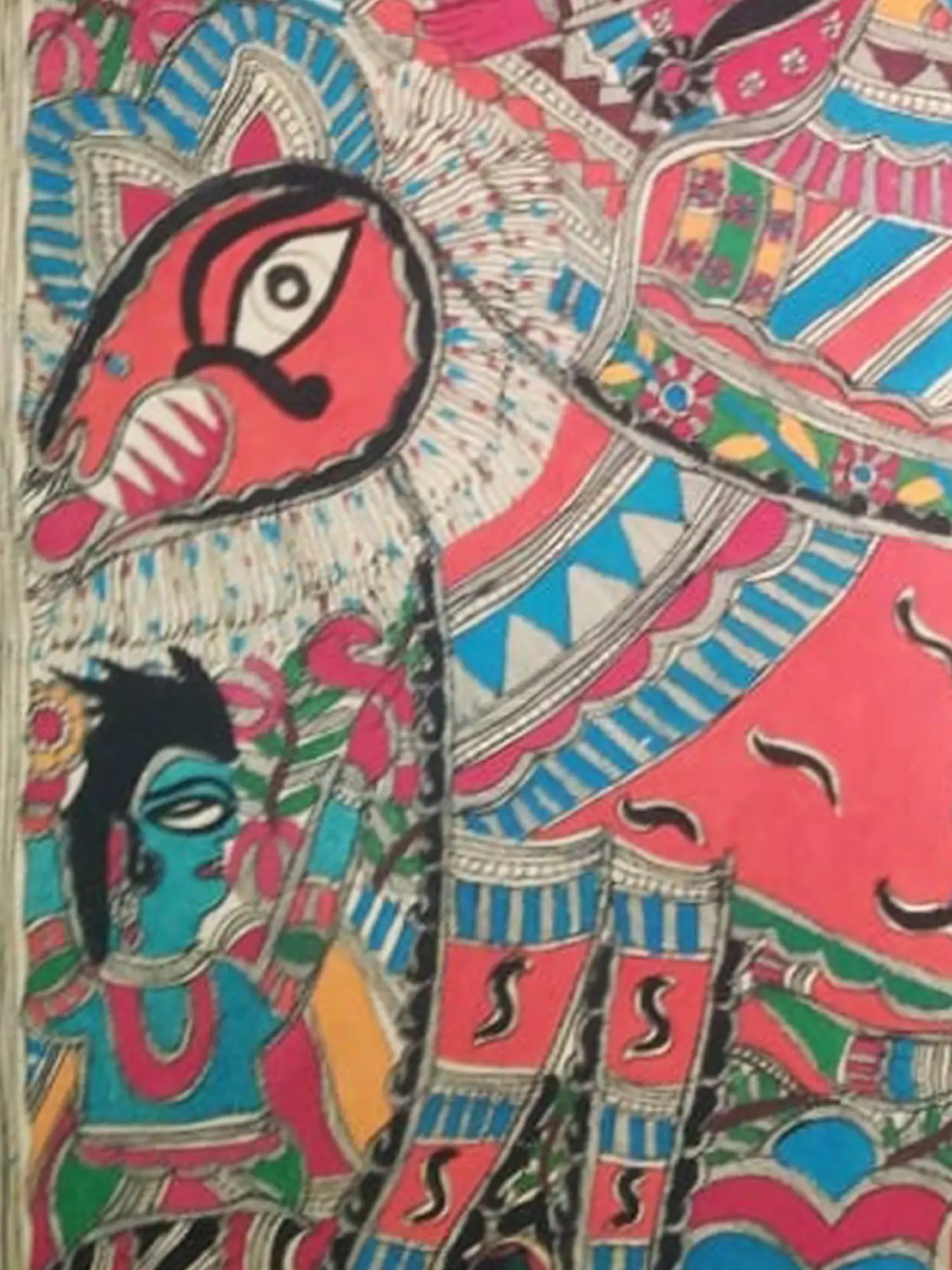 Witness the awe-inspiring power of Goddess Durga in 'Mahishasura Mardini', a majestic portrayal rendered with natural colours on handmade paper. As the embodiment of divine strength and righteousness, Durga emerges victorious over the forces of darkness and ignorance. With her radiant aura and resolute gaze, she inspires courage and fortitude in the hearts of her devotees, guiding them towards triumph over adversity.
