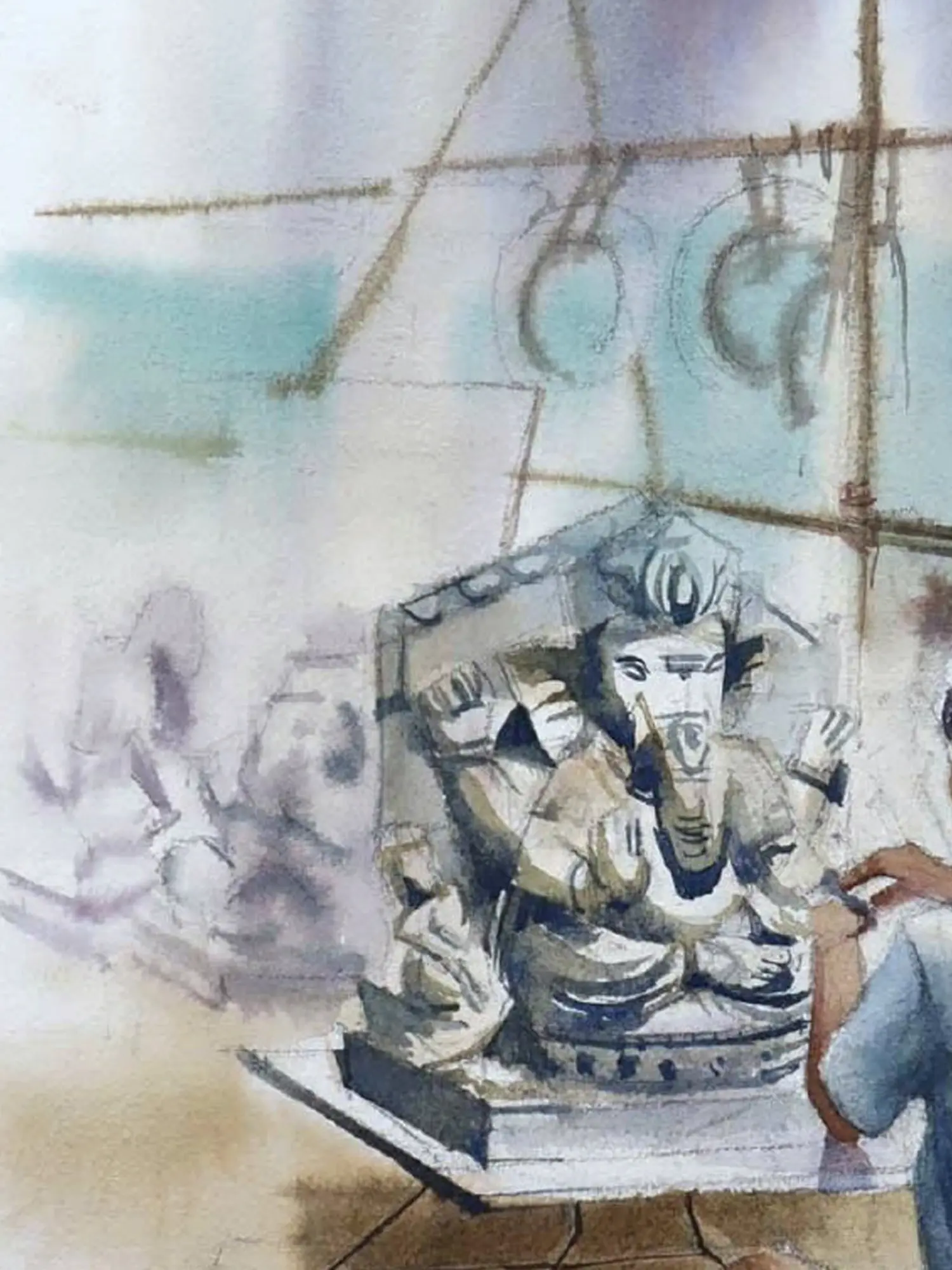Witness the nascent stages of devotion, where artistry and spirituality converge. This masterful watercolor captures the sacred ritual of sculpting an idol, a moment of profound focus and dedication. It invites you to contemplate the journey from raw material to divine representation.