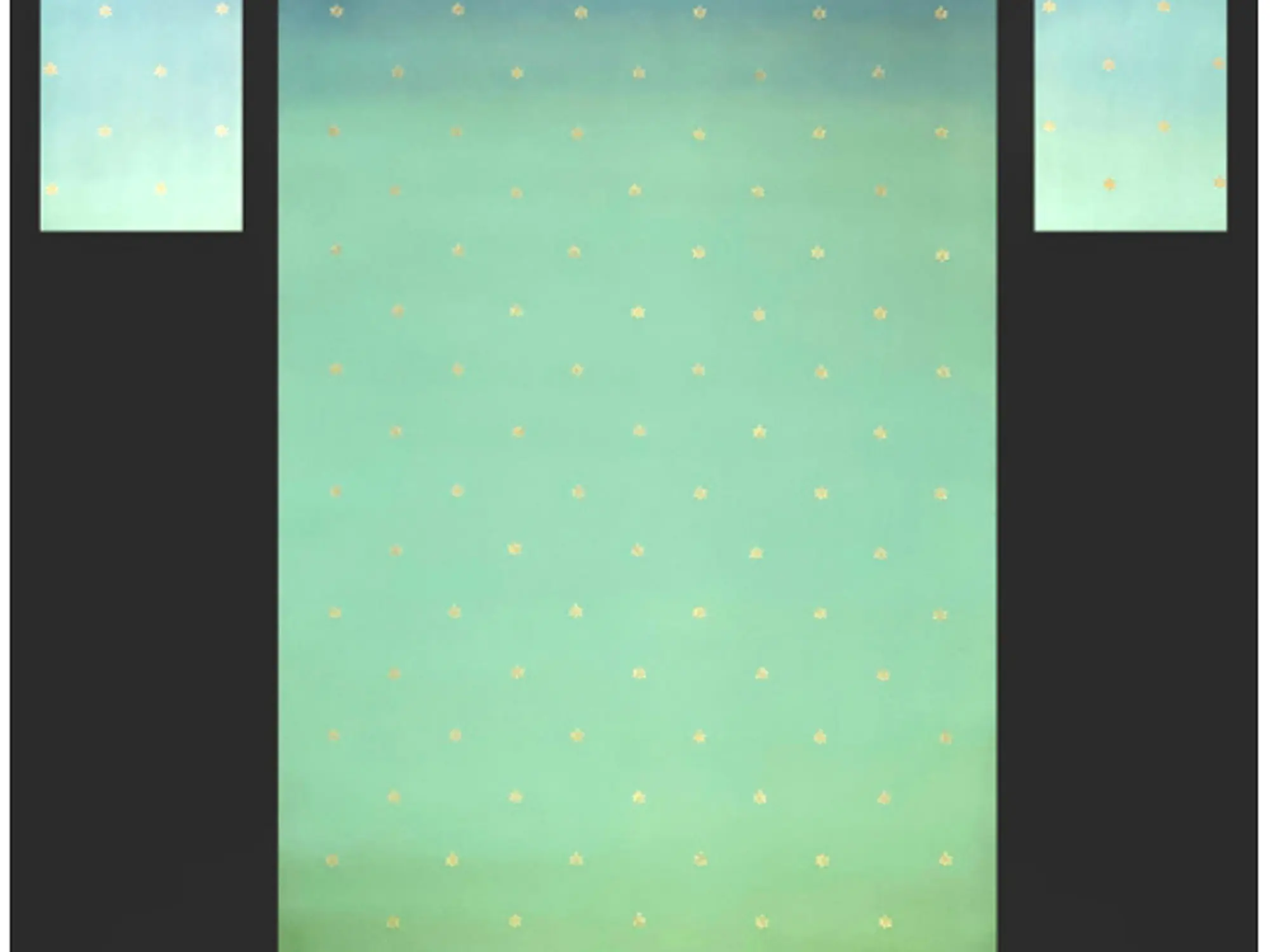 The expansive 72-inch height and 48-inch width create a commanding presence, perfect for transforming any environment. Observe the gentle gradient of sky hues, transitioning from a soft dawn blush to an ethereal blue, dotted with delicate golden stars that evoke a celestial atmosphere. Framing this cosmic expanse is a border of stylized, swirling clouds, hinting at the divine presence above. The focal point is the serene depiction of two sacred cows, their pristine white forms adorned with subtle auspicious markings and ornate jewelry, standing amidst a vibrant carpet of blooming lotus flowers and lush greenery. Their gaze is upward, suggesting a connection to the heavens.