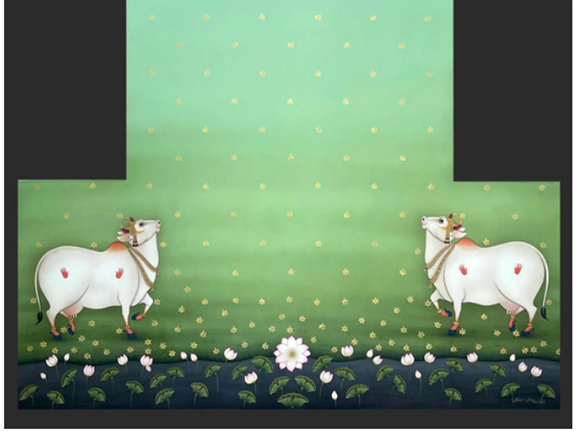 Shammi Bannon Sharma’s ‘Mandir Backdrop – Krishna’s Cows’ is a charming watercolor painting based on the time-honored Pichwai style. It was made on linen canvas and showed a classic pair of Pichwai cows looking upwards, a characteristic of these paintings. The space has been purposely left vacant in a rectangular area where the statue of Shrinath Ji is expected to fit, adding a spiritual dimension to the arrangement. Lotus motifs adorn the lower section, while overhead, the clouds drift smoothly. It has a light sea–green background that gives it tranquility and calmness, creating an atmosphere of perfection and sophistication. It embodies the essence of devotion and peacefulness, emanating the grace of lord Krishna’s heavenly home.