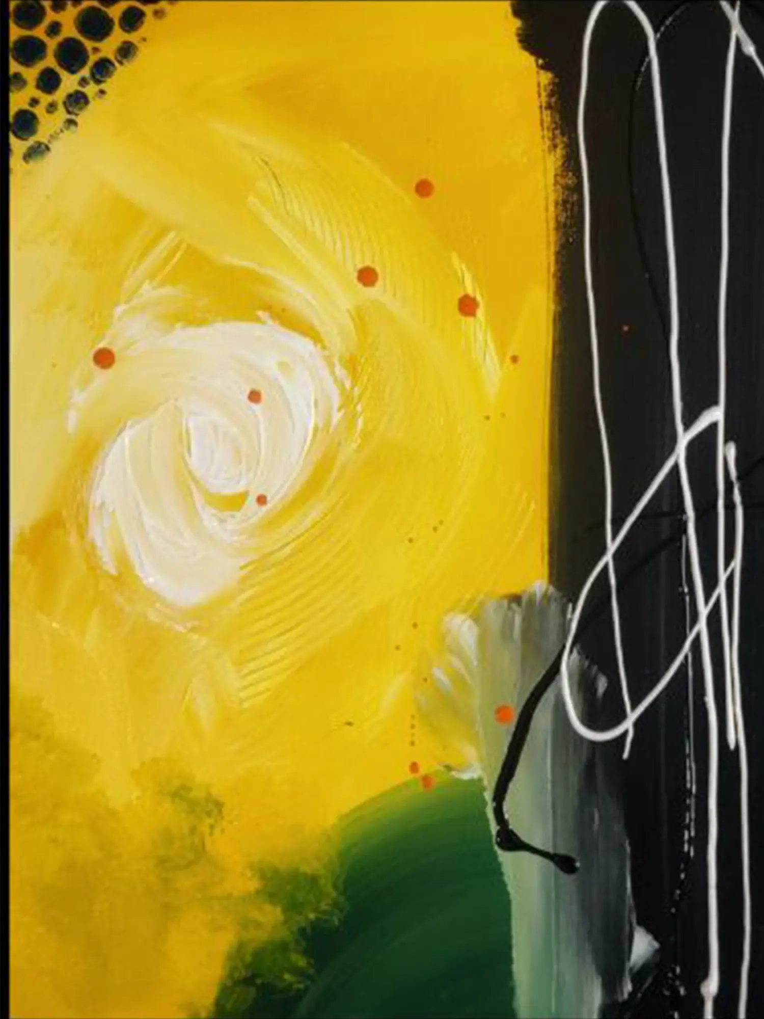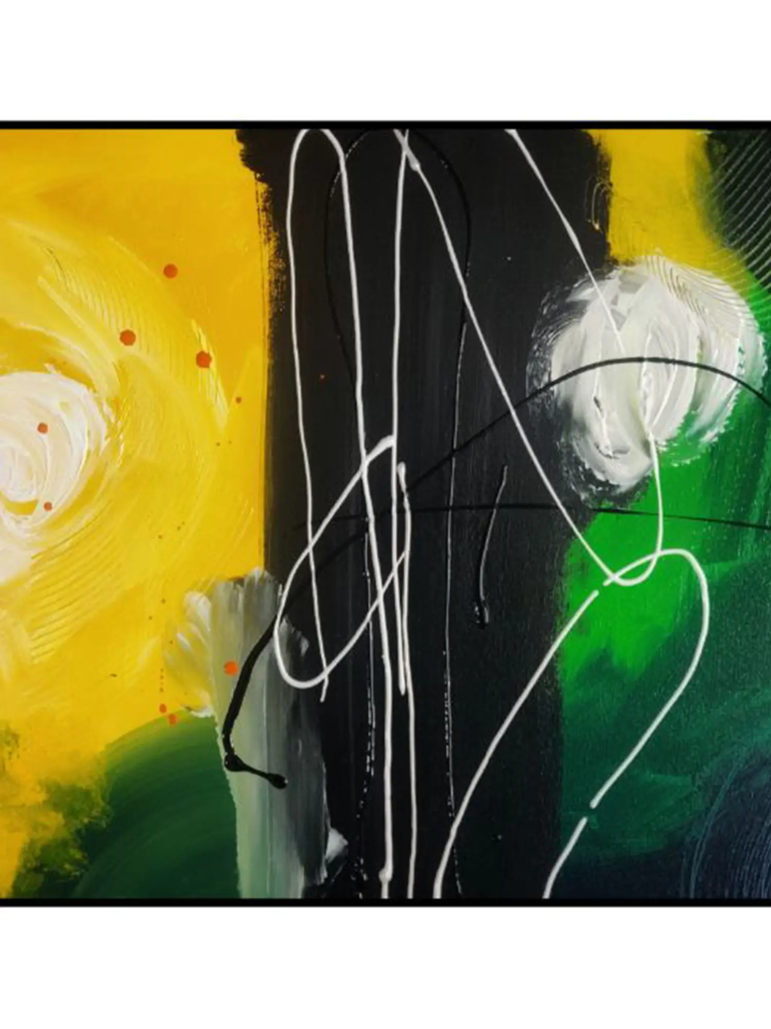 This artwork by Kapil Vadhera is a striking exploration of contrasts, a visual dialogue between the forces of light and darkness. The vibrant yellow bursts forth with the energy of a sun god, perhaps akin to Surya from Hindu mythology, the source of life and vitality. Its brightness pulls the eye, invoking feelings of optimism and creation. Juxtaposed against this is the deep, enveloping black, a void that whispers of the unknown, the mysterious depths of space, or even the primordial chaos from which all things emerge, echoing the concept of Brahman in its unmanifest form. The artist’s careful interplay between these powerful hues creates a dynamic tension, a constant push and pull that reflects the inherent duality present in all aspects of existence. The emerald green interweaves offering a sense of growth and renewal, suggesting the regenerative powers of nature, perhaps the life-giving energy of Prithvi, the earth goddess.