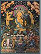 A Thangka is a traditional Tibetan Buddhist painting that usually depicts a Buddhist Deity (Buddha or Bodhisattva), a scene, or a mandala. These paintings are considered important paraphernalia in Buddhist rituals. They are used to teach the life of the Buddha, various lamas, and Bodhisattvas to the monastic students, and are also useful in visualizing the deity while meditating. One of the most important subjects of thangkas is the Bhavacakra (the wheel of life) which depicts the Art of Enlightenment. It is believed that Thangka paintings were developed over the centuries from the murals, of which only a few can be seen in the Ajanta caves in India and the Mogao caves in Gansu Province, Tibet. Thangkas are painted on cotton or silk applique and are usually small in size. The artist of these paintings is highly trained and has a proper understanding of Buddhist philosophy, knowledge, and background to create a realistic and bona fide painting.