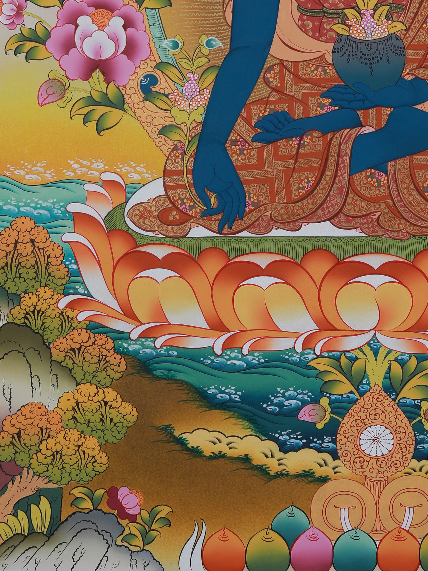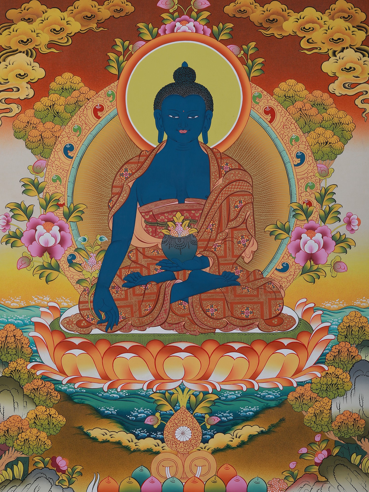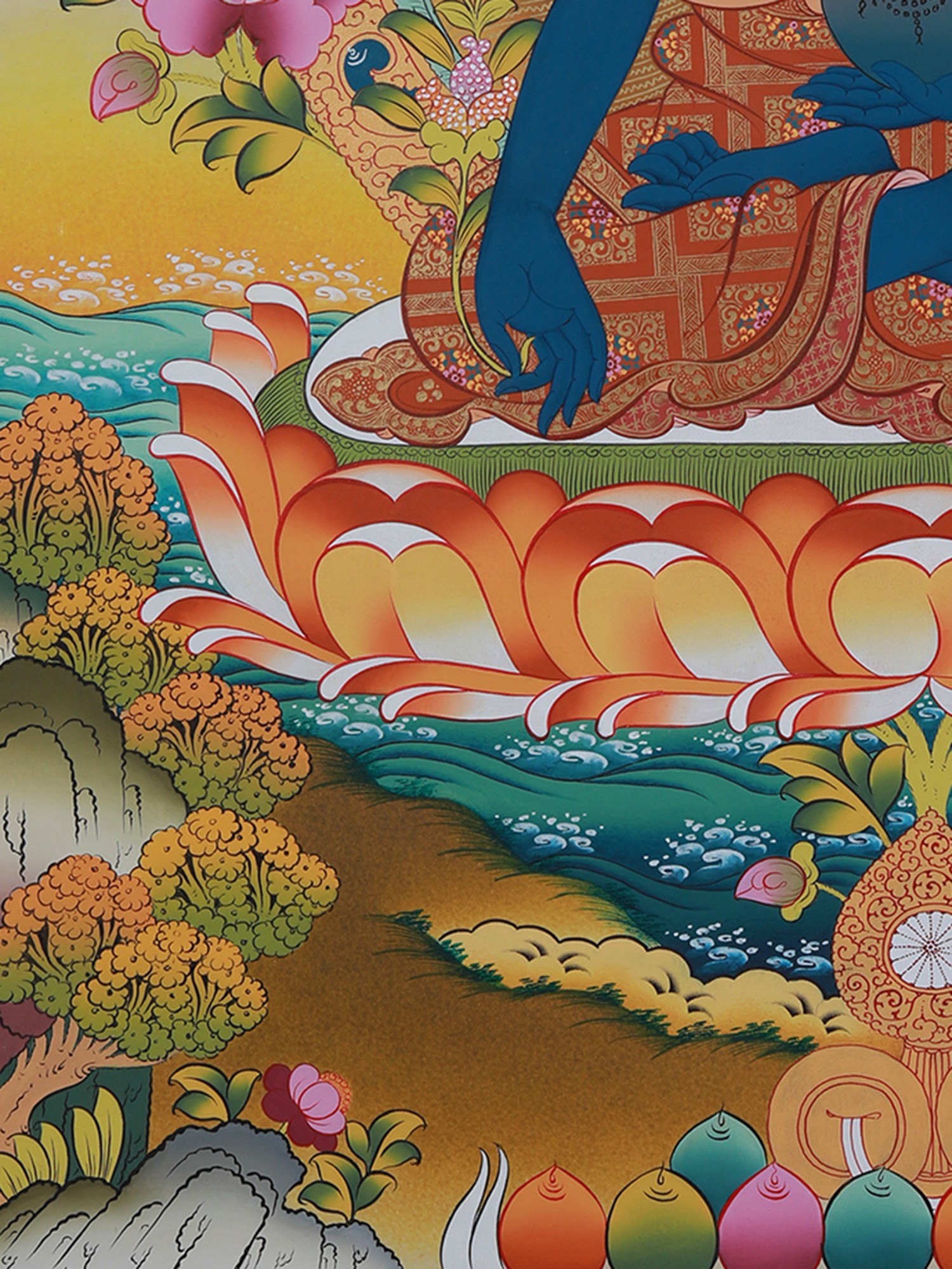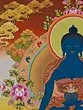 Superfine Medicine Buddha On The Six-Ornament Throne of Enlightenment in His Universe - Tibetan Buddhist Brocadeless Thangka