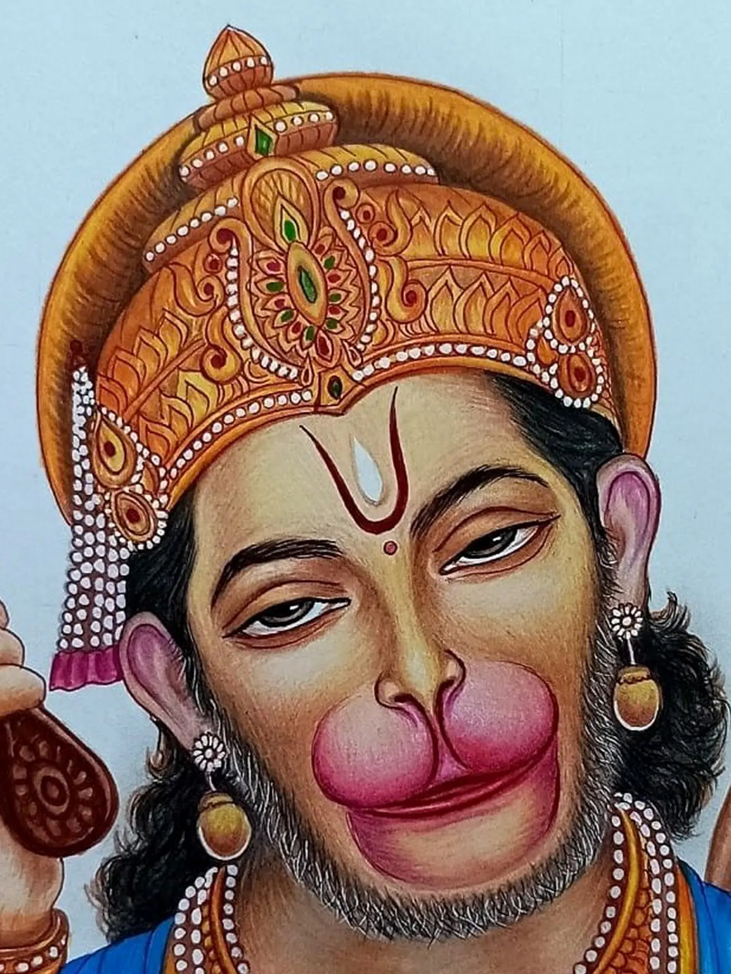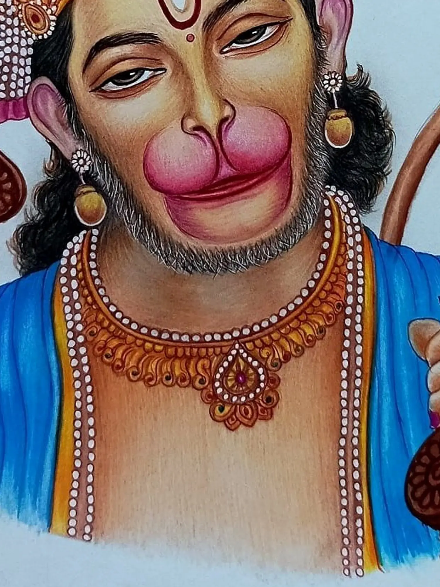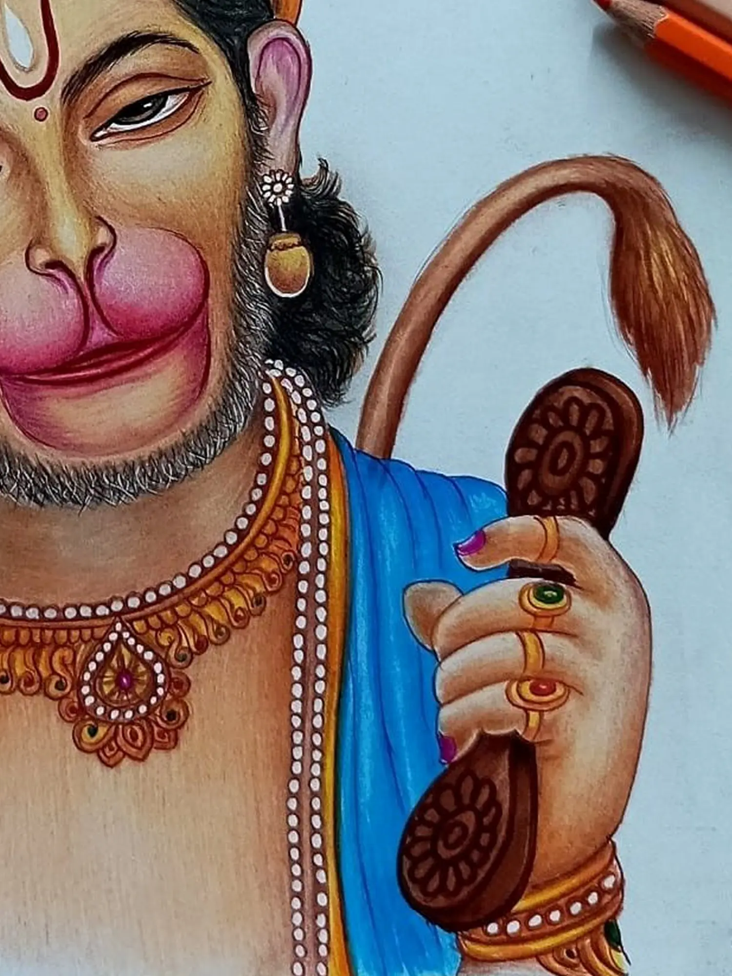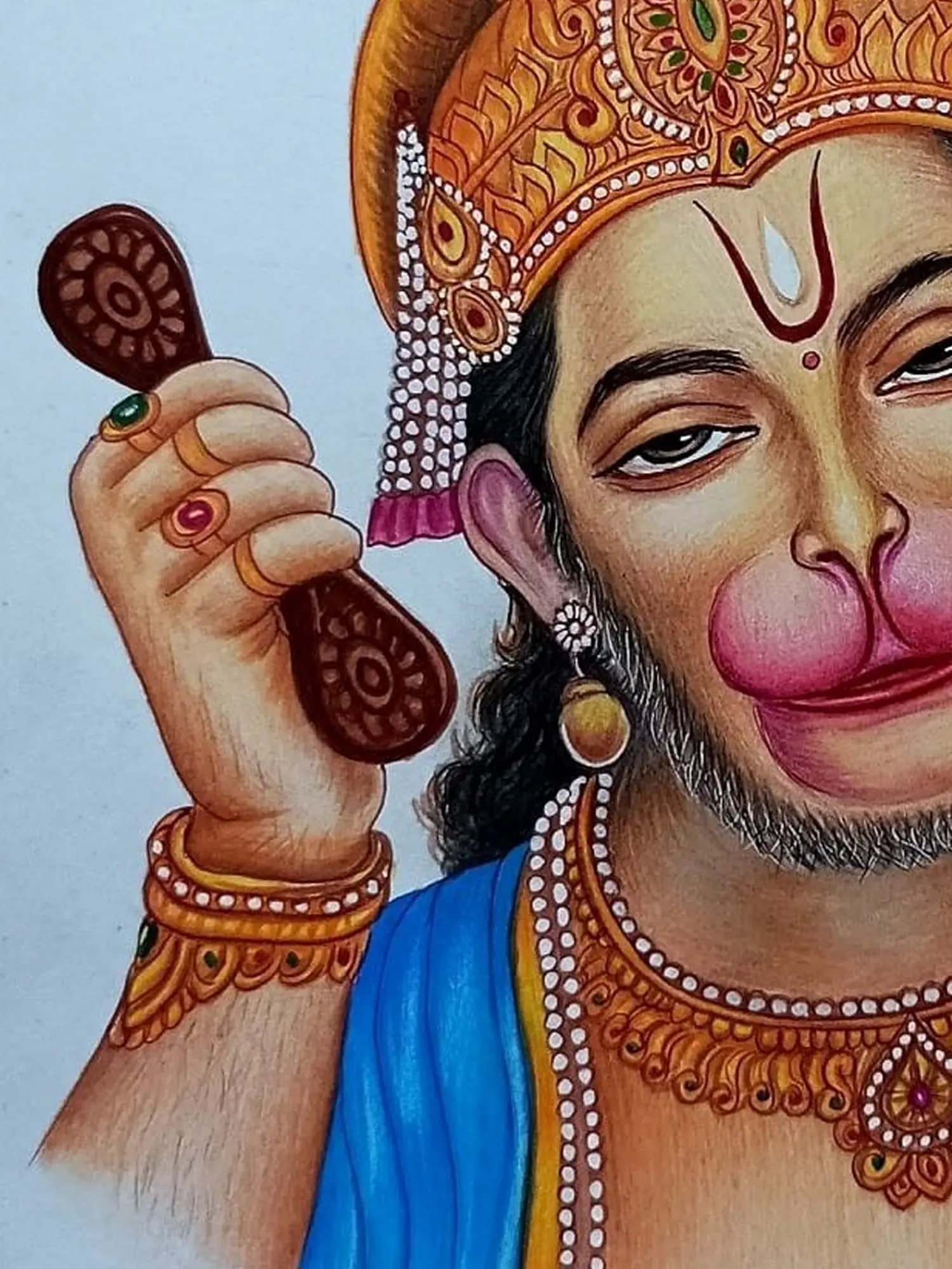In this mesmerising portrayal, “Hanuman,”, the Son of Vayu, the epitome of devotion, is depicted in deep meditation, clutching the sacred “Manjeera,” immersed in the divine melodies of Raam's bhajans. This sacred piece of art by Sunil Kumar represents serenity, loyalty, and unwavering belief. Carefully created using coloured pencils, it radiates serenity and beckons you to explore the realm of spirituality. Perfect for embellishing your holy place or as a thoughtful gift, let this sacred creation inspire and brighten your spirit with its rich meaning and creative brilliance.
