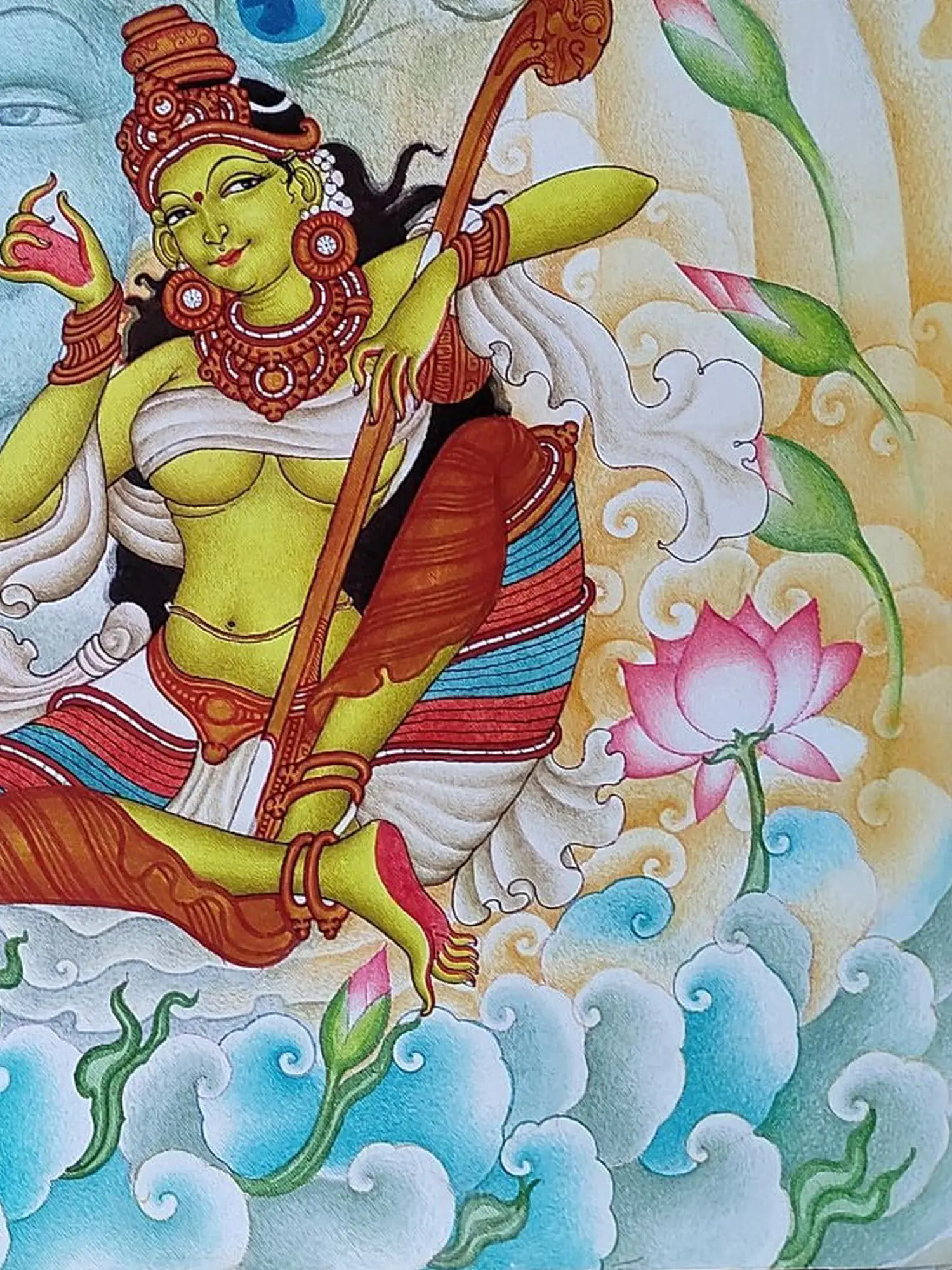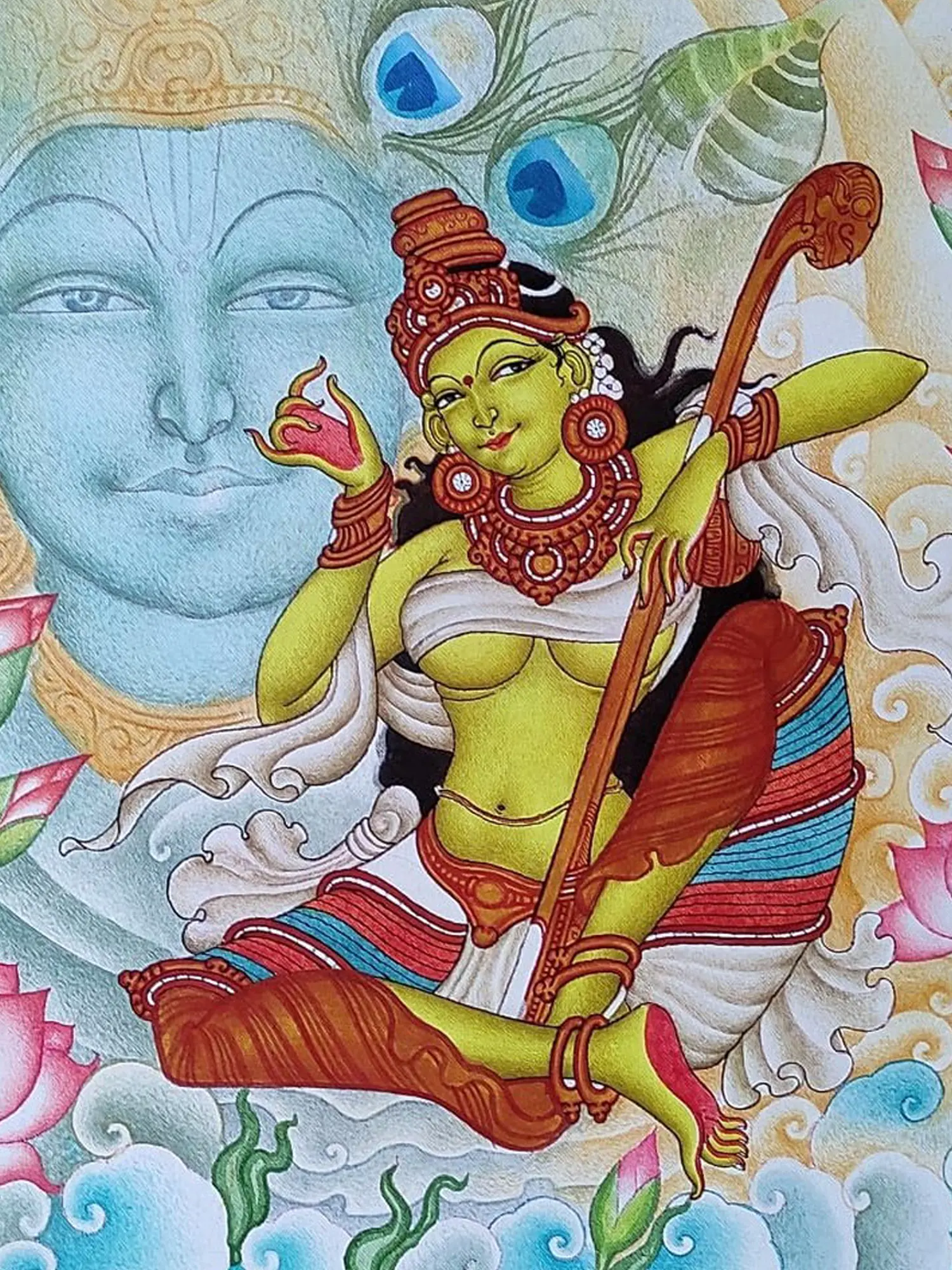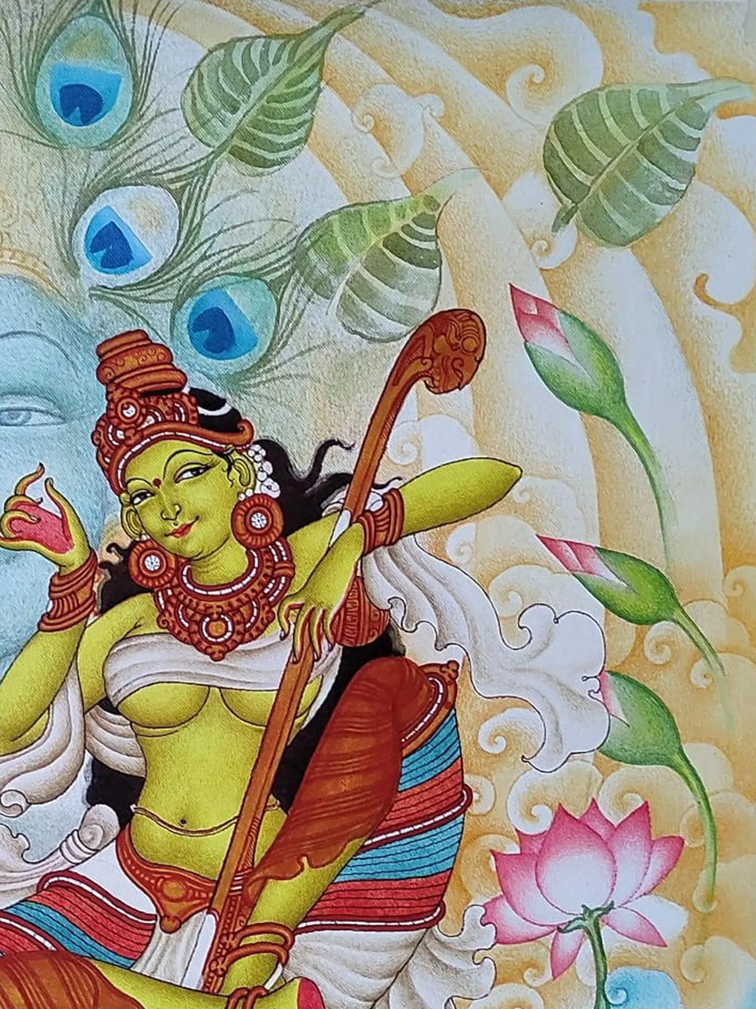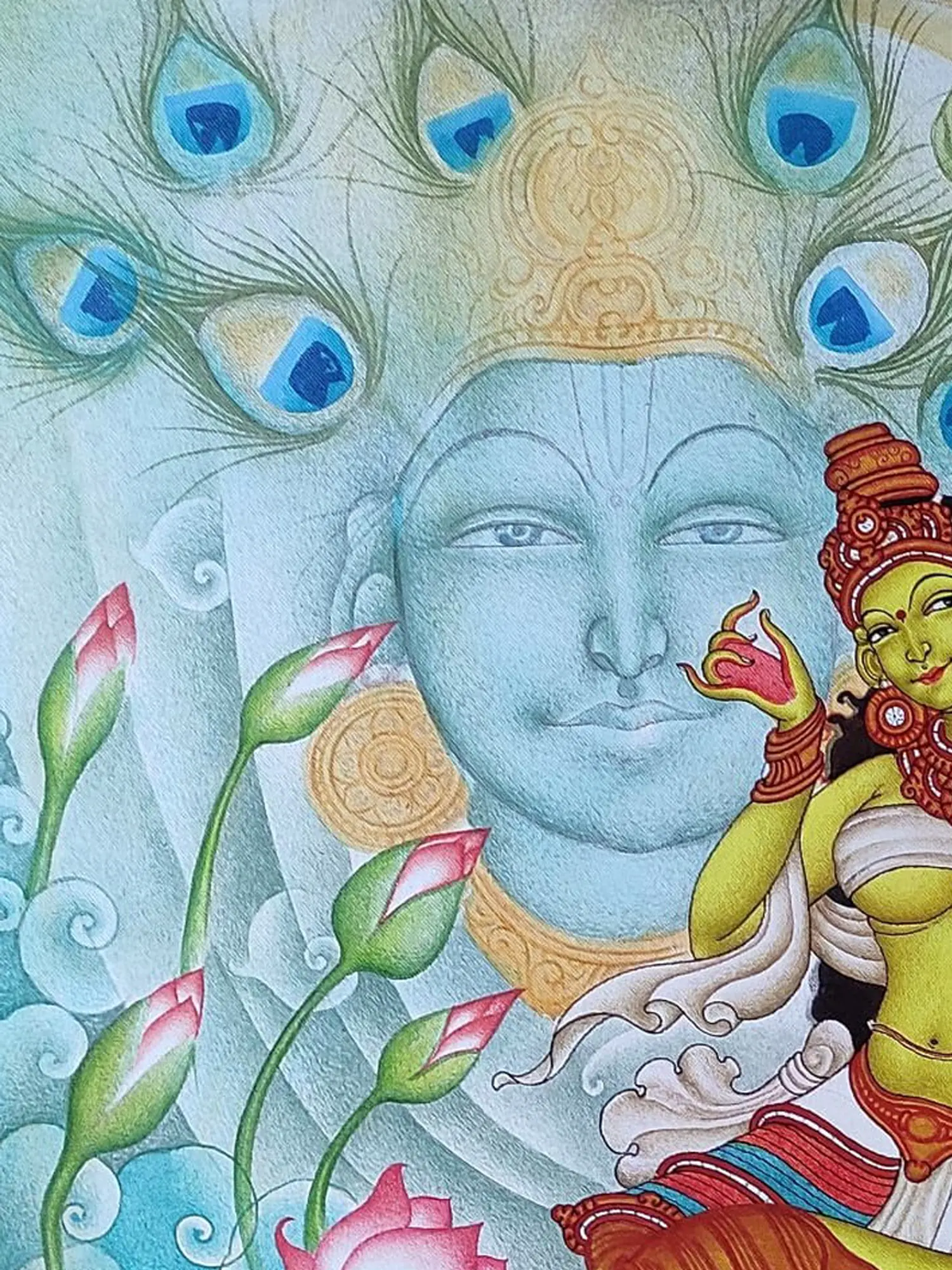 The composition unfolds across a 24-inch square canvas, a perfect frame for its intricate details. Observe the sublime rendering of Lord Krishna’s visage, a serene presence that anchors the scene, flanked by the iconic imagery of peacock feathers, symbolizing divinity and beauty. The central figure, depicted in a vibrant hue, is adorned with traditional jewelry and holds a musical instrument, her posture radiating a profound sense of longing and adoration. Lush lotuses, both in bloom and bud, alongside stylized clouds, create a dreamlike atmosphere, enhancing the emotional depth of the artwork.