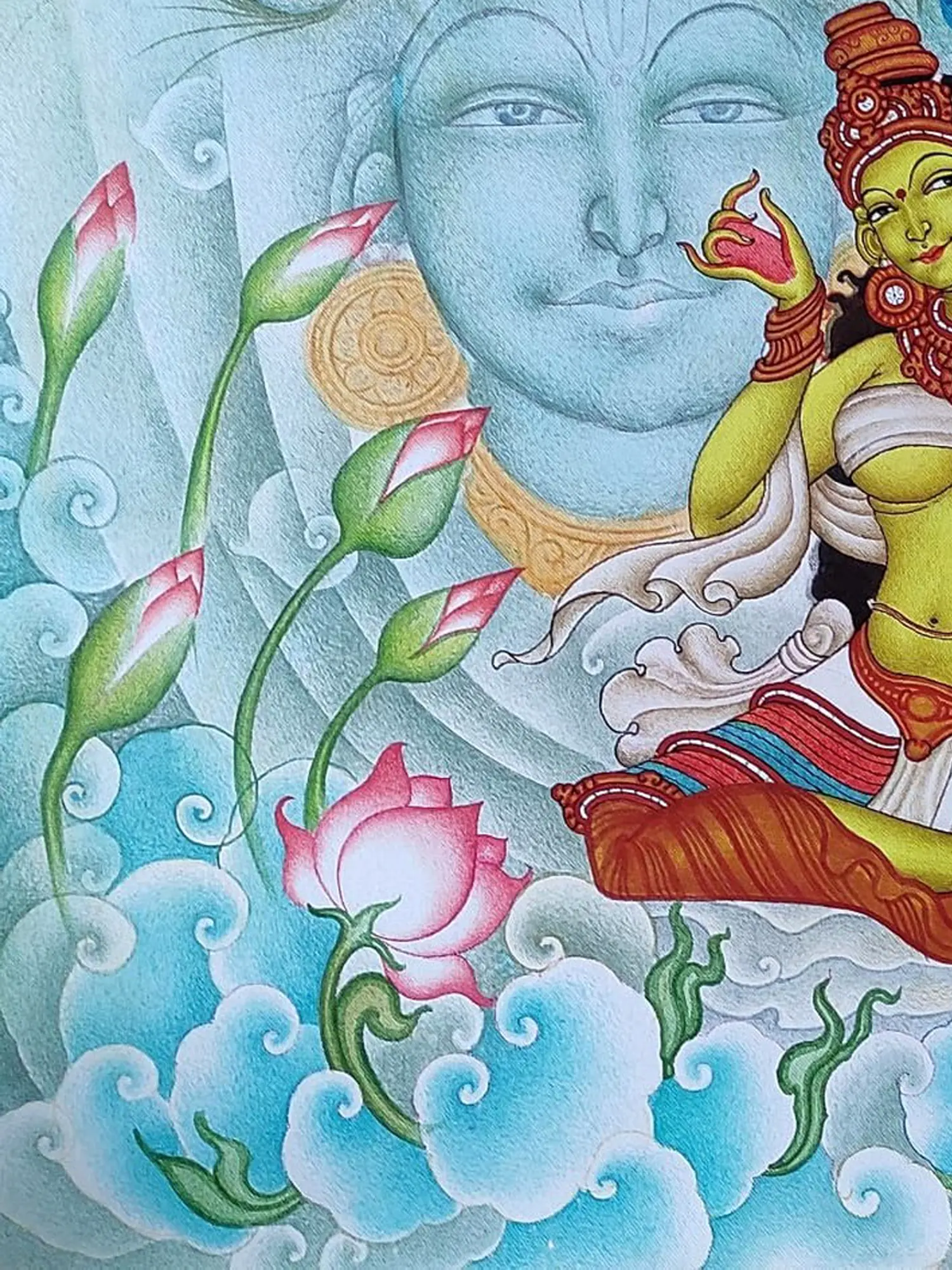 To ensure the enduring brilliance of this artwork, we recommend keeping it away from direct sunlight and moisture, preserving the vibrancy of the acrylics. A gentle dusting with a soft, dry cloth will maintain its pristine appearance. By adhering to these simple care instructions, you will safeguard a piece of art that promises to be a cherished heirloom, retaining its captivating beauty and spiritual resonance for generations to come.